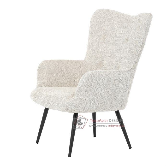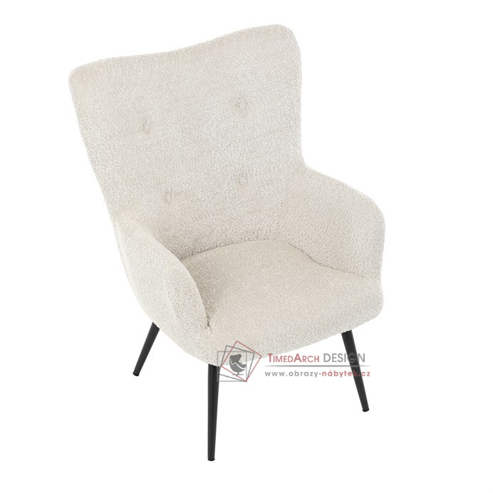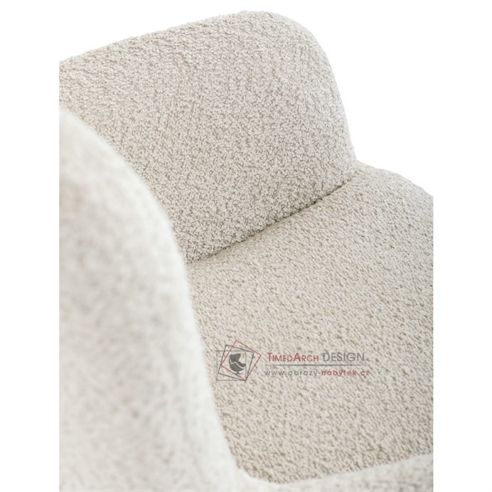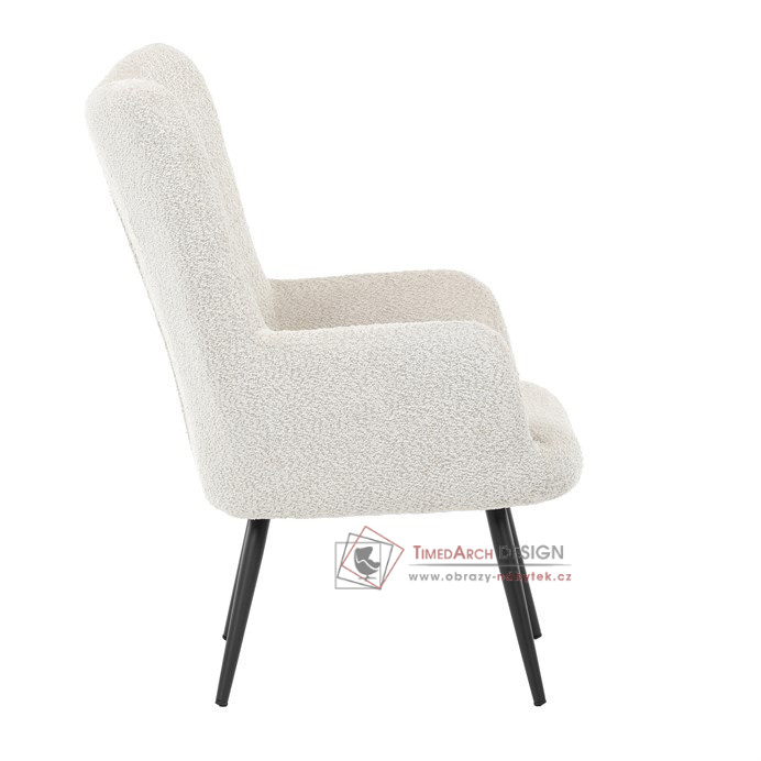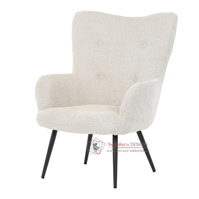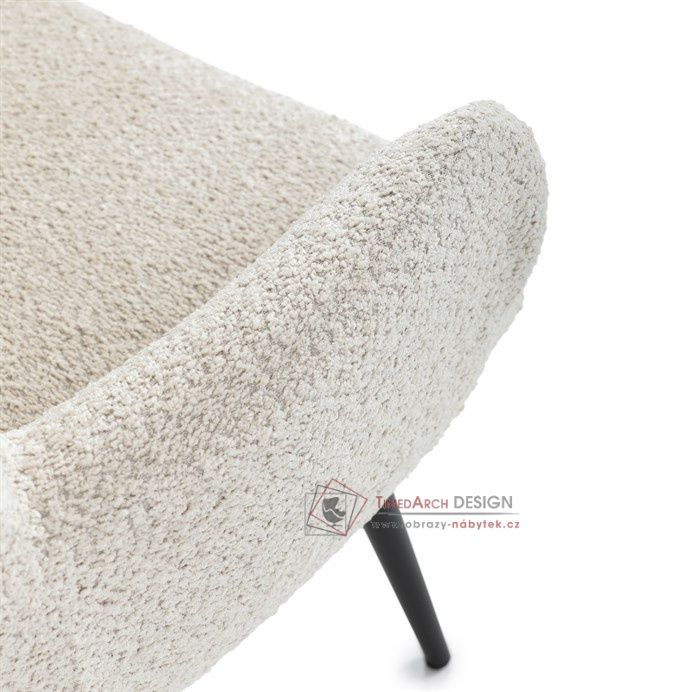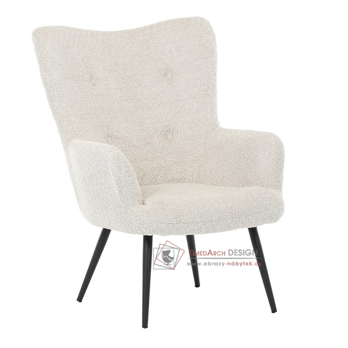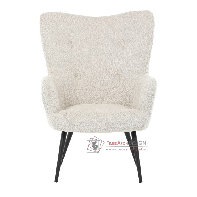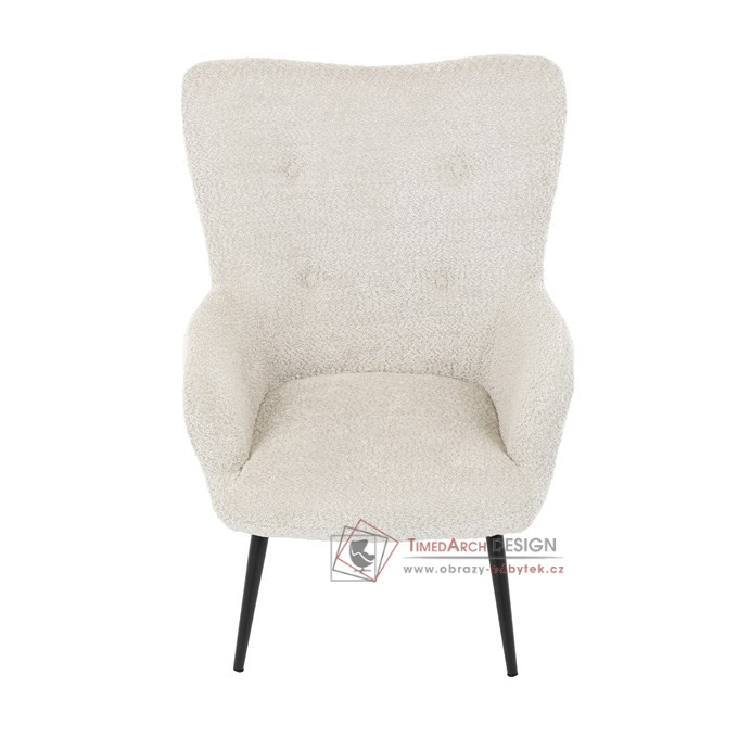 Béžové čalounění z látky Bouclé působí jemně a moderně, zatímco ergonomicky tvarované područky a opěradlo s jemnými knoflíky zajišťují maximální komfort. Stabilní kovové nohy s černým povrchem dodávají křeslu industriální nádech a zajišťují pevnost i při každodenním používání. Toto křeslo je ideální pro chvíle relaxace s knihou nebo při posezení s přáteli. Díky svému jednoduchému designu snadno zapadne do každého interiéru.