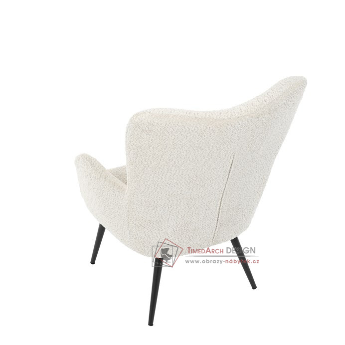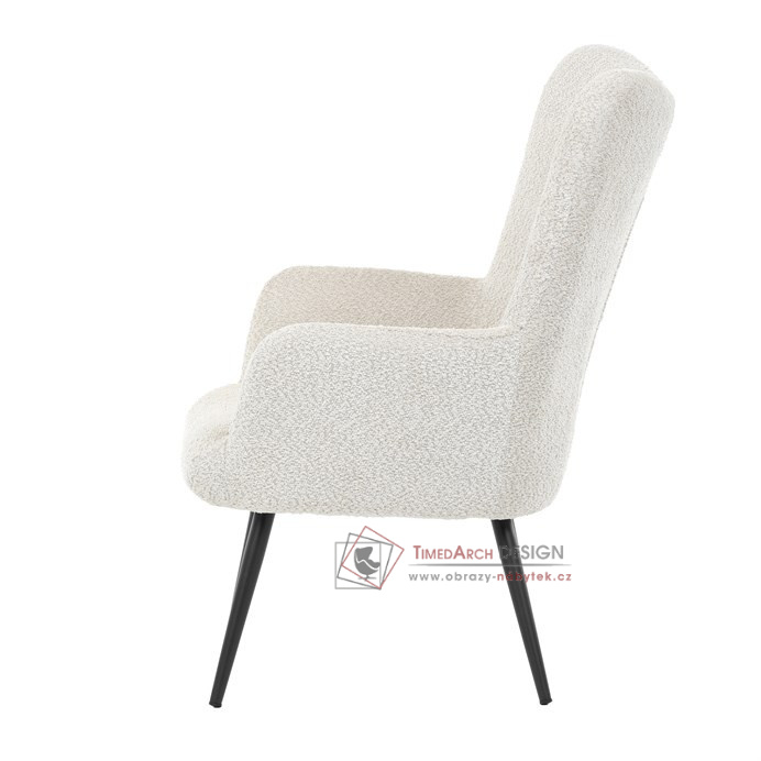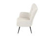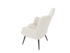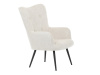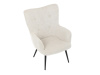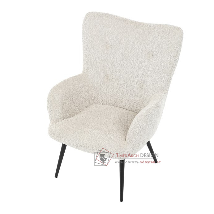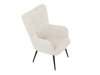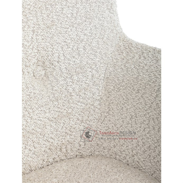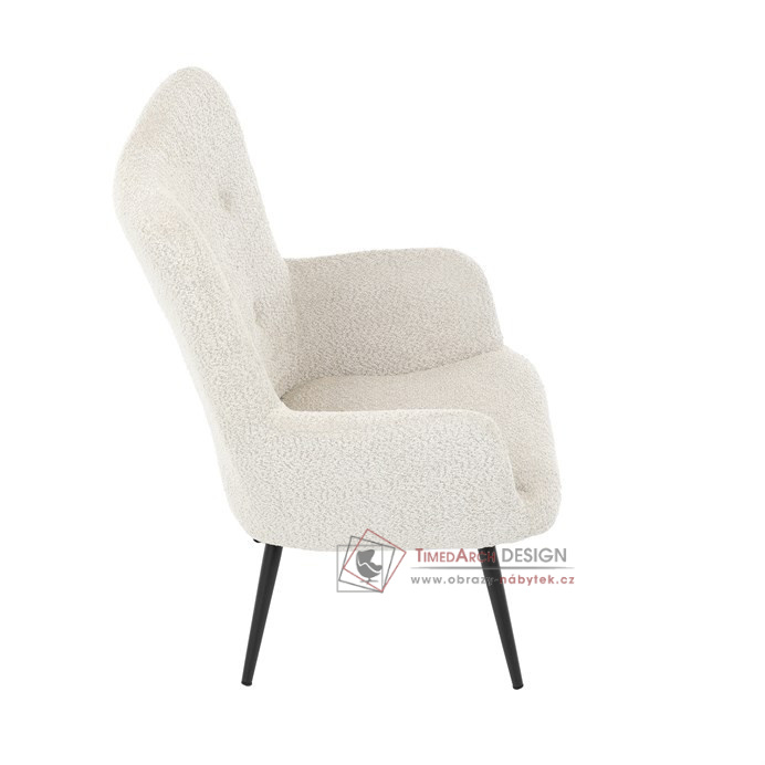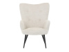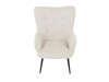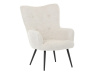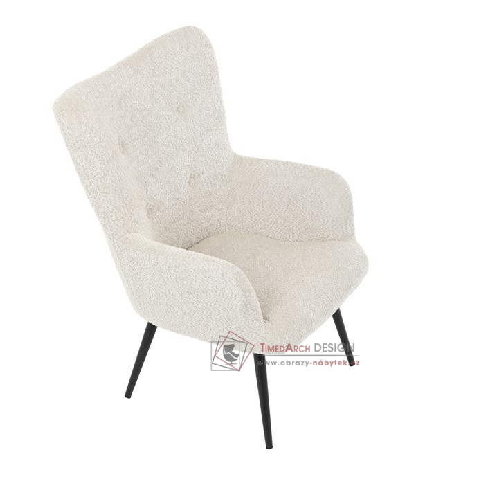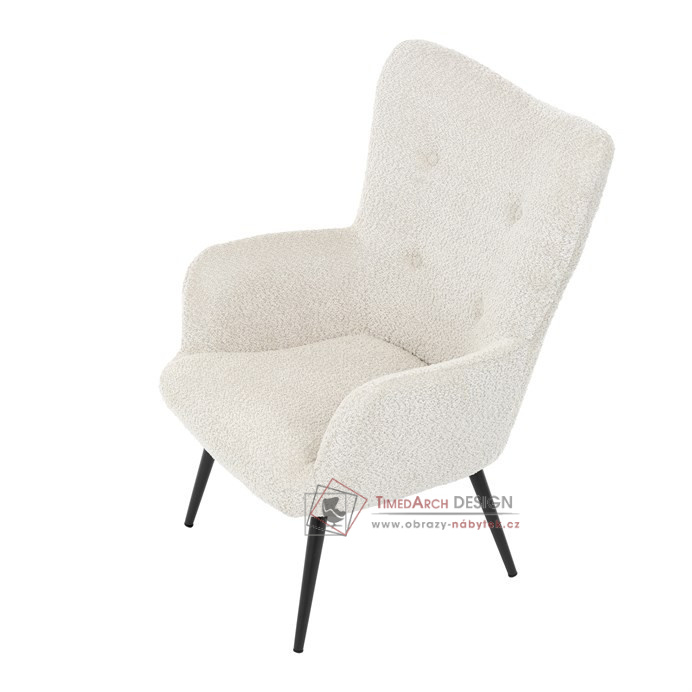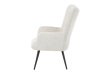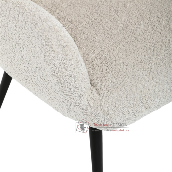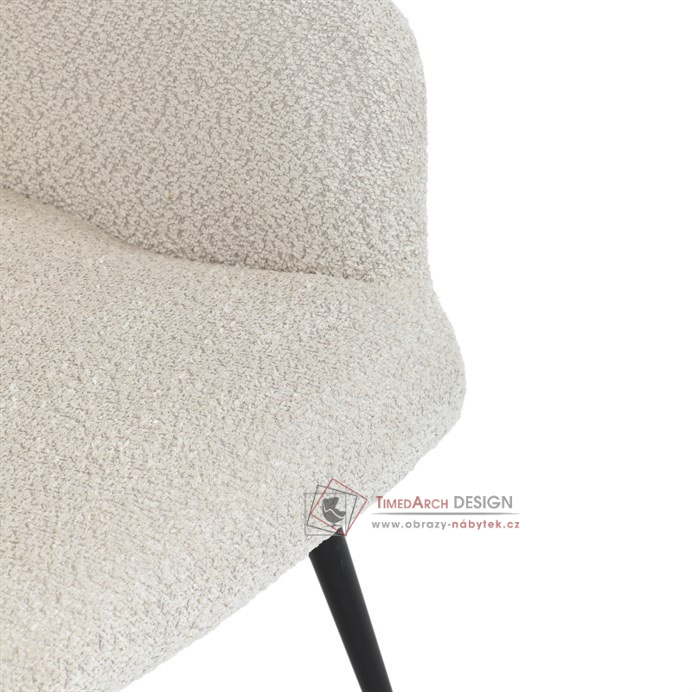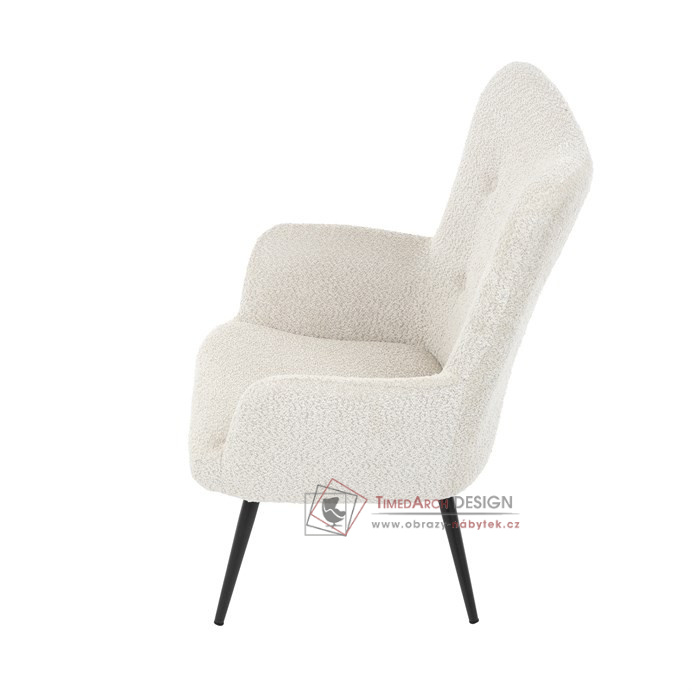 Béžové čalounění z látky Bouclé působí jemně a moderně, zatímco ergonomicky tvarované područky a opěradlo s jemnými knoflíky zajišťují maximální komfort. Stabilní kovové nohy s černým povrchem dodávají křeslu industriální nádech a zajišťují pevnost i při každodenním používání. Toto křeslo je ideální pro chvíle relaxace s knihou nebo při posezení s přáteli. Díky svému jednoduchému designu snadno zapadne do každého interiéru.