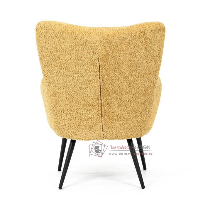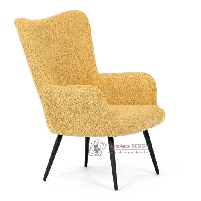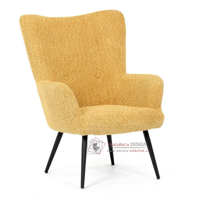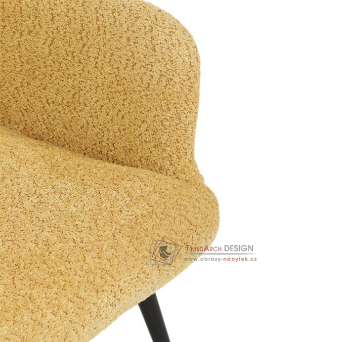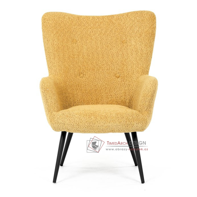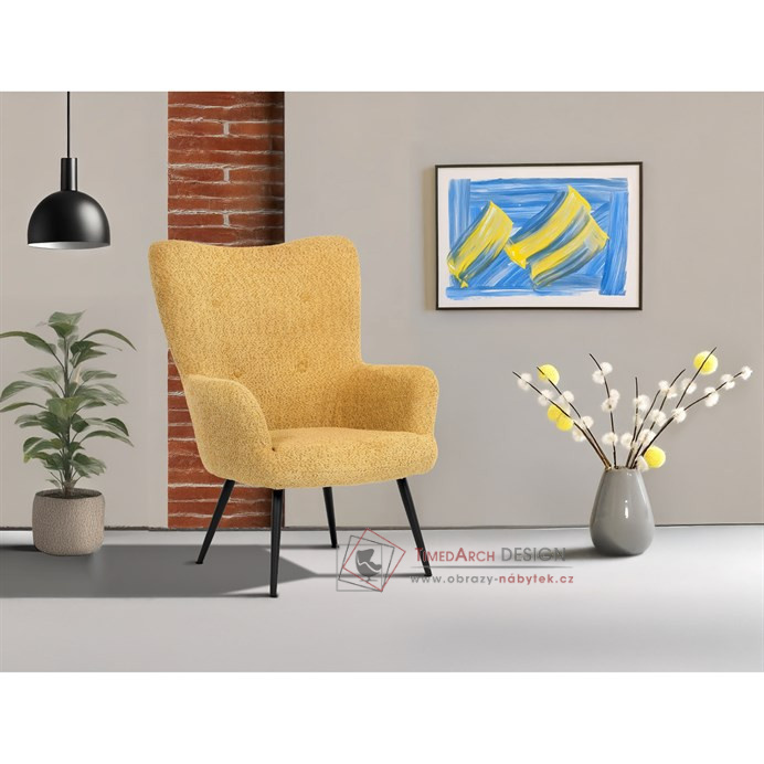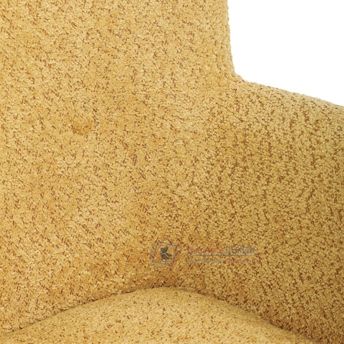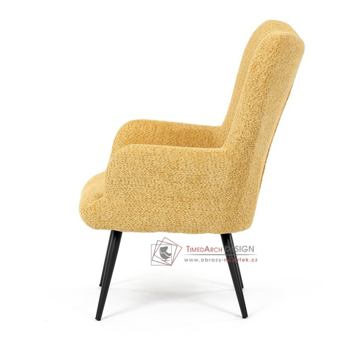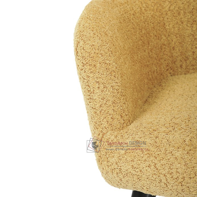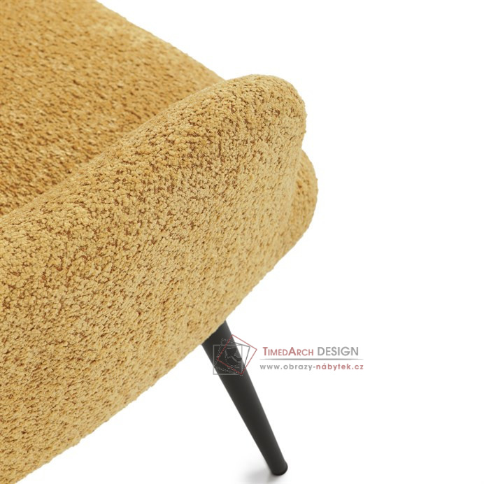 Žluté čalounění z látky Bouclé působí jemně a moderně, zatímco ergonomicky tvarované područky a opěradlo s jemnými knoflíky zajišťují maximální komfort. Stabilní kovové nohy s černým povrchem dodávají křeslu industriální nádech a zajišťují pevnost i při každodenním používání. Toto křeslo je ideální pro chvíle relaxace s knihou nebo při posezení s přáteli. Díky svému jednoduchému designu snadno zapadne do každého interiéru.