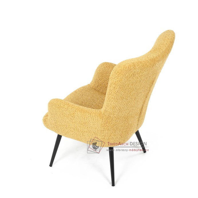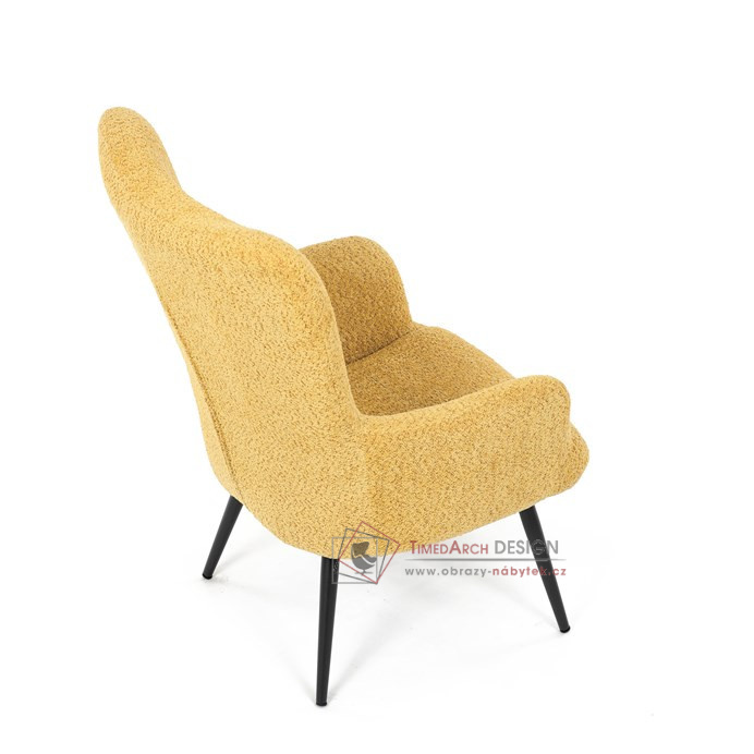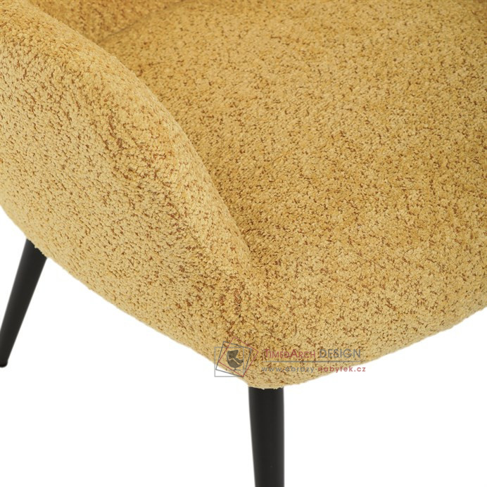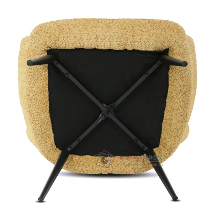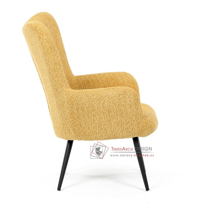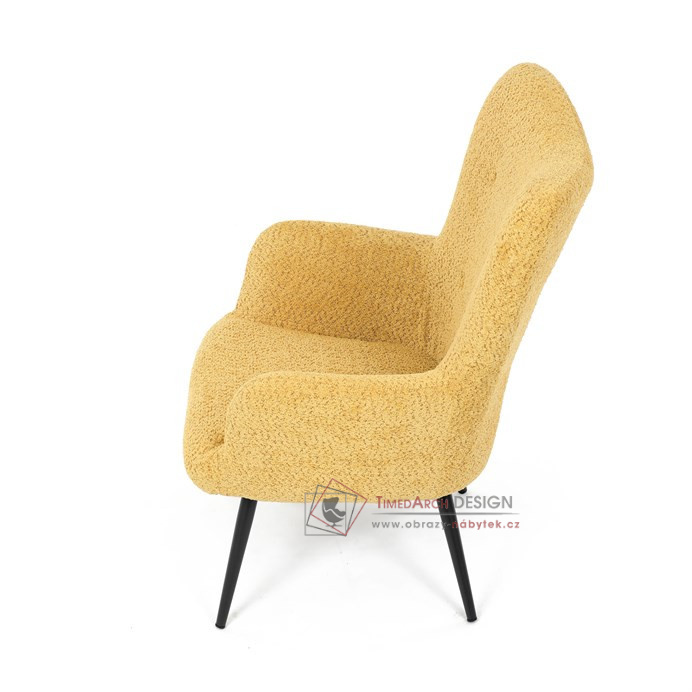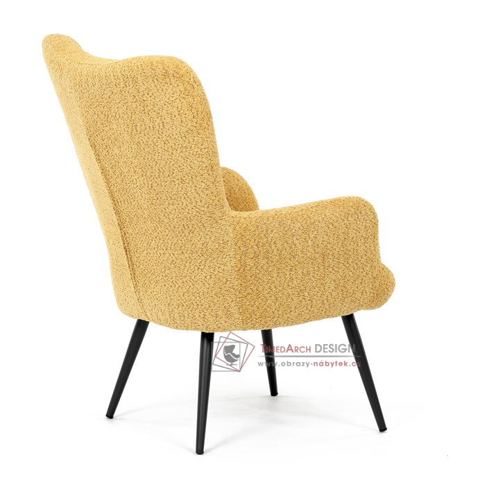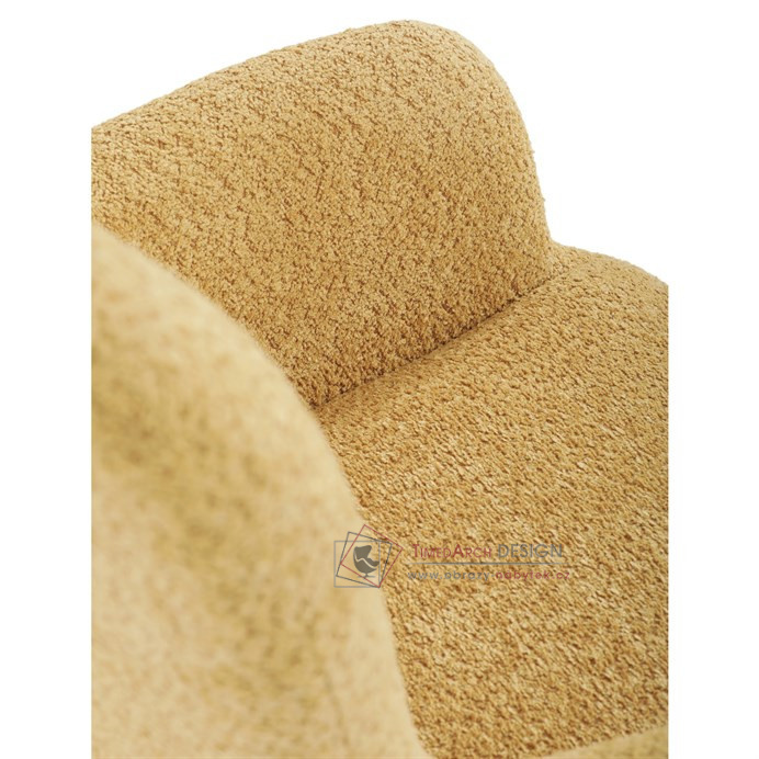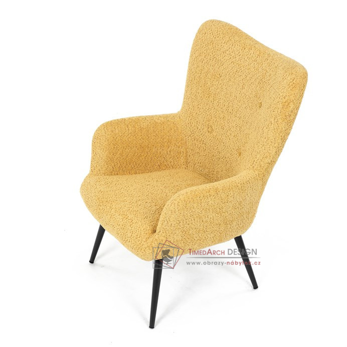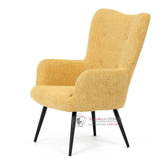 Žluté čalounění z látky Bouclé působí jemně a moderně, zatímco ergonomicky tvarované područky a opěradlo s jemnými knoflíky zajišťují maximální komfort. Stabilní kovové nohy s černým povrchem dodávají křeslu industriální nádech a zajišťují pevnost i při každodenním používání. Toto křeslo je ideální pro chvíle relaxace s knihou nebo při posezení s přáteli. Díky svému jednoduchému designu snadno zapadne do každého interiéru.
