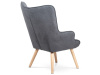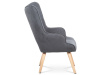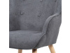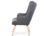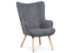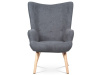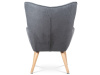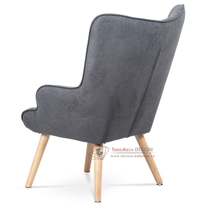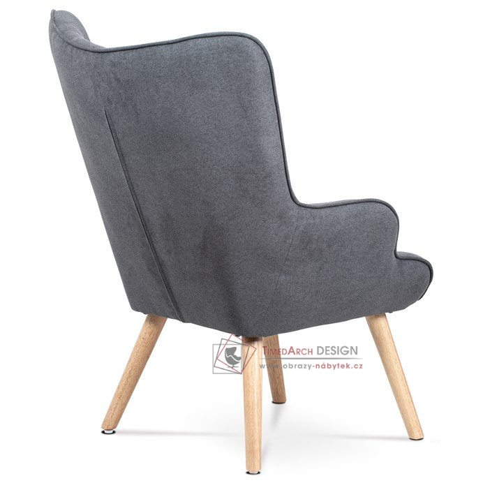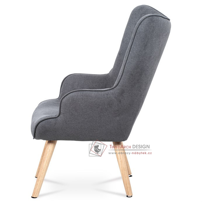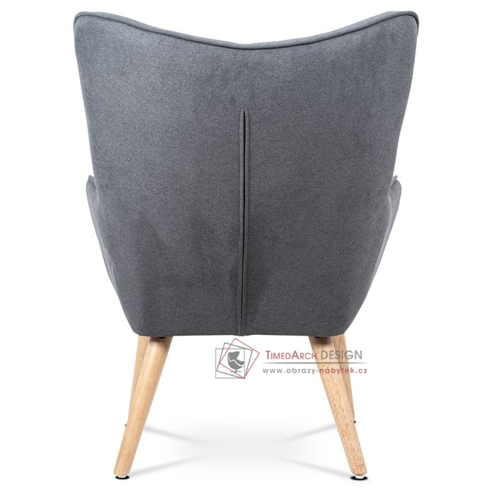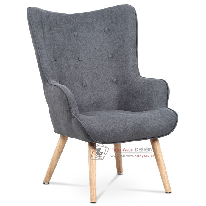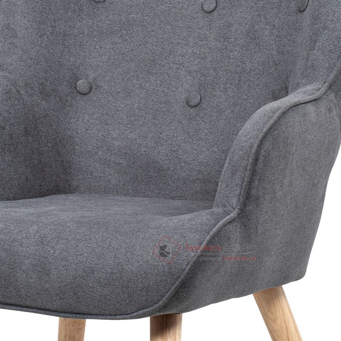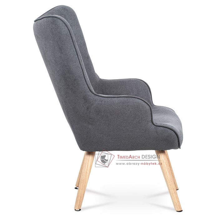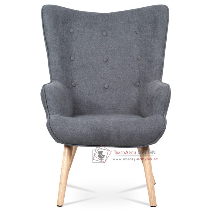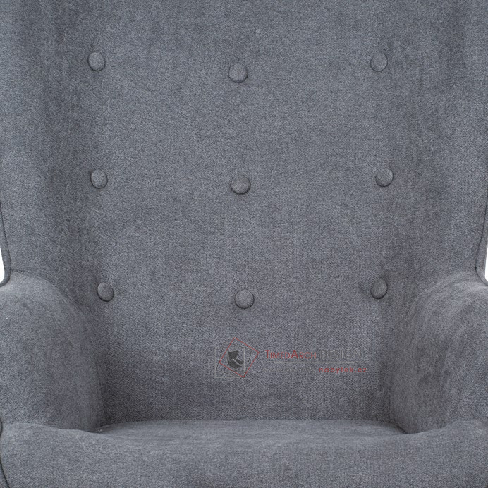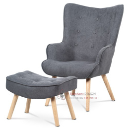 Vyniká vysokým prohnutým opěrákem, úzkými a krátkými područkami a dekorativními jemnými čalounickými vtahy zakončenými knoflíky na čelní straně opěráku. To vše vytváří charakteristické severské retro linie tohoto křesla. Nejen design, ale hlavně pohodlí které Vás obklopí při usednutí, bude příjemné zpestření při chvílích odpočinku a relaxace. A k jeho zvýšení výborně poslouží i čtyřnohá a polstrovaná podnožka na vyložení nohou, kterou ale můžete použít i jako příležitostný taburet. Potah je ze šedé látky, kostra z masivního dřeva a výplň z kvalitní PU pěny. V místě sedáku jsou pro zkvalitnění sezení elastické popruhy. Dlouhé kónické dřevěné nohy jsou z masivního kaučukovníku v přírodním odstínu a lakované transparentním lakem. Aby bylo eliminováno poškození podlahové krytiny, jsou opatřeny plastovými kluzáky. U zadních nohou rektifikovatelnými. Světlá výška křesla je 32 cm, výška područek je 58 cm a šíře 6 cm. Nosnost křesla je 130 kg, taburetu do 80 kg.