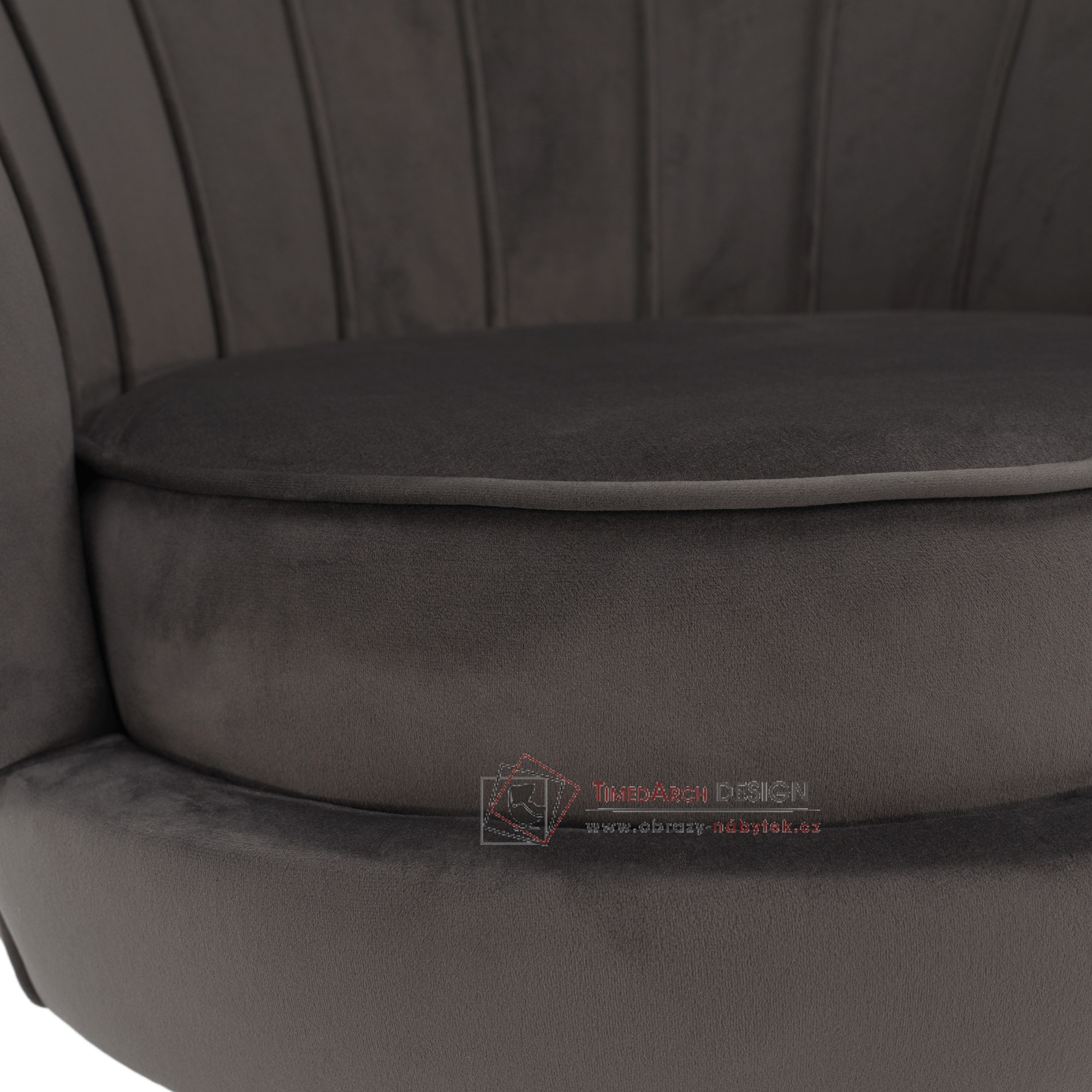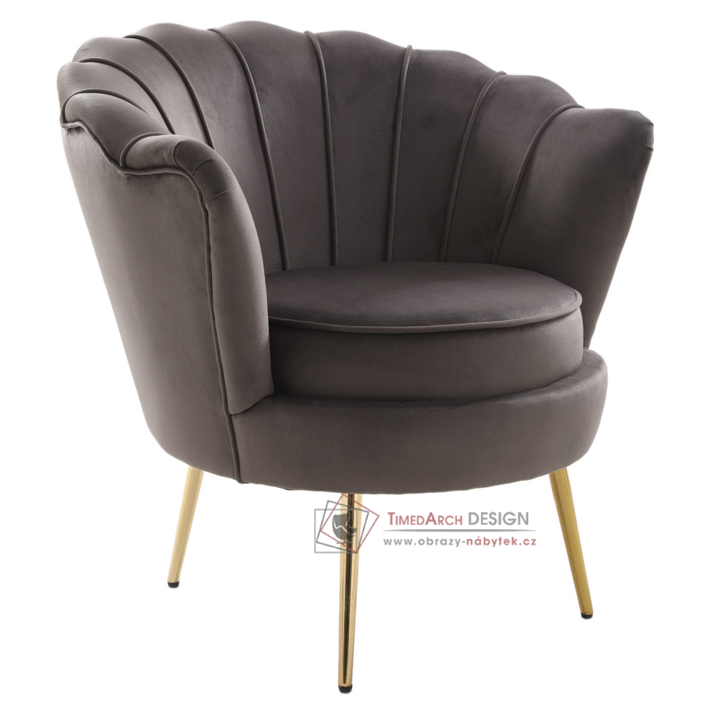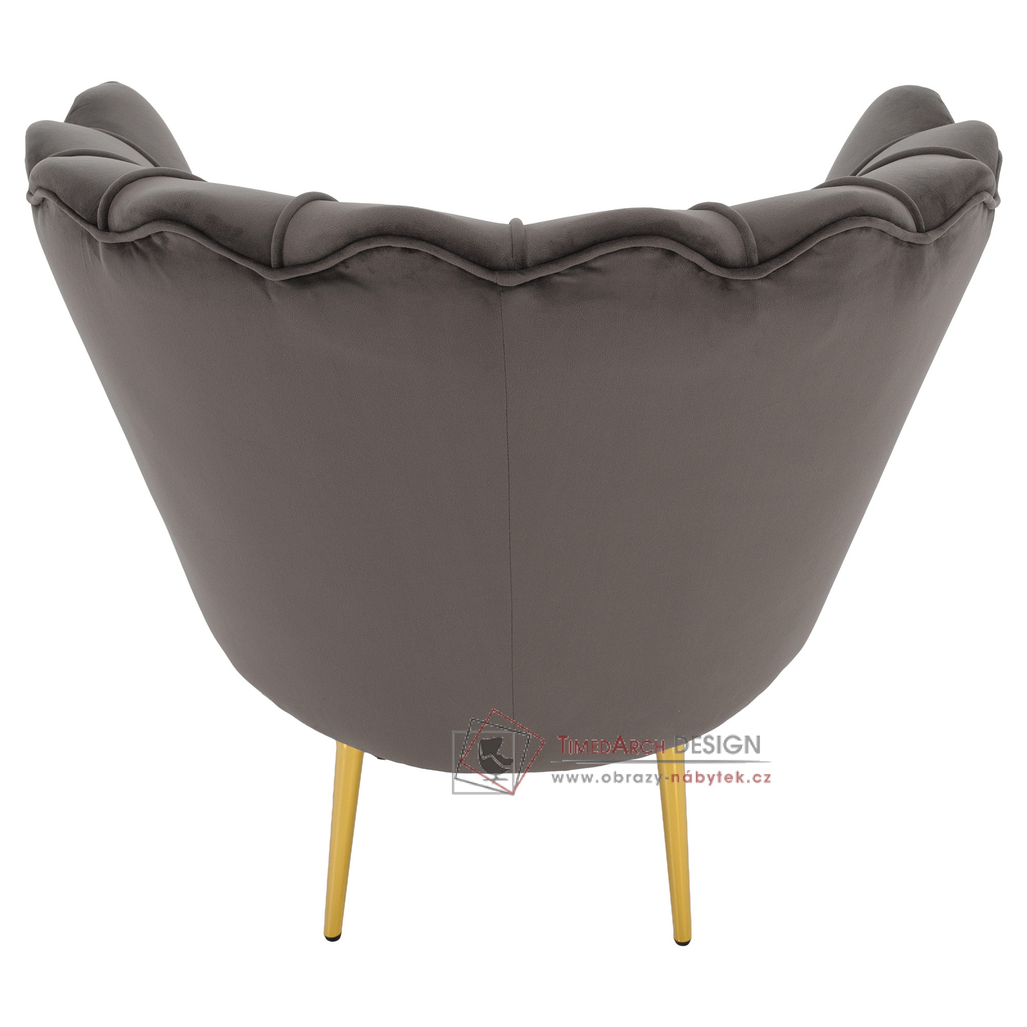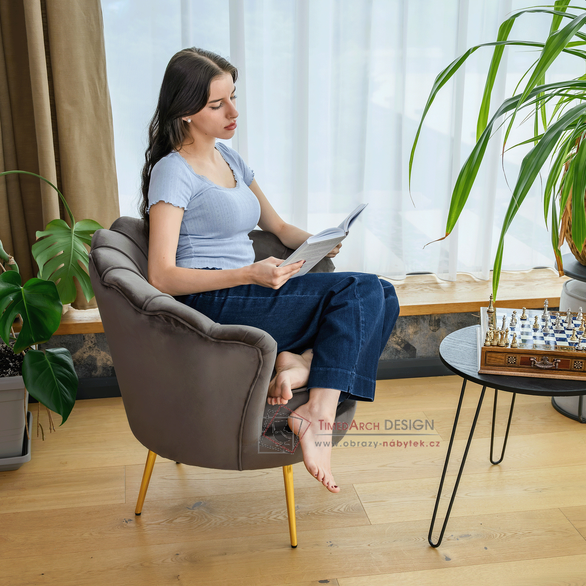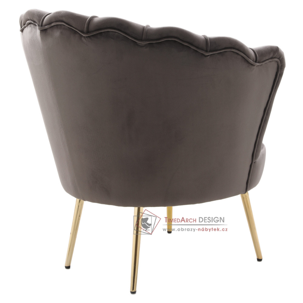 Zaujme na první pohled díky šedohnědé Velvet látce v kombinaci s kovovými nohama v provedení gold chrom zlatá. Křeslo v sobě nese ducha glamour a Art-deco stylu. Dekorativní prošívané opěradlo a pohodlné kulaté sedátko zaručují komfort i vizuální požitek. Štíhlé nožičky nejen opticky odlehčují celkový vzhled, ale zajišťují také potřebnou stabilitu. NOBLEO vynikne nejen v obývacím pokoji, ložnici či stylové jídelně, ale je ideální i do kanceláře, jednací místnosti, vstupní haly či lounge zóny. Skvěle doplní interiér a stane se důstojným reprezentantem.