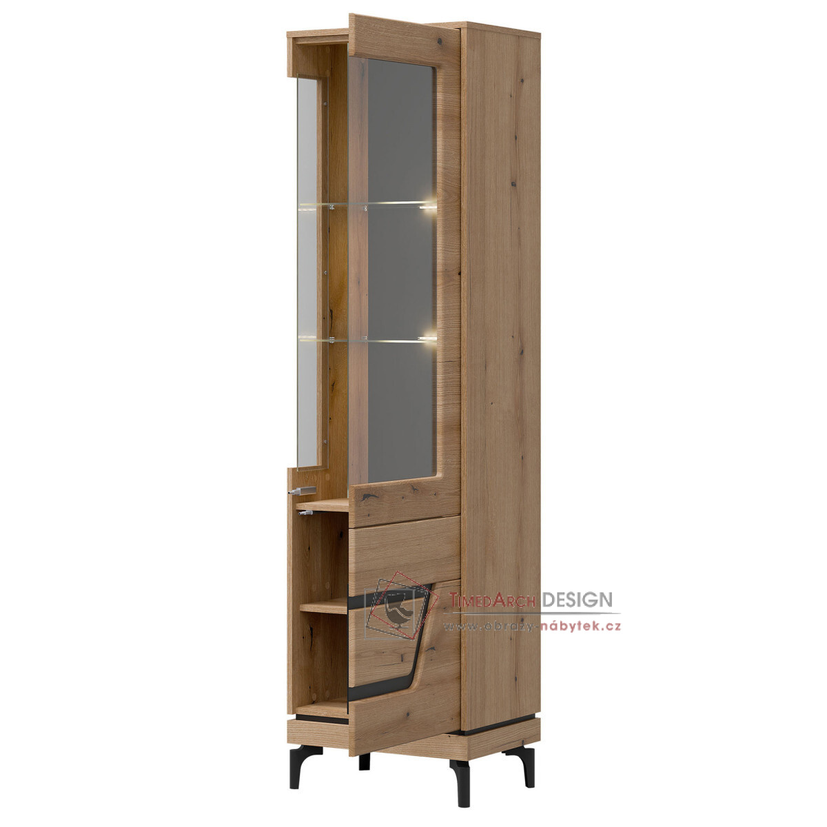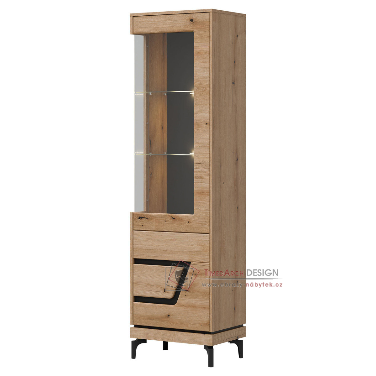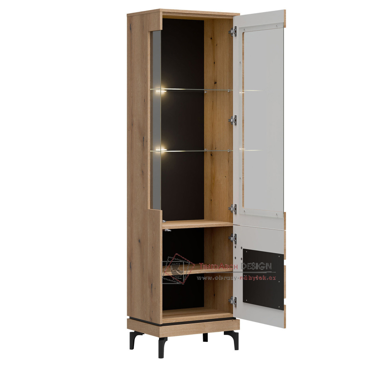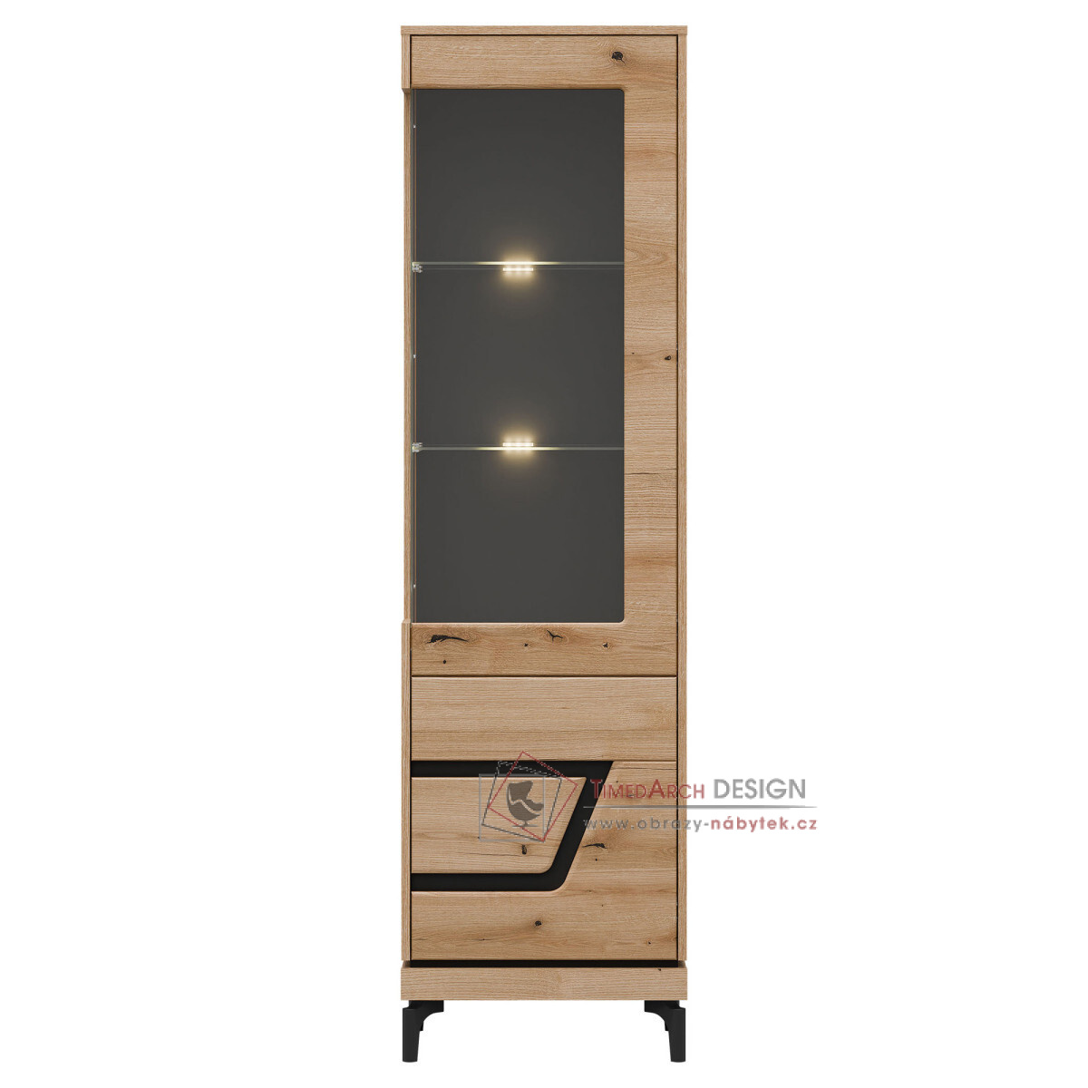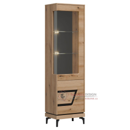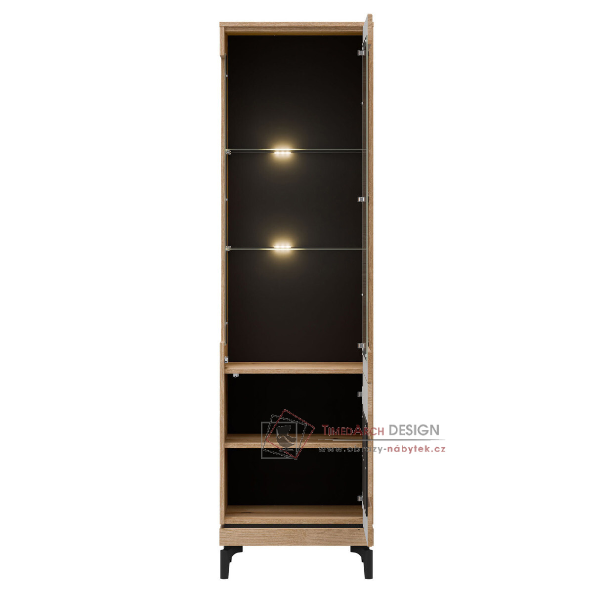 Vitrína série Kris, model KS05, v provedení dub evoke / černá, kombinuje moderní design s funkčností. Je to jedinečný doplněk vašeho obývacího pokoje, který dodá eleganci a styl. Skleněné dveře jsou ideální pro vystavení sbírky knih, skla nebo dekorativních předmětů. Četné police vám umožní uložit různé drobné předměty a zároveň si udržet pořádek. Další výhodou této vitríny je LED podsvícení, které jemně osvětluje uložené předměty a dodává místnosti vizuální působivost a atmosféru.