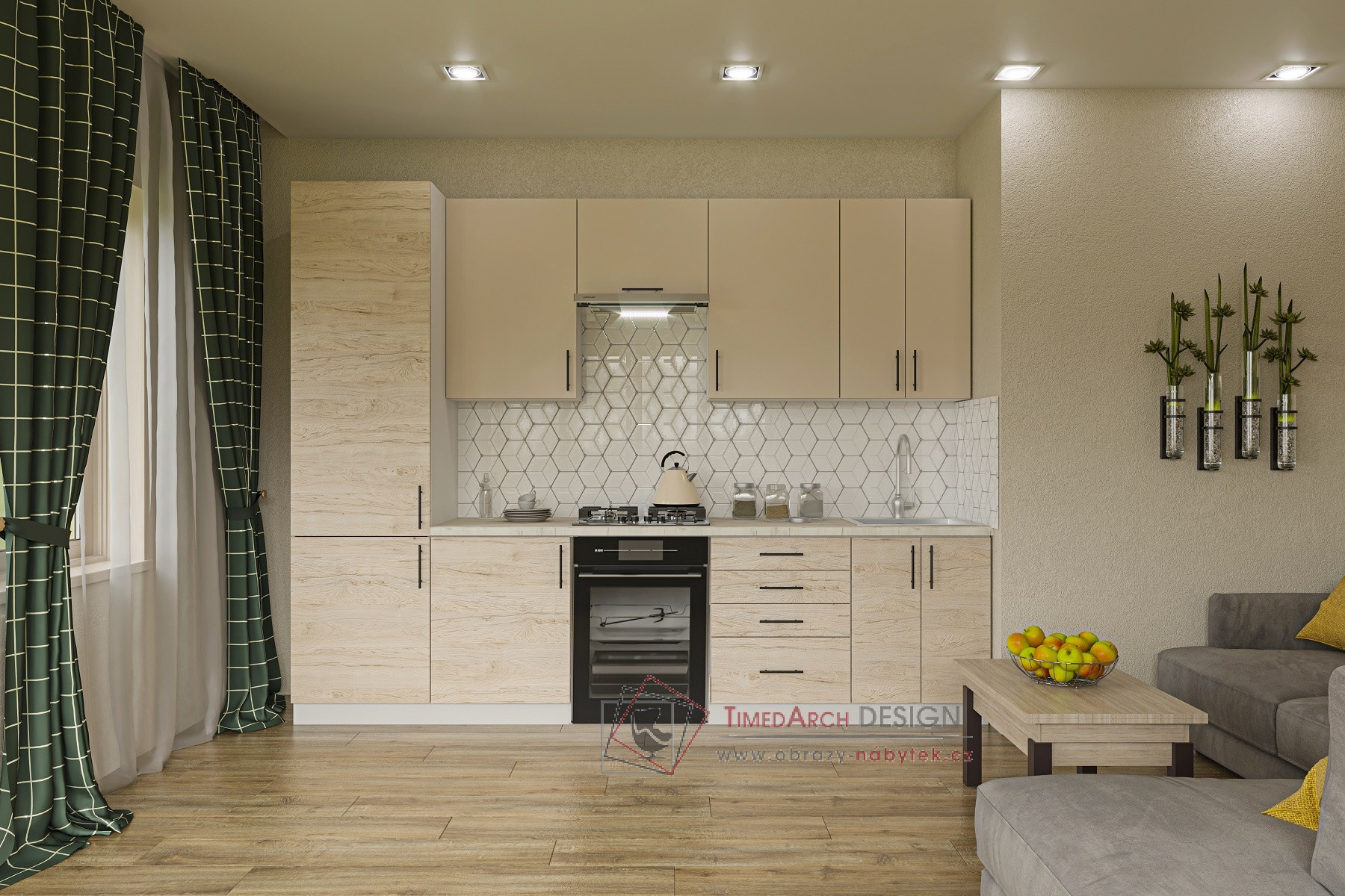 Dřez, pracovní deska, sokl, stejně tak i spotřebiče nejsou součástí kuchyňské linky.