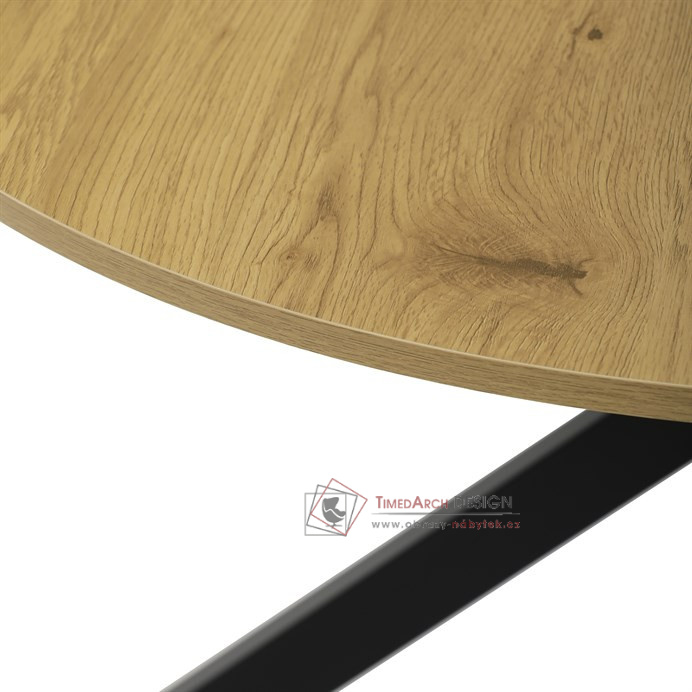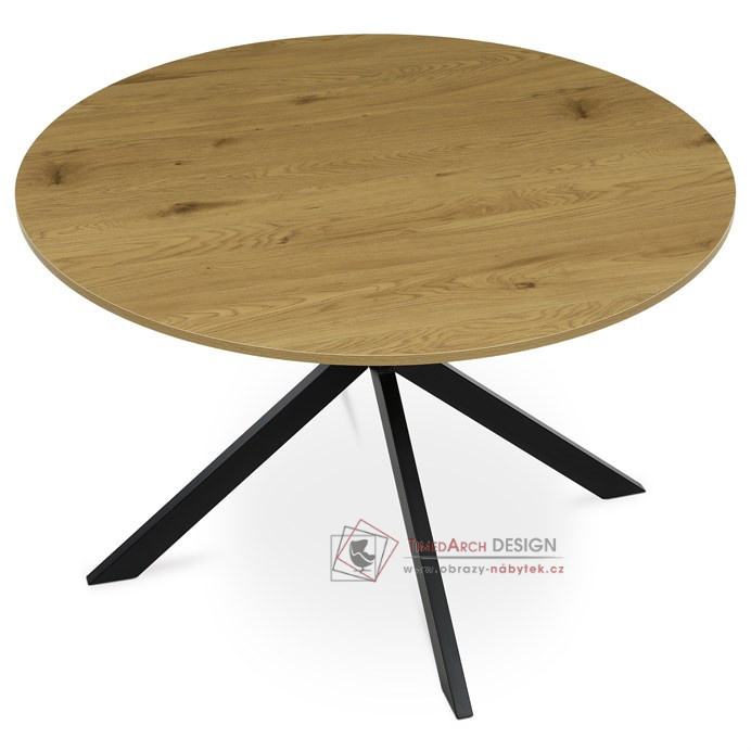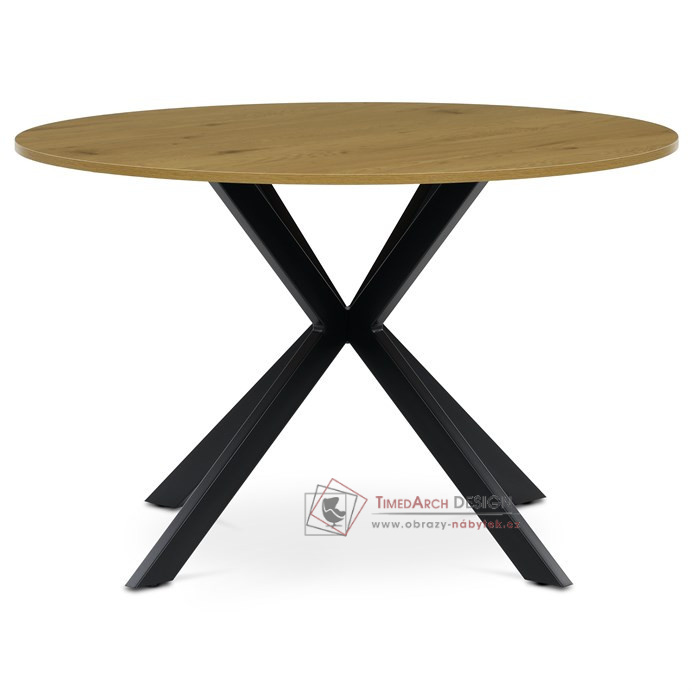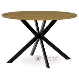 Jídelní kulatý stůl HT-F4120 OAK vyniká kombinací přírodního dekoru divokého dubu a robustní konstrukce s černými kovovými nohami.