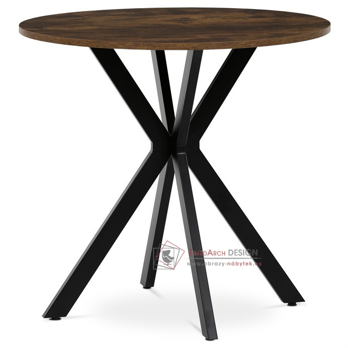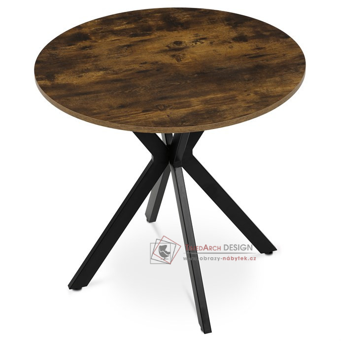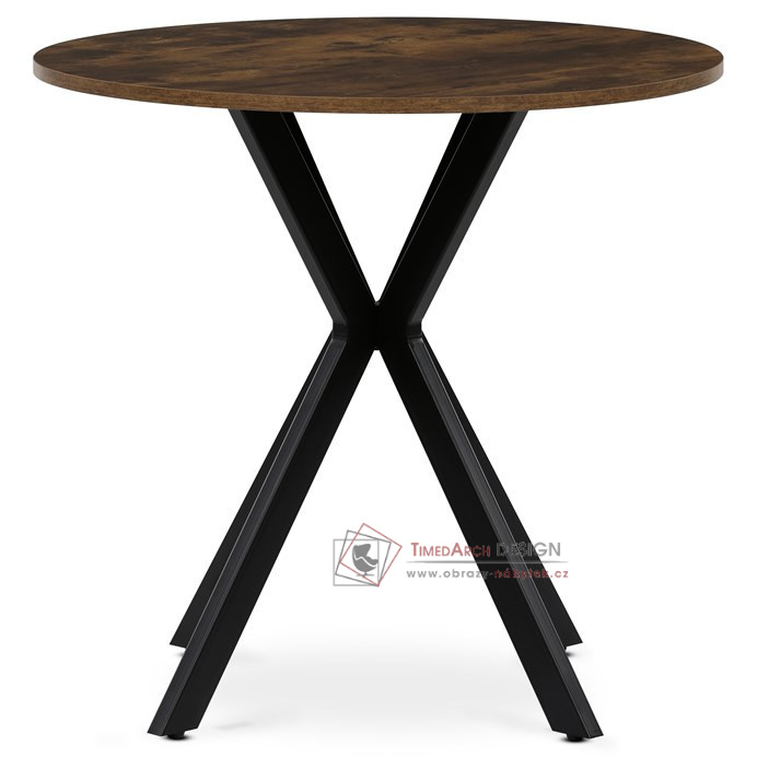 Deska o průměru 80 cm a výšce 75 cm je opatřena ABS hranou, která chrání okraje před poškozením a zvyšuje odolnost proti opotřebení. Kovová podnož je tvořena čtyřmi zkříženými nohami, které zajišťují stabilitu a zároveň dodávají moderní industriální vzhled. Rektifikační nohy umožňují vyrovnání stolu na nerovném povrchu, což přispívá k jeho praktičnosti a komfortu při používání. Povrch desky s dekorem old wood přináší autentický přírodní vzhled, který se hodí do různých interiérů od rustikálních po moderní. Celková konstrukce stolu je navržena tak, aby poskytovala dostatek prostoru pro pohodlné stolování a zároveň byla snadno udržovatelná. Stůl je ideální volbou pro menší jídelny či kuchyňské kouty, kde oceníte kombinaci estetické hodnoty a funkčnosti.