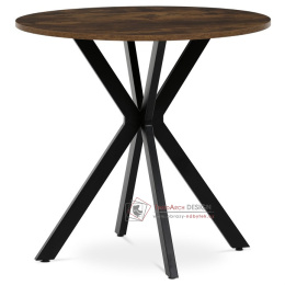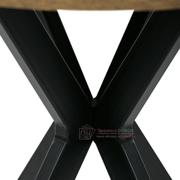 Jídelní kulatý stůl HT-F4108 OLW vyniká kombinací přírodní MDF desky s dekorem starého dřeva a pevné konstrukce z černě lakovaného kovu.