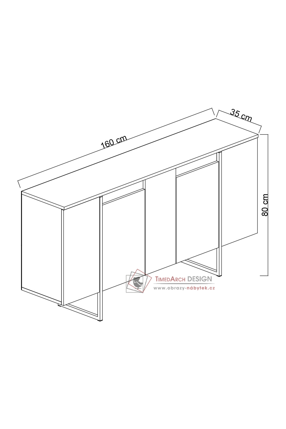 S šířkou 160 cm, hloubkou 35 cm a výškou 80 cm je tato komoda navržena tak, aby se bez problémů hodila do jakéhokoli prostoru. Ať už ji umístíte do obývacího pokoje, chodby nebo ložnice, bez námahy vylepší atmosféru a vytvoří ústřední bod, který vyzařuje eleganci.
