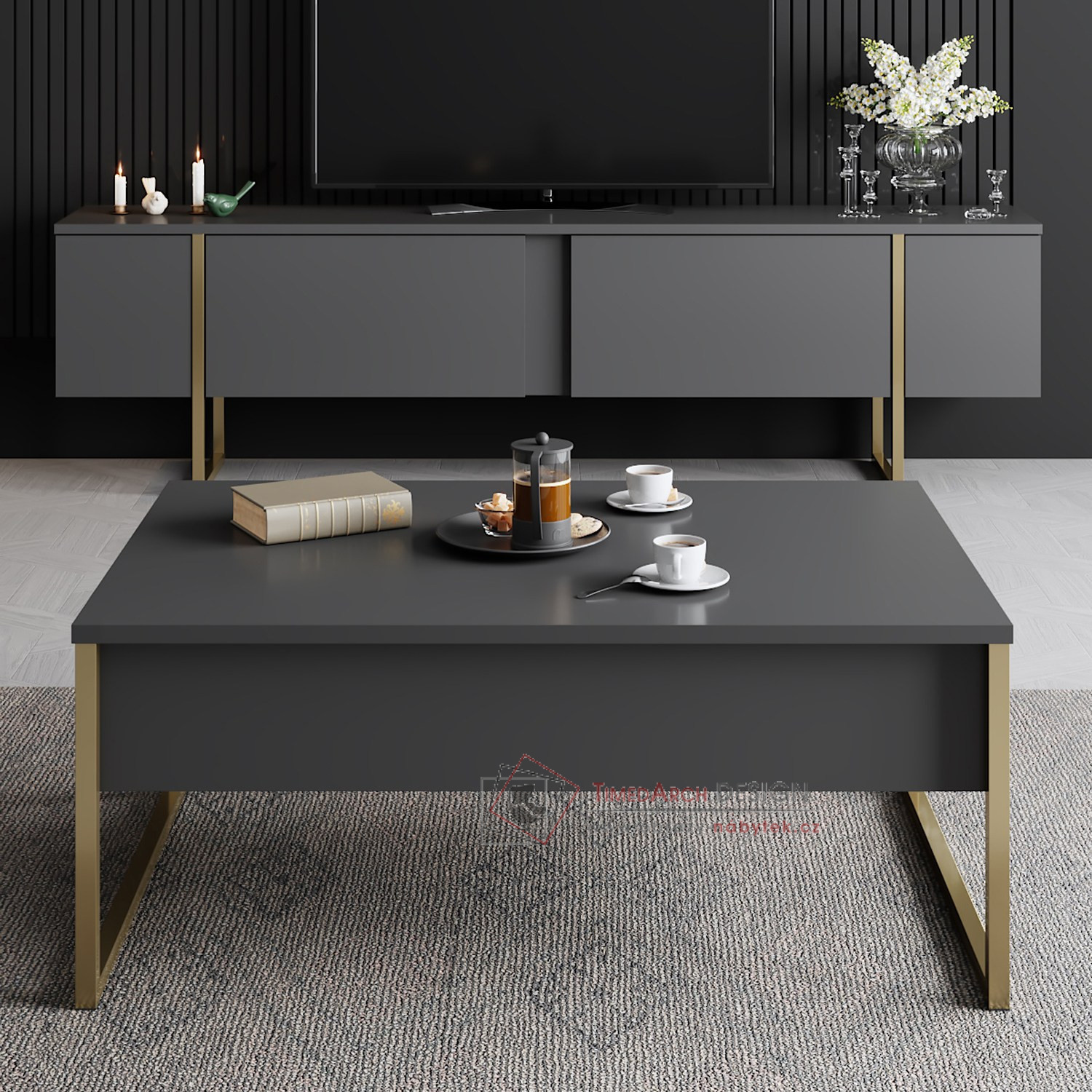 TV stolek se vyznačuje výraznou kombinací šedé a zlaté barvy, která dodá vašemu obývacímu pokoji moderní nádech. Jeho elegantní a minimalistický design se bez námahy hodí do jakéhokoli interiéru a stane se tak všestranným doplňkem vaší domácnosti.