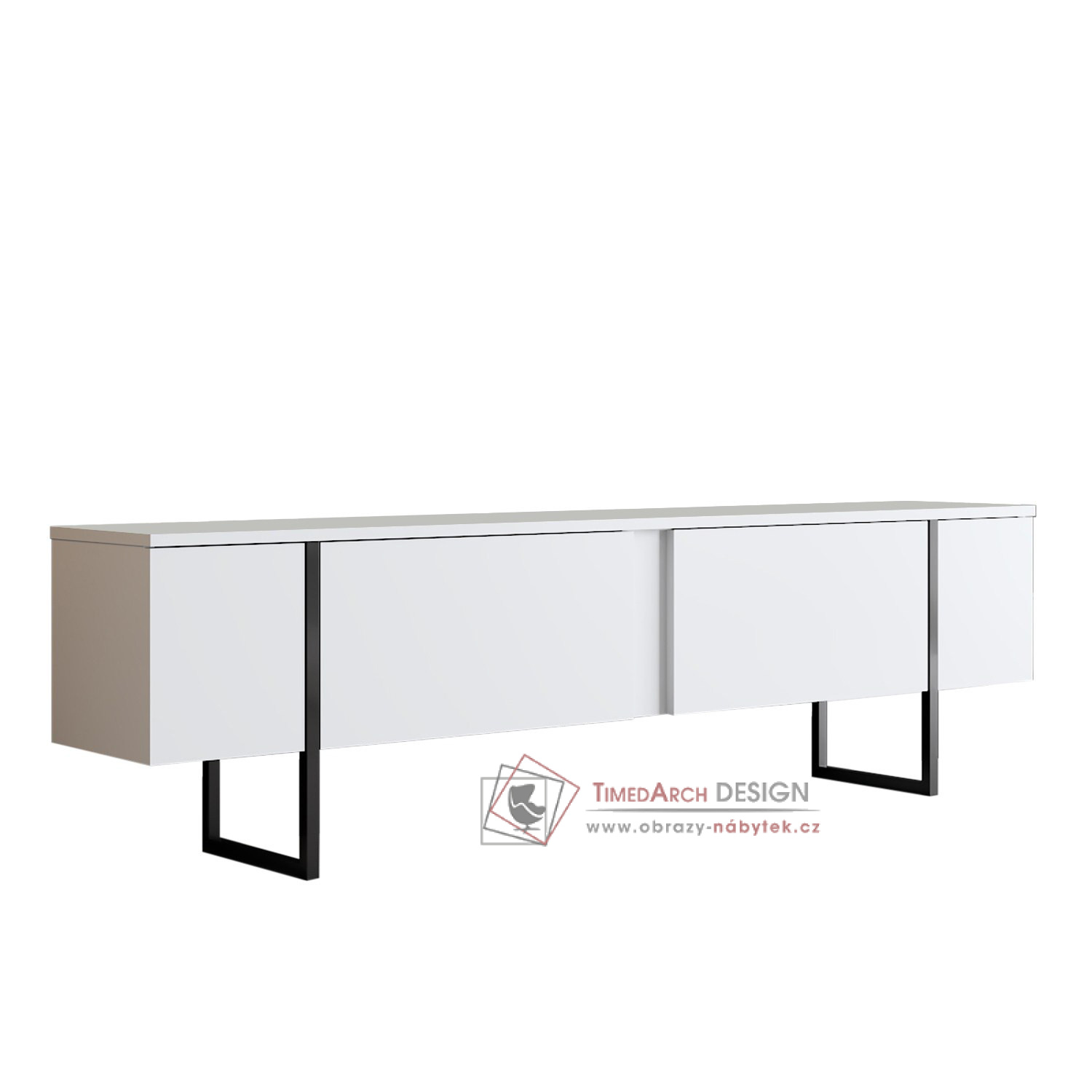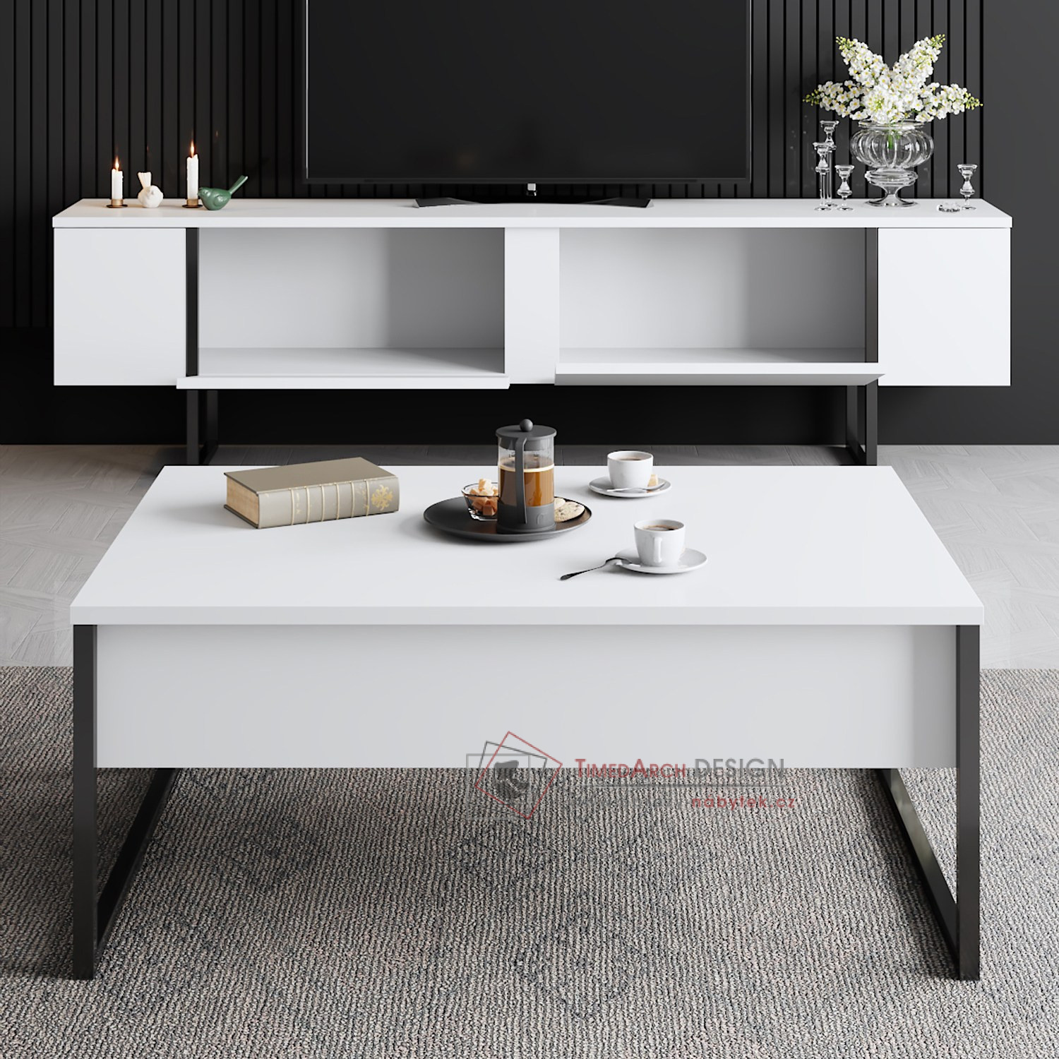 TV stolek se vyznačuje výraznou kombinací bílé a černé barvy, která dodá vašemu obývacímu pokoji moderní nádech. Jeho elegantní a minimalistický design se bez námahy hodí do jakéhokoli interiéru a stane se tak všestranným doplňkem vaší domácnosti.