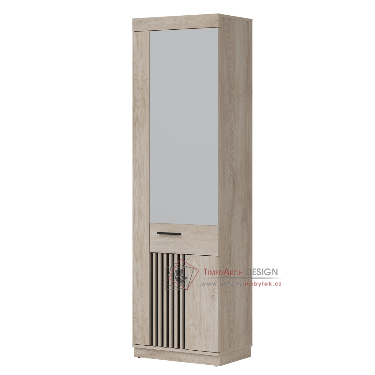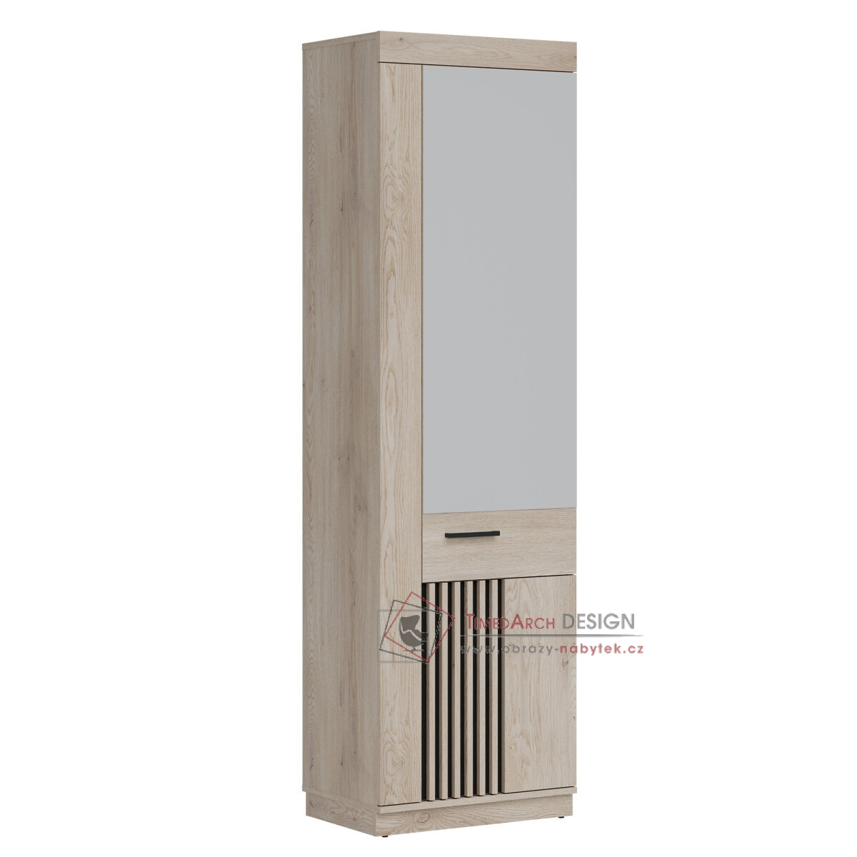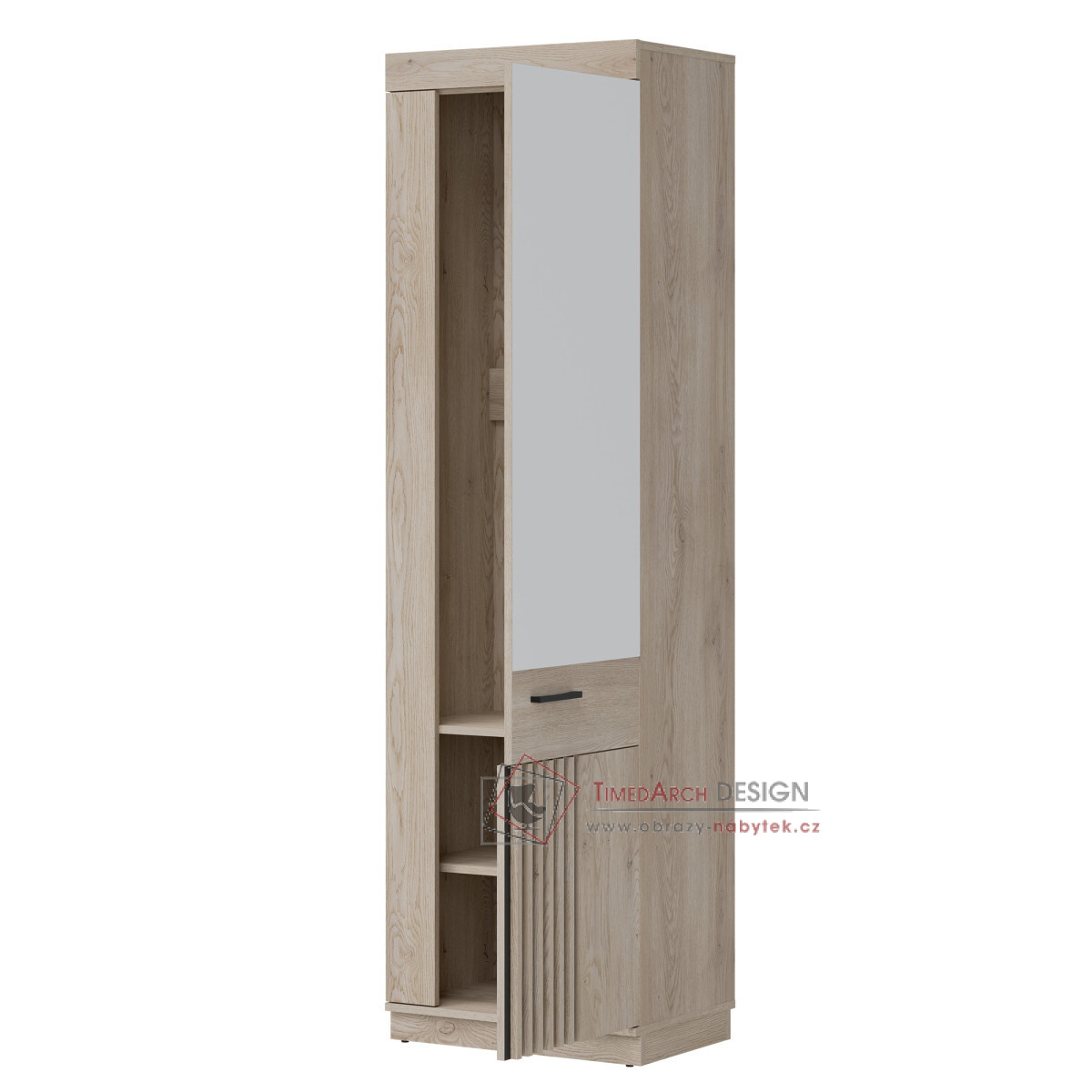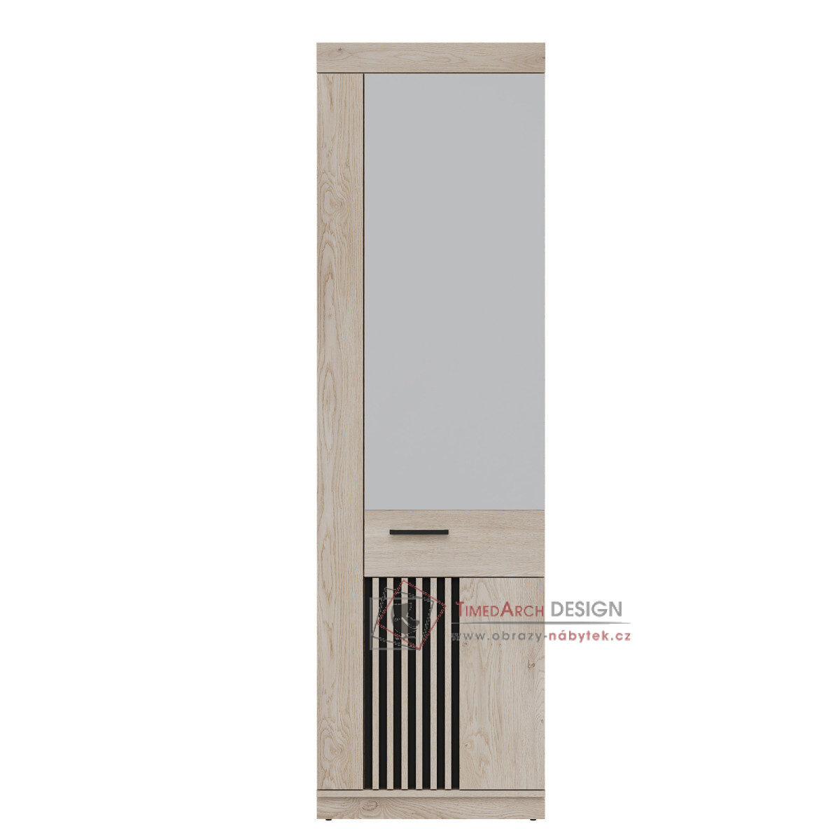 Šatní skříň Mati MI14 je dokonalou kombinací moderního designu a funkčnosti. Je vyrobena z vysoce kvalitní nábytkové desky a kombinuje elegantní odstín dubu Cremona Cotta s černými akcenty, což interiéru dodává stylový charakter. Zrcadlová přední část slouží nejen praktickému účelu, ale také opticky zvětšuje prostor a dodává mu jas a hloubku. Šatní skříň nabízí prostorný interiér s policemi a závěsnou tyčí, což umožňuje pohodlné a organizované úložné prostory. Díky své odolnosti a estetice je šatní skříň Mati MI14 vynikající volbou pro moderní interiéry.