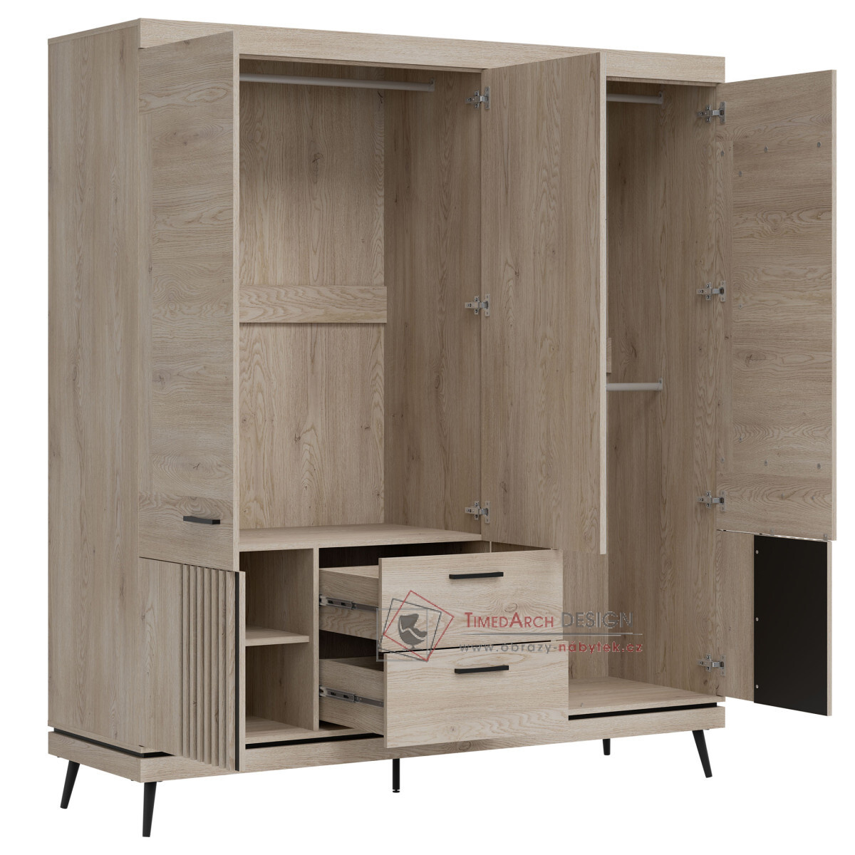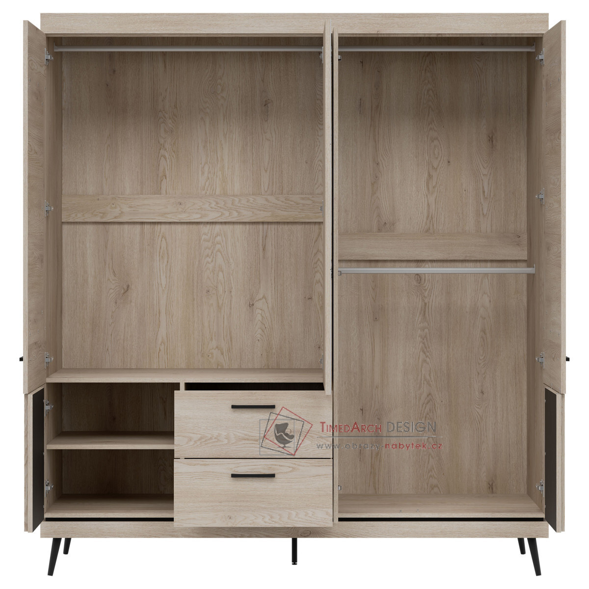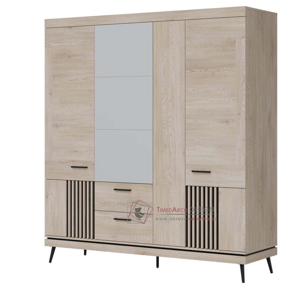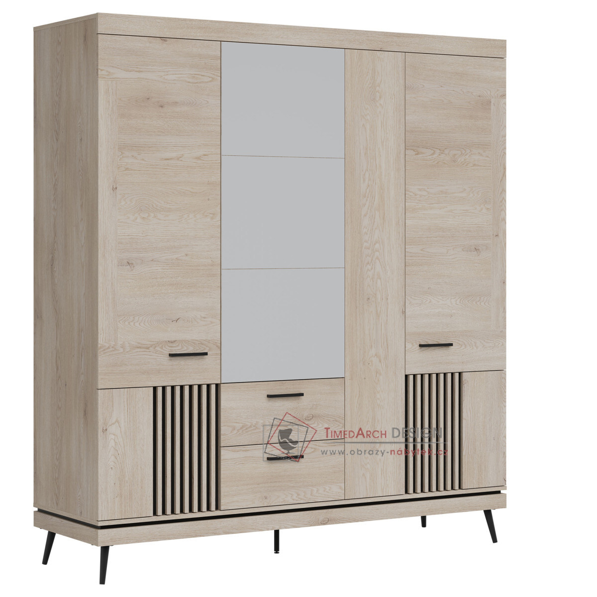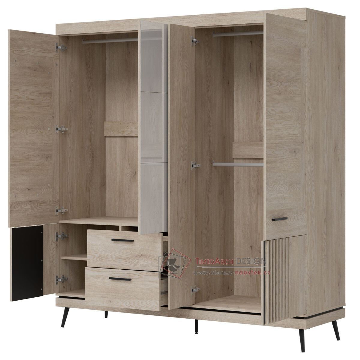 Skříň Mati MI16 v sobě spojuje eleganci, funkčnost a moderní design. Je vyrobena z masivní nábytkové desky a pyšní se stylovou povrchovou úpravou v odstínech dubu Cremona Cotta a černé. Zrcadlo na čele skříně slouží nejen praktickému účelu, ale také opticky zvětšuje prostor a dodává interiéru hloubku a jas. Skříň Mati MI16 je vybavena dvěma praktickými šatními tyčemi pro pohodlné uložení oblečení a dvěma prostornými zásuvkami, ideálními pro uložení doplňků a dalších drobných předmětů. Díky promyšlenému uspořádání a estetickému provedení je skříň Mati MI16 vynikající volbou do každého moderního interiéru.