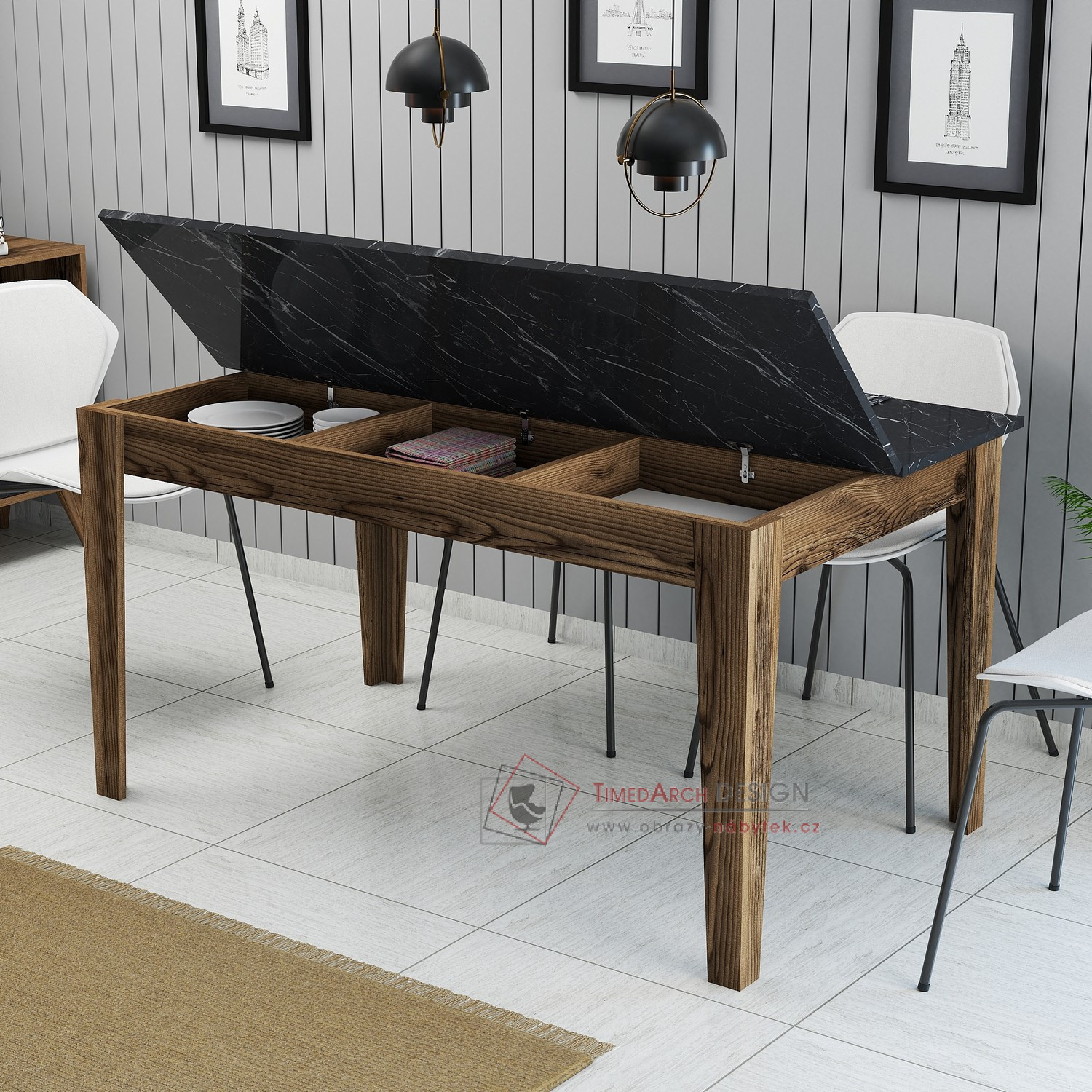 Pozdvihněte svůj kulinářský zážitek s naším vynikajícím jídelním stolem, který bezproblémově kombinuje styl a praktičnost. Tento stůl, vyrobený s maximální precizností, je navržen tak, aby vylepšil estetiku vašeho jídelního prostoru a zároveň poskytl dostatek úložných prostor.