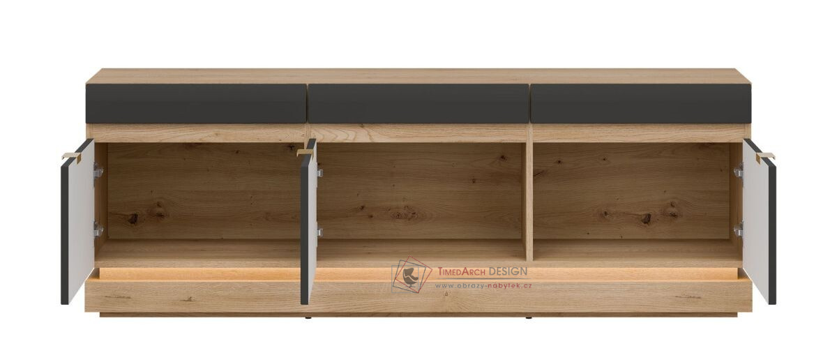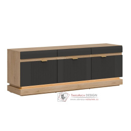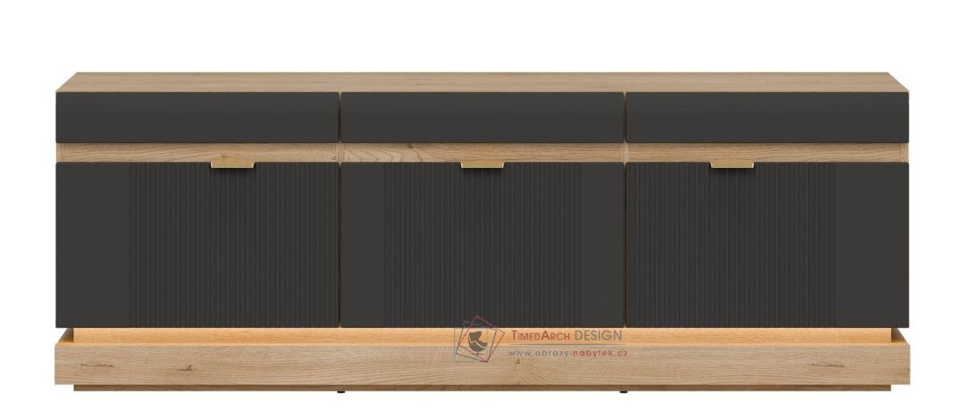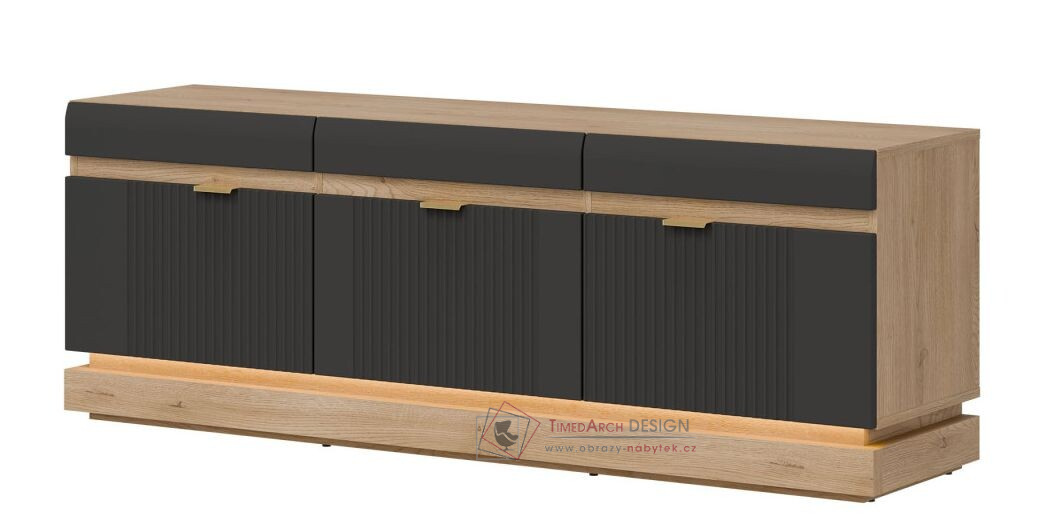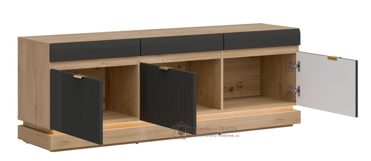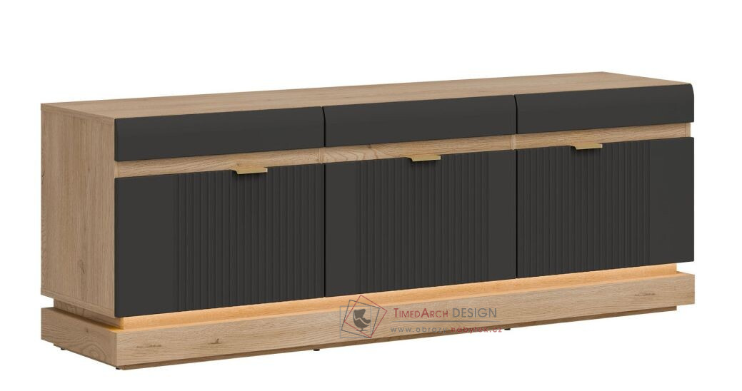 Televizní stolek ML01 z kolekce MILTON je jedinečnou kombinací moderního designu a nadčasové elegance. Přední desky z MDF s módní matnou povrchovou úpravou jsou k dispozici v několika stylových barevných variantách – od světlých odstínů až po syté tóny – a jsou vylepšeny jemným vertikálním frézováním, které dodává kusu vytříbený charakter. Zlaté úchytky dodávají kusu eleganci, zatímco volitelné LED osvětlení ve spodní části vytváří náladovou atmosféru a zdůrazňuje lehkost tvaru. Korpus v povrchové úpravě dub cremona torro vnáší do interiéru přirozené teplo a dokonale doplňuje rozmanitou barevnou paletu předních desek, čímž vytváří harmonickou, moderní kompozici. Stolek poskytuje praktický úložný prostor pro televizní a multimediální příslušenství a zároveň zachovává estetiku prostoru. Je ideální volbou pro ty, kteří si cení funkčnosti a stylu, a dokonale doplňuje minimalistický i klasičtější design obývacího pokoje.