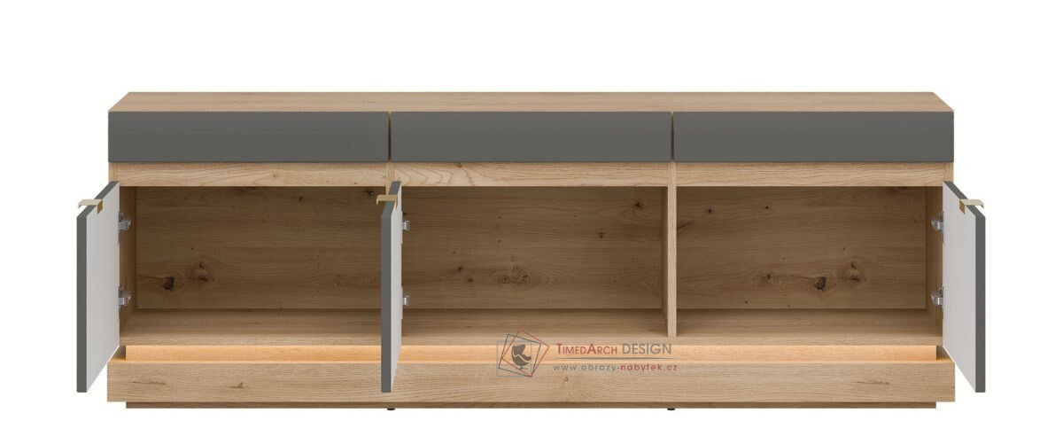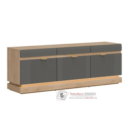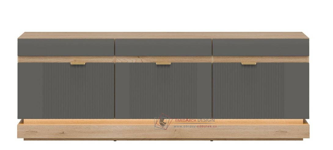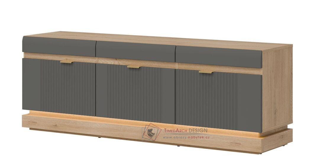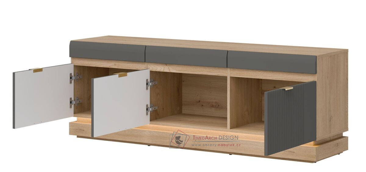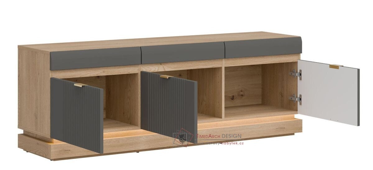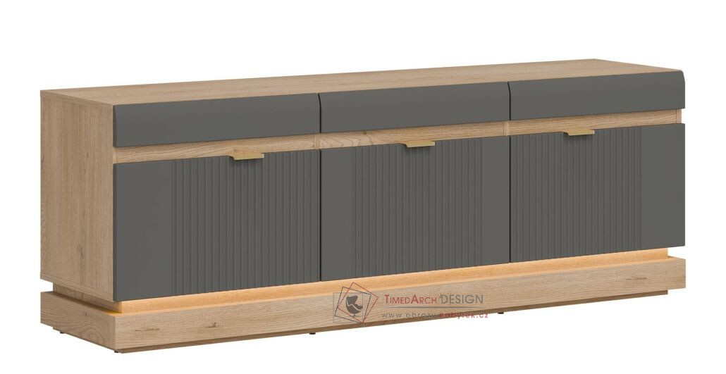 Televizní stolek ML01 z kolekce MILTON je jedinečnou kombinací moderního designu a nadčasové elegance. Přední desky z MDF s módní matnou povrchovou úpravou jsou k dispozici v několika stylových barevných variantách – od světlých odstínů až po syté tóny – a jsou vylepšeny jemným vertikálním frézováním, které dodává kusu vytříbený charakter. Zlaté úchytky dodávají kusu eleganci, zatímco volitelné LED osvětlení ve spodní části vytváří náladovou atmosféru a zdůrazňuje lehkost tvaru. Korpus v povrchové úpravě dub cremona torro vnáší do interiéru přirozené teplo a dokonale doplňuje rozmanitou barevnou paletu předních desek, čímž vytváří harmonickou, moderní kompozici. Stolek poskytuje praktický úložný prostor pro televizní a multimediální příslušenství a zároveň zachovává estetiku prostoru. Je ideální volbou pro ty, kteří si cení funkčnosti a stylu, a dokonale doplňuje minimalistický i klasičtější design obývacího pokoje.