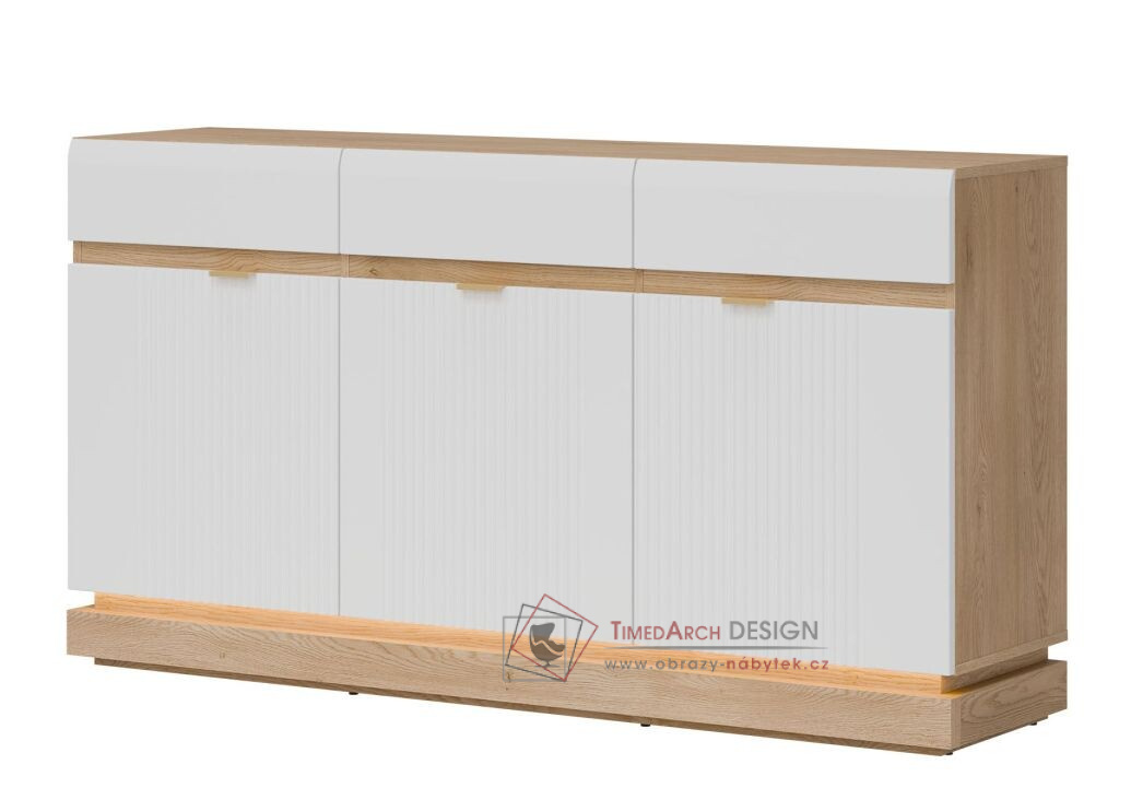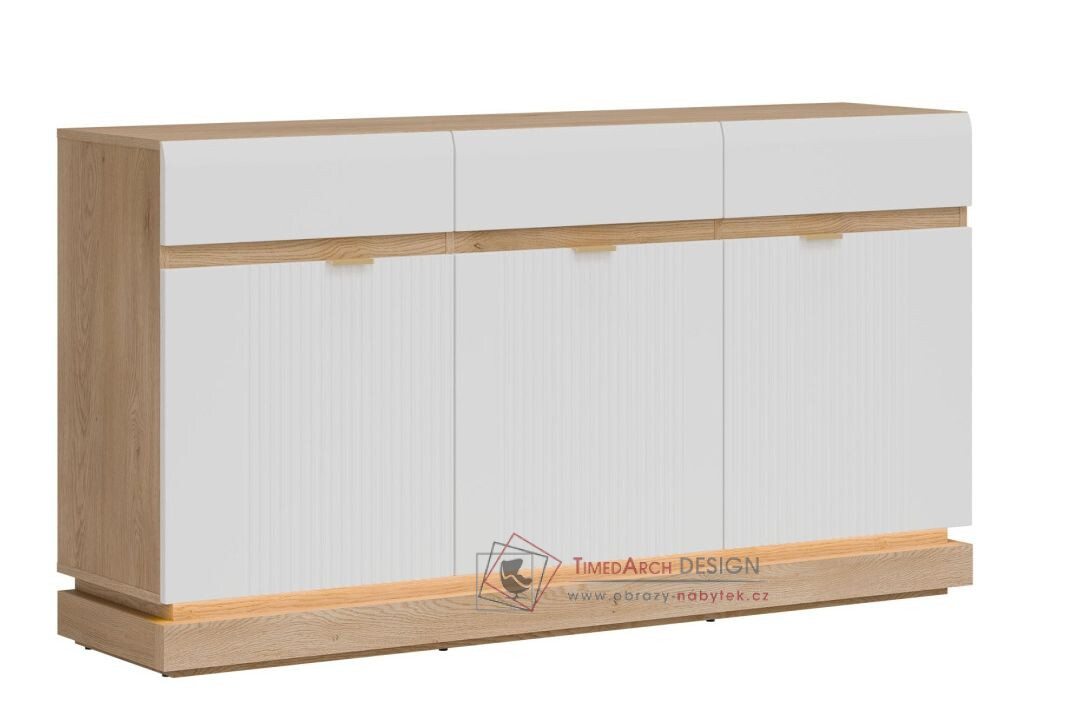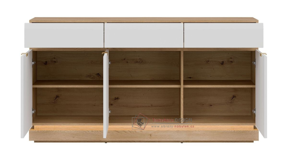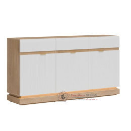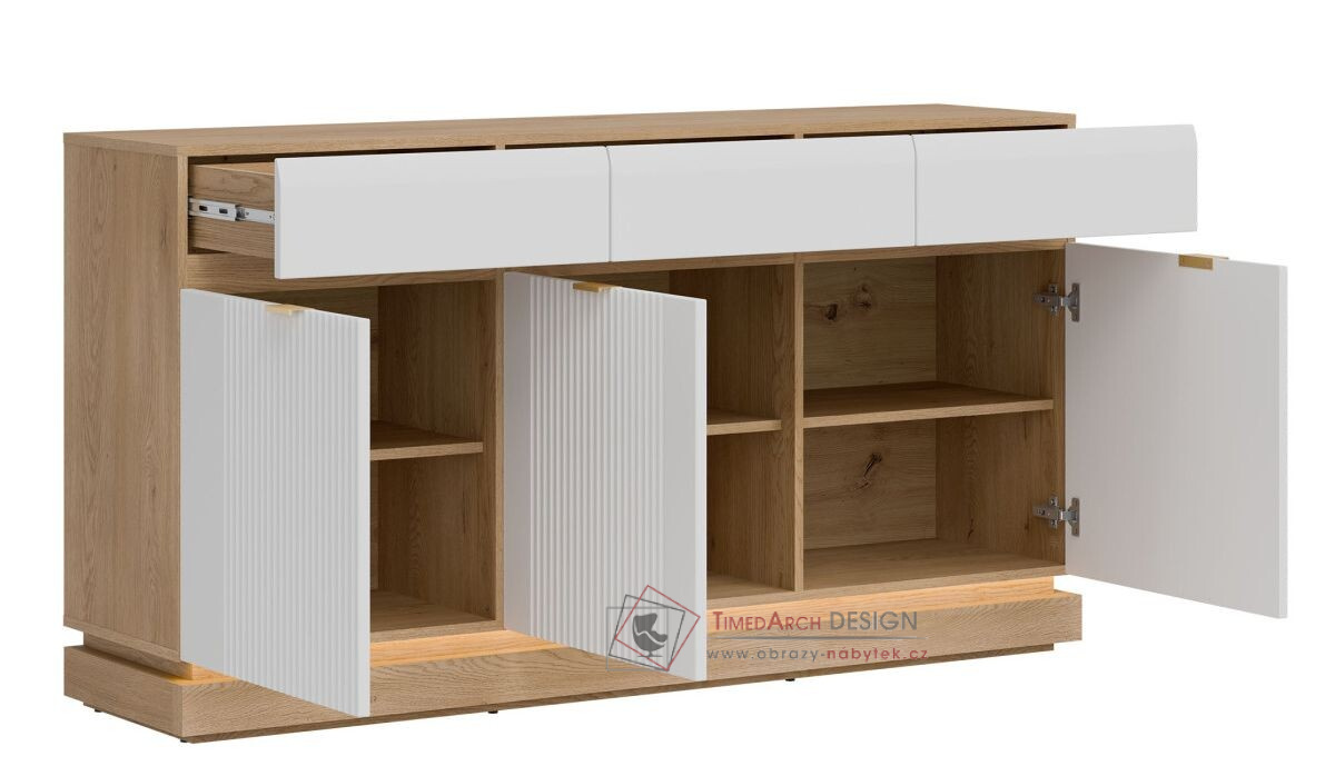 Moderní komoda ML02 z kolekce MILTON je perfektní volbou pro ty, kteří si cení promyšlených řešení a vytříbeného stylu. Matné MDF čela, dostupná v několika elegantních barevných variantách, jsou zdobena jemným vertikálním frézováním, které upoutává pozornost a zdůrazňuje moderní charakter kusu. Zlaté úchytky dodávají nádech elegance a sofistikovanosti. Interiér příborníku je vybaven praktickými policemi a zásuvkami na kuličkových ložiskách, které díky systému soft close zajišťují snadné používání a tichý chod. Je to ideální místo pro uložení nádobí, textilií nebo domácích potřeb. Korpus cremona dub torro dodává přirozené teplo a vytváří útulnou, ale moderní kompozici. Volitelné LED osvětlení ve spodní části skříňky vytváří příjemnou atmosféru a zdůrazňuje její lehký, stylový tvar. Komoda MILTON je ideální do obývacího pokoje, jídelny, chodby nebo dokonce do moderní kanceláře – kombinuje funkčnost, pohodlí a estetiku na nejvyšší úrovni. Interiér nábytku obsahuje praktické police a zásuvky na kuličkových ložiskách, které spolu se systémem soft close zajišťují vysoký komfort používání a tichý chod.