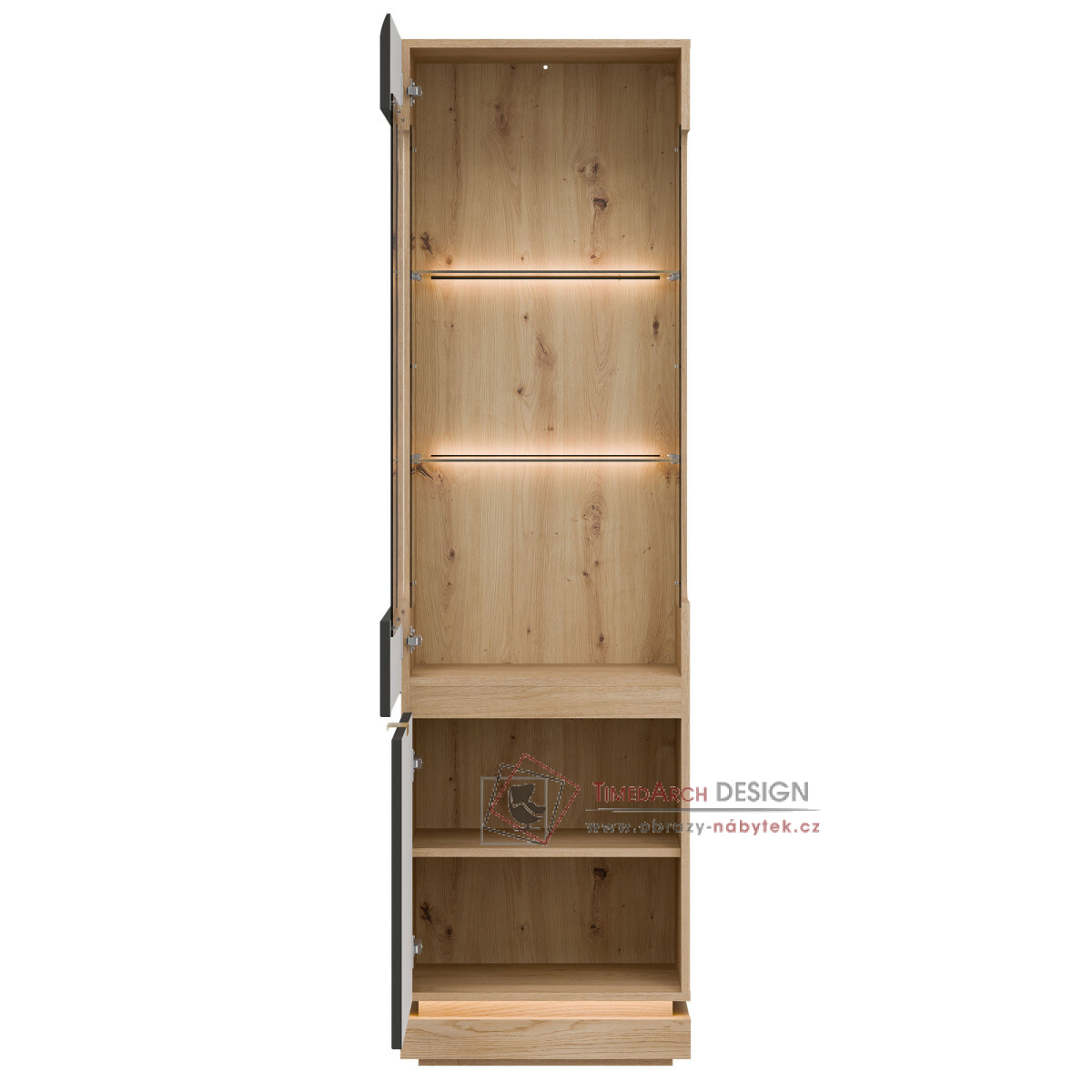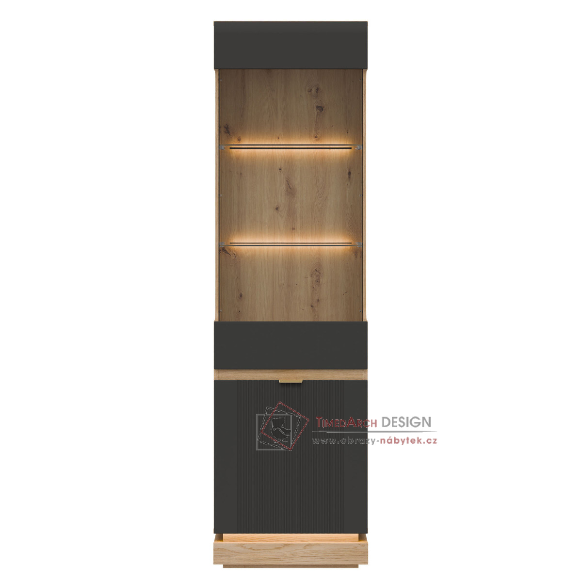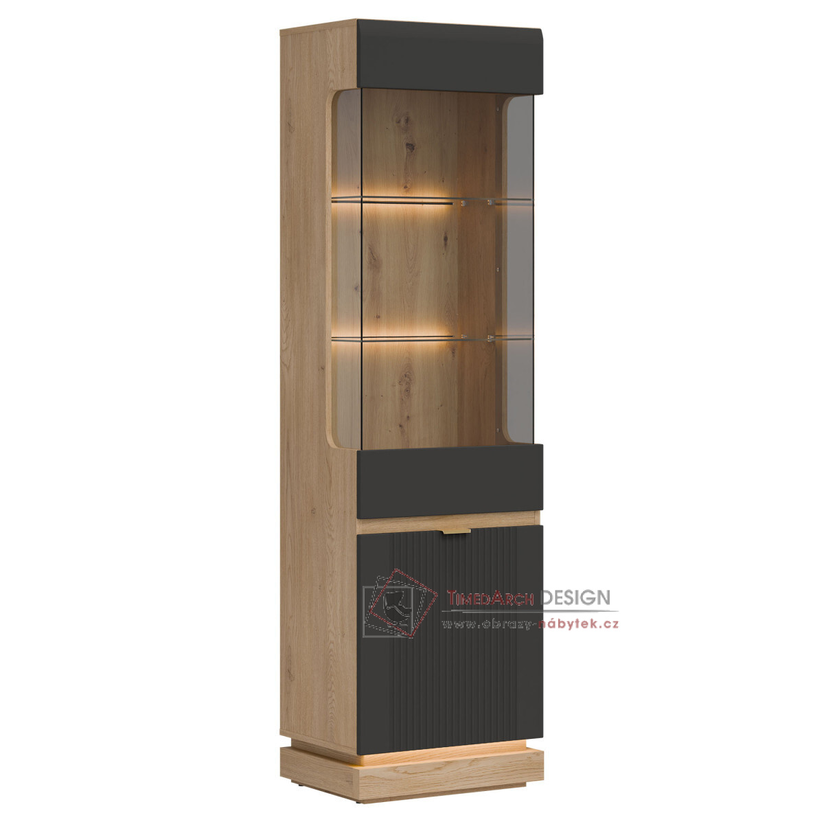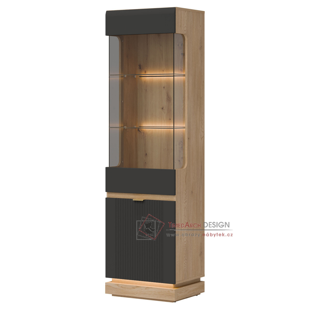 Vitrína ML05 z kolekce MILTON je dokonalou kombinací estetiky a funkčnosti, navržená s ohledem na moderní interiéry. Matné MDF čela, dostupná v několika elegantních barvách, jsou ve spodní části zdobena decentním vertikálním frézováním, které přitahuje pozornost a dodává kusu nábytku jedinečný charakter. Minimalistické zlaté úchytky zdůrazňují sofistikovaný styl, zatímco volitelné LED osvětlení ve výstavní části vytváří útulnou atmosféru. Horní část se skleněnou čelem je ideální pro vystavení nádobí, skla nebo dekorativních doplňků, zatímco uzamykatelné skříňky ve spodní části nabízejí funkční úložný prostor. Korpus v provedení dub cremona torro dodává celkové kompozici teplo a dokonale doplňuje rozmanitou barevnou paletu čela, čímž vytváří soudržný a harmonický celek. Vitrína je vybavena systémem tlumeného zavírání, který zajišťuje pohodlné každodenní používání. Bude ideální do obývacího pokoje, jídelny nebo prostorné kuchyně a dodá interiéru styl, eleganci a praktičnost.