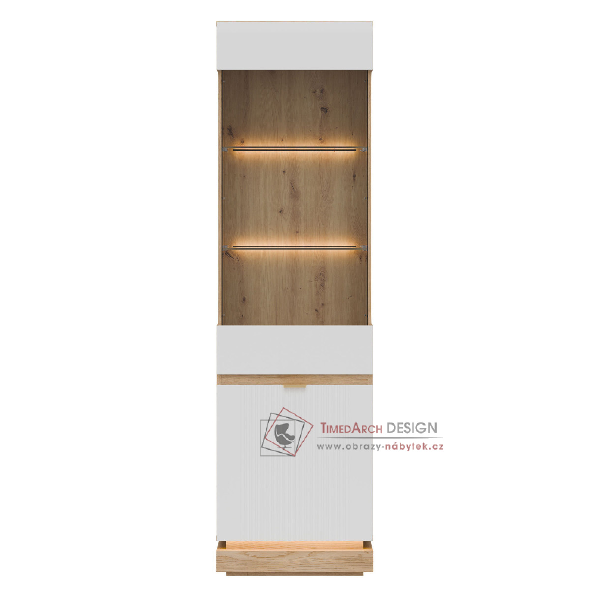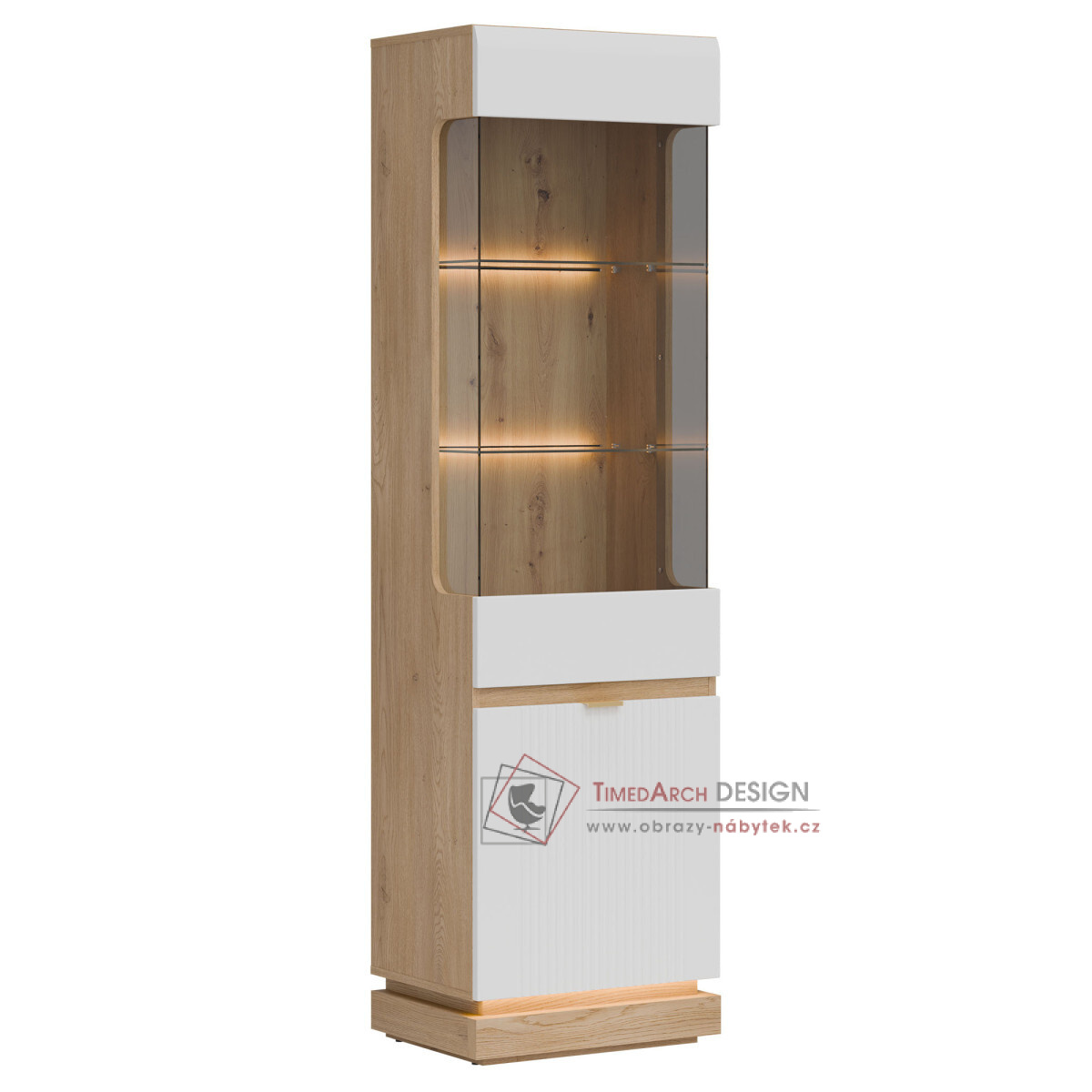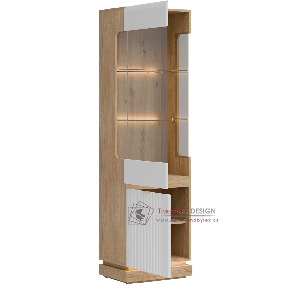 Vitrína ML05 z kolekce MILTON je dokonalou kombinací estetiky a funkčnosti, navržená s ohledem na moderní interiéry. Matné MDF čela, dostupná v několika elegantních barvách, jsou ve spodní části zdobena decentním vertikálním frézováním, které přitahuje pozornost a dodává kusu nábytku jedinečný charakter. Minimalistické zlaté úchytky zdůrazňují sofistikovaný styl, zatímco volitelné LED osvětlení ve výstavní části vytváří útulnou atmosféru. Horní část se skleněnou čelem je ideální pro vystavení nádobí, skla nebo dekorativních doplňků, zatímco uzamykatelné skříňky ve spodní části nabízejí funkční úložný prostor. Korpus v provedení dub cremona torro dodává celkové kompozici teplo a dokonale doplňuje rozmanitou barevnou paletu čela, čímž vytváří soudržný a harmonický celek. Vitrína je vybavena systémem tlumeného zavírání, který zajišťuje pohodlné každodenní používání. Bude ideální do obývacího pokoje, jídelny nebo prostorné kuchyně a dodá interiéru styl, eleganci a praktičnost.