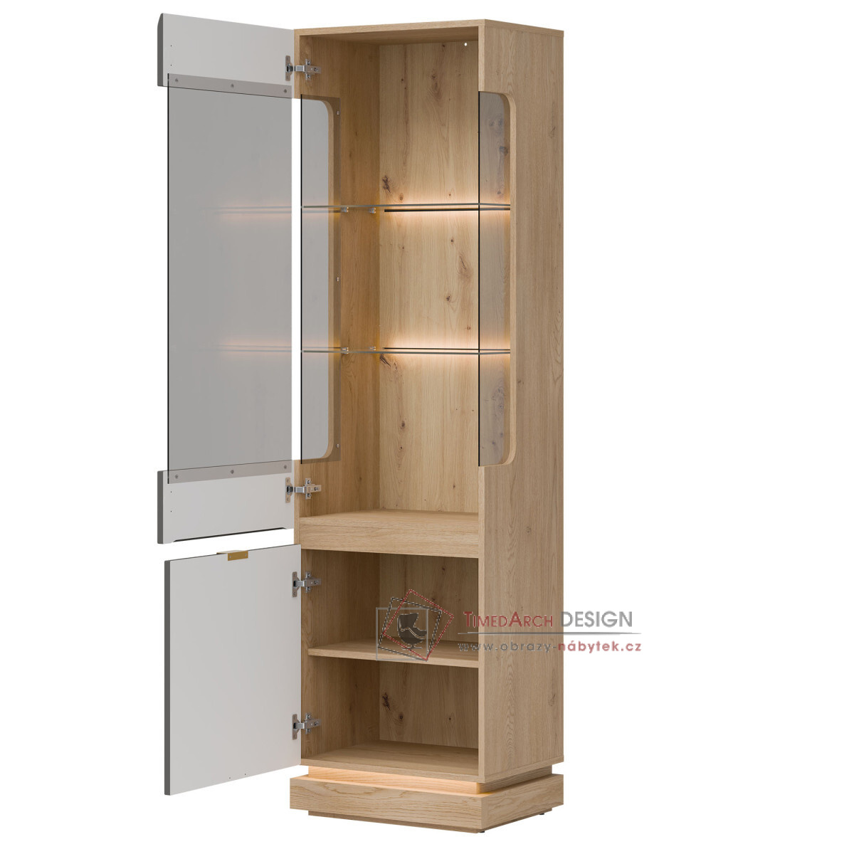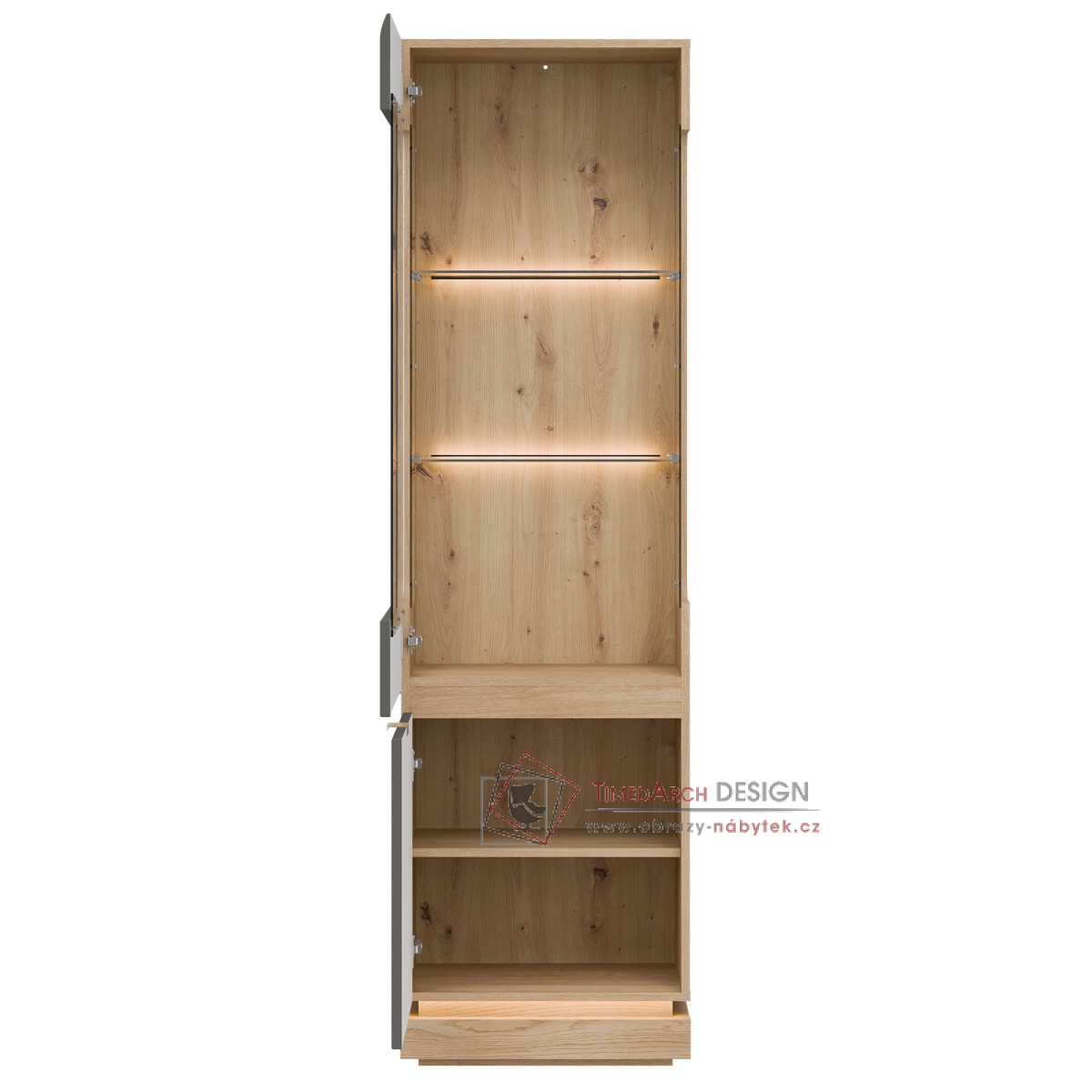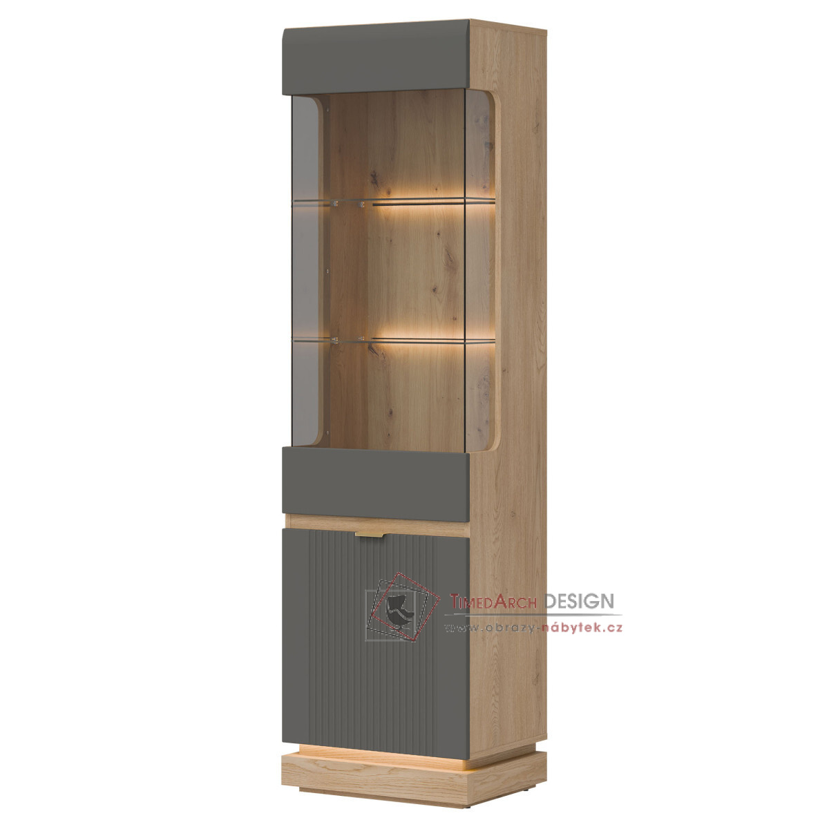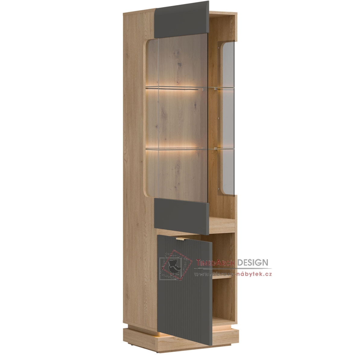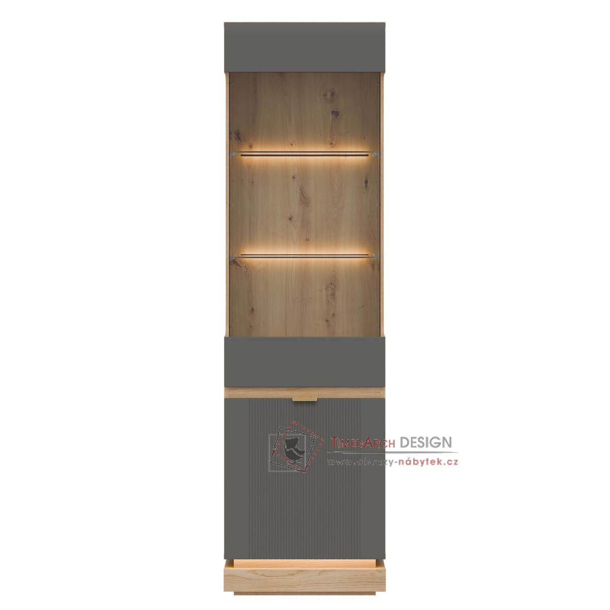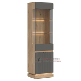Vitrína ML05 z kolekce MILTON je dokonalou kombinací estetiky a funkčnosti, navržená s ohledem na moderní interiéry. Matné MDF čela, dostupná v několika elegantních barvách, jsou ve spodní části zdobena decentním vertikálním frézováním, které přitahuje pozornost a dodává kusu nábytku jedinečný charakter. Minimalistické zlaté úchytky zdůrazňují sofistikovaný styl, zatímco volitelné LED osvětlení ve výstavní části vytváří útulnou atmosféru. Horní část se skleněnou čelem je ideální pro vystavení nádobí, skla nebo dekorativních doplňků, zatímco uzamykatelné skříňky ve spodní části nabízejí funkční úložný prostor. Korpus v provedení dub cremona torro dodává celkové kompozici teplo a dokonale doplňuje rozmanitou barevnou paletu čela, čímž vytváří soudržný a harmonický celek. Vitrína je vybavena systémem tlumeného zavírání, který zajišťuje pohodlné každodenní používání. Bude ideální do obývacího pokoje, jídelny nebo prostorné kuchyně a dodá interiéru styl, eleganci a praktičnost.