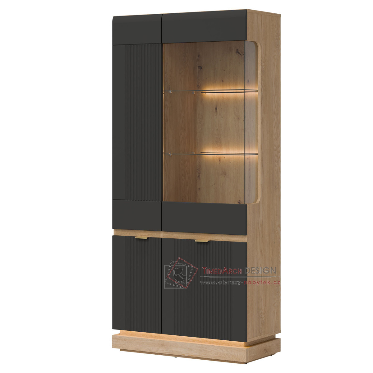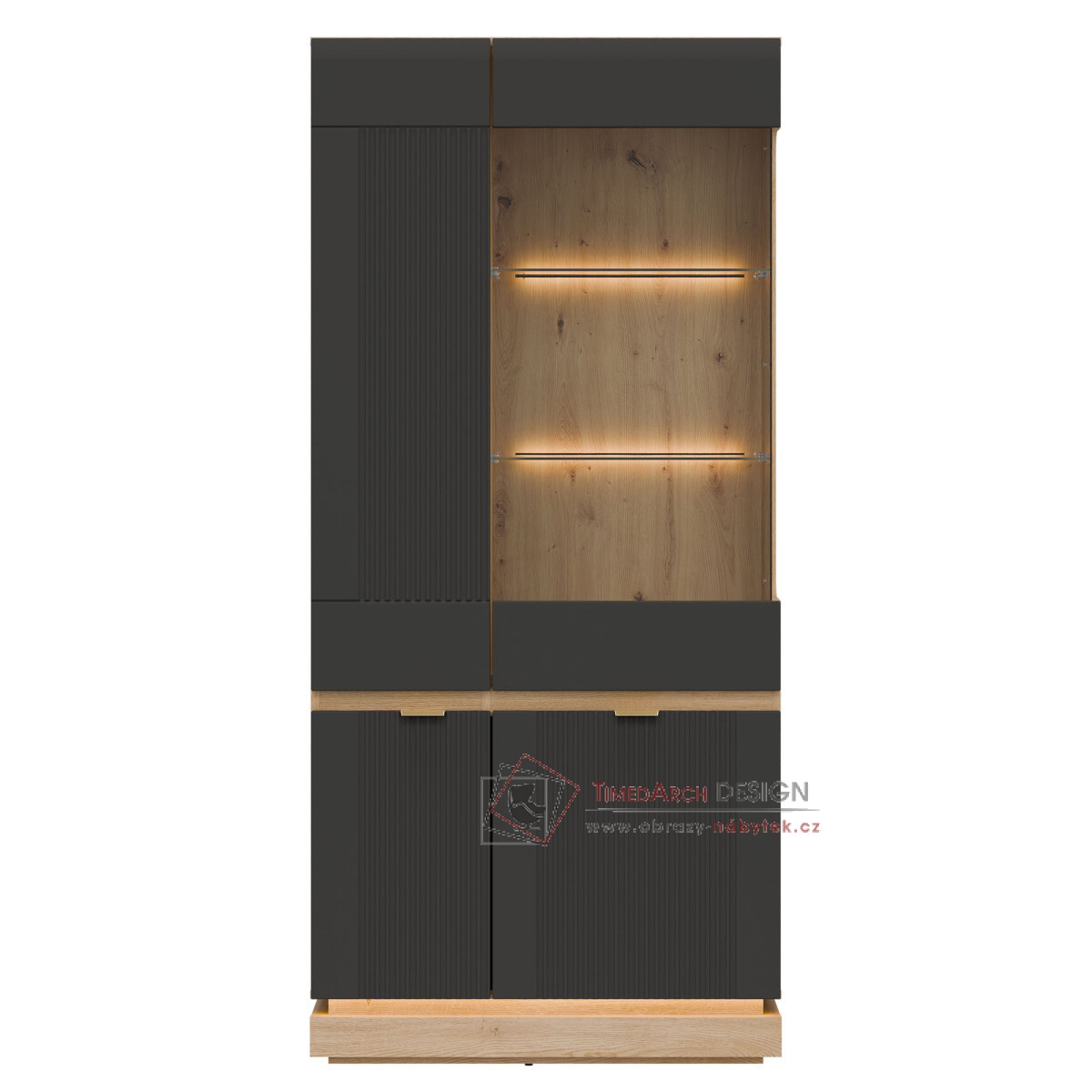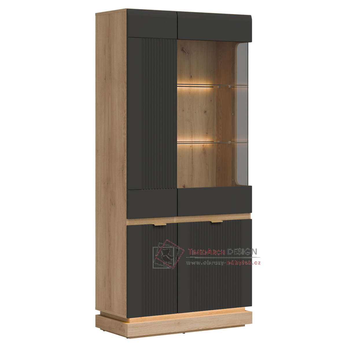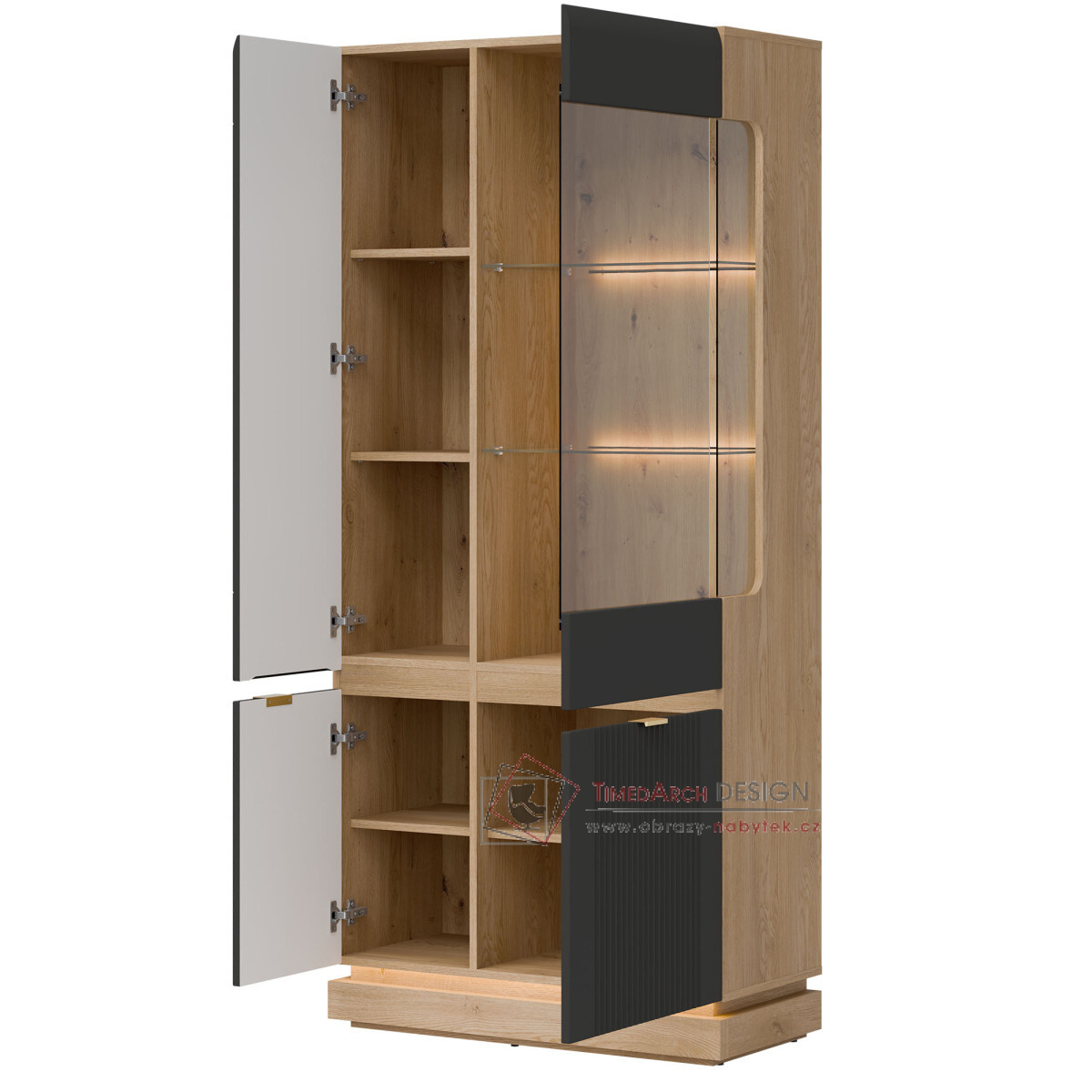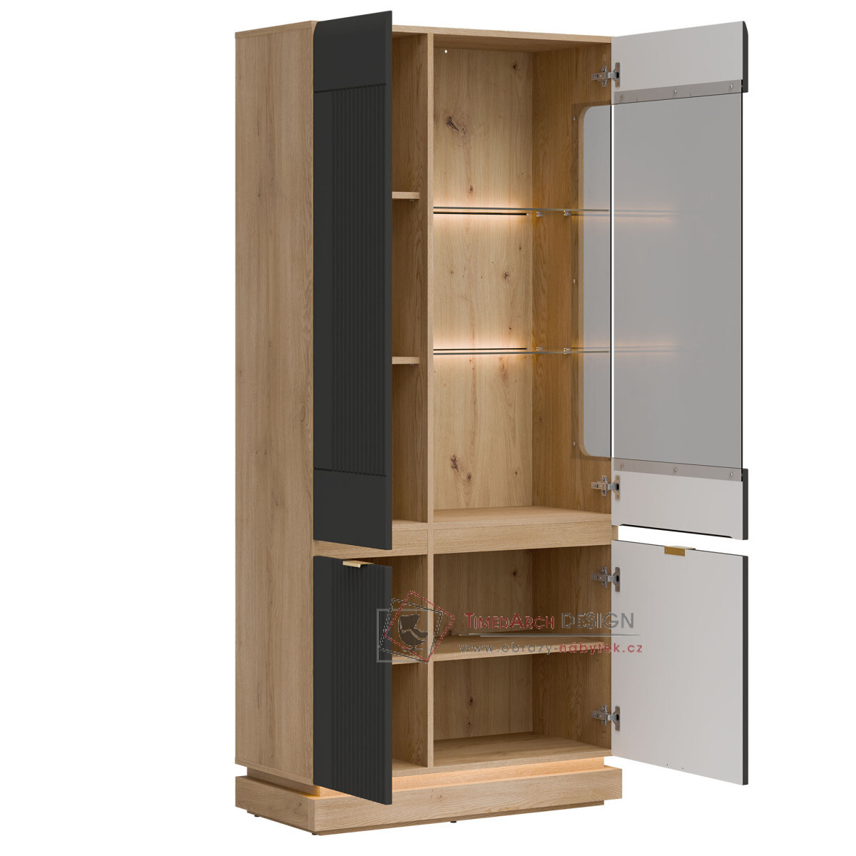 Vitrína ML05 z kolekce MILTON je dokonalou kombinací estetiky a funkčnosti, navržená s ohledem na moderní interiéry. Matné MDF čela, dostupná v několika elegantních barvách, jsou ve spodní části zdobena decentním vertikálním frézováním, které přitahuje pozornost a dodává kusu nábytku jedinečný charakter. Minimalistické zlaté úchytky zdůrazňují sofistikovaný styl, zatímco volitelné LED osvětlení ve výstavní části vytváří útulnou atmosféru. Horní část se skleněnou čelem je ideální pro vystavení nádobí, skla nebo dekorativních doplňků, zatímco uzamykatelné skříňky ve spodní části nabízejí funkční úložný prostor. Korpus v provedení dub cremona torro dodává celkové kompozici teplo a dokonale doplňuje rozmanitou barevnou paletu čela, čímž vytváří soudržný a harmonický celek. Vitrína je vybavena systémem tlumeného zavírání, který zajišťuje pohodlné každodenní používání. Bude ideální do obývacího pokoje, jídelny nebo prostorné kuchyně a dodá interiéru styl, eleganci a praktičnost.