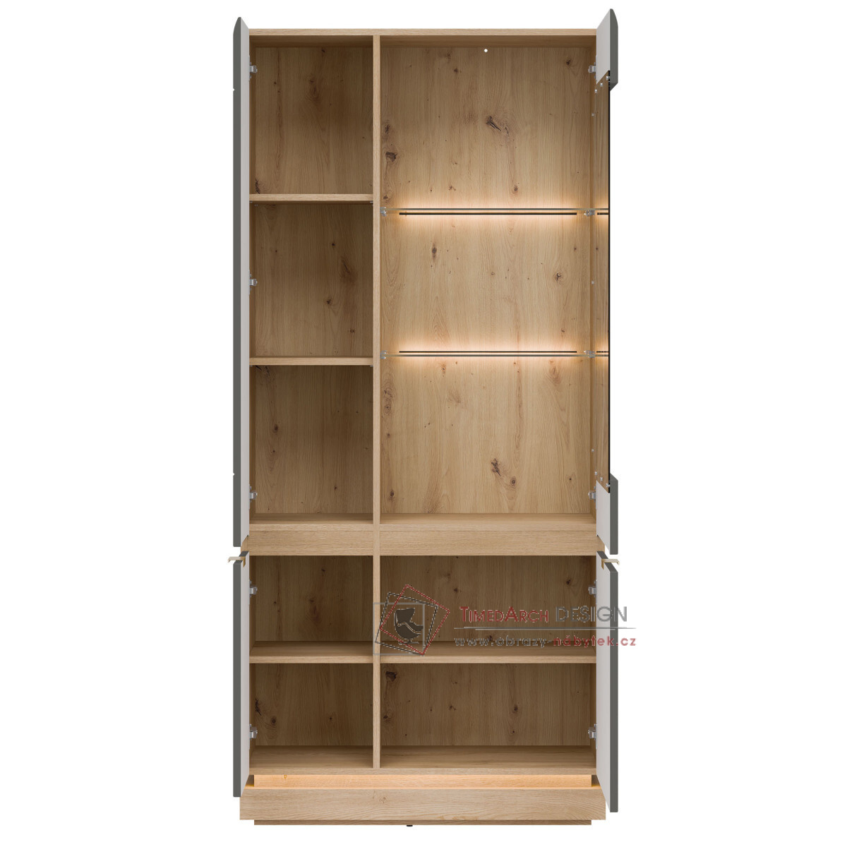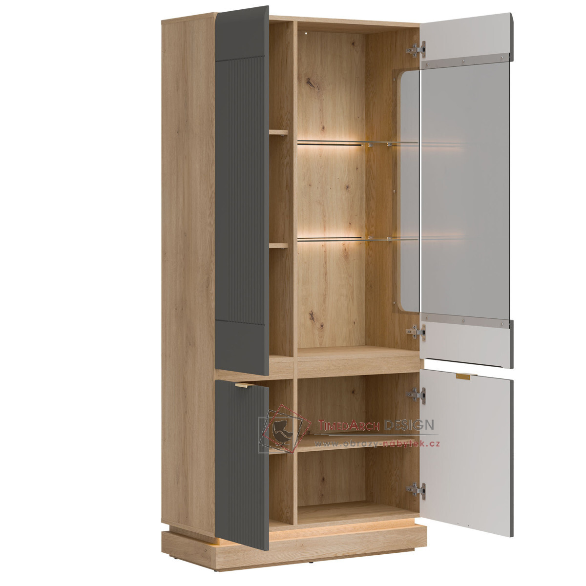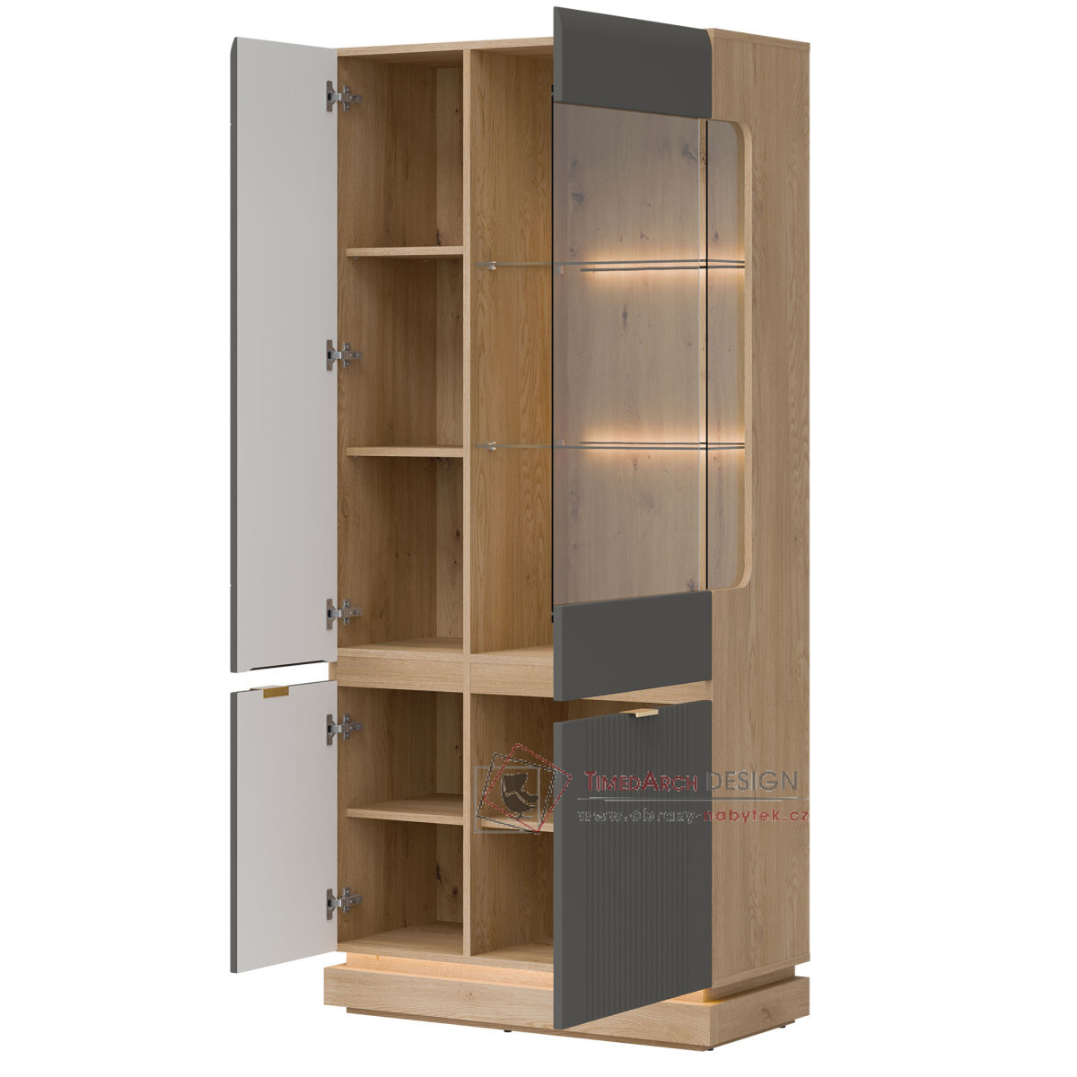 Vitrína ML05 z kolekce MILTON je dokonalou kombinací estetiky a funkčnosti, navržená s ohledem na moderní interiéry. Matné MDF čela, dostupná v několika elegantních barvách, jsou ve spodní části zdobena decentním vertikálním frézováním, které přitahuje pozornost a dodává kusu nábytku jedinečný charakter. Minimalistické zlaté úchytky zdůrazňují sofistikovaný styl, zatímco volitelné LED osvětlení ve výstavní části vytváří útulnou atmosféru. Horní část se skleněnou čelem je ideální pro vystavení nádobí, skla nebo dekorativních doplňků, zatímco uzamykatelné skříňky ve spodní části nabízejí funkční úložný prostor. Korpus v provedení dub cremona torro dodává celkové kompozici teplo a dokonale doplňuje rozmanitou barevnou paletu čela, čímž vytváří soudržný a harmonický celek. Vitrína je vybavena systémem tlumeného zavírání, který zajišťuje pohodlné každodenní používání. Bude ideální do obývacího pokoje, jídelny nebo prostorné kuchyně a dodá interiéru styl, eleganci a praktičnost.