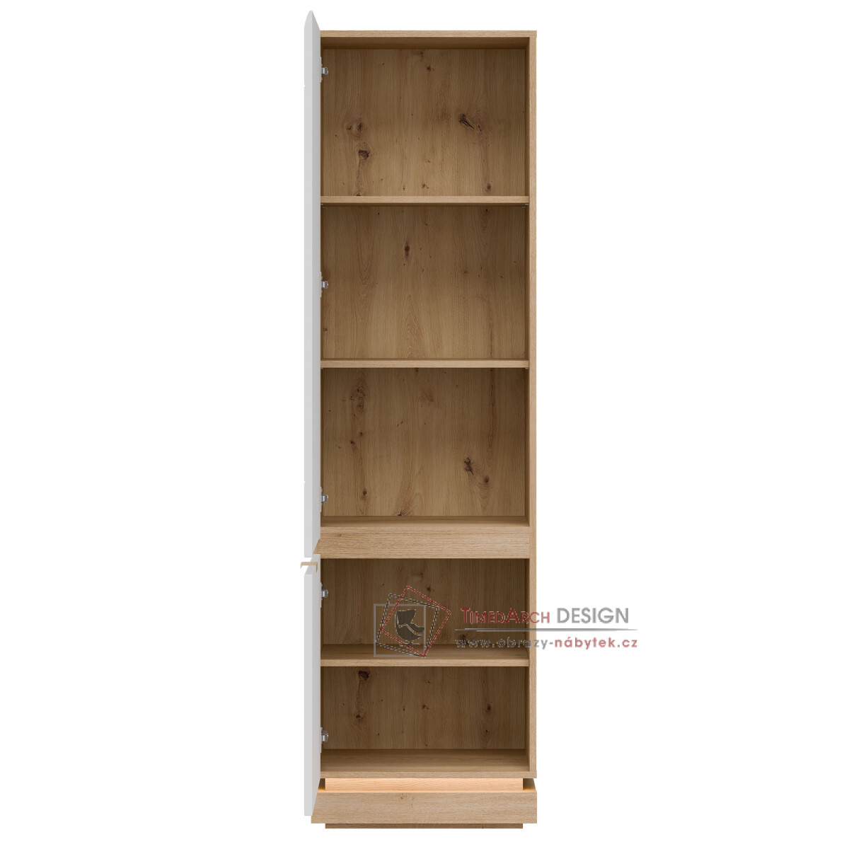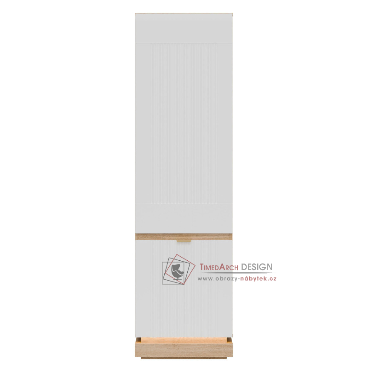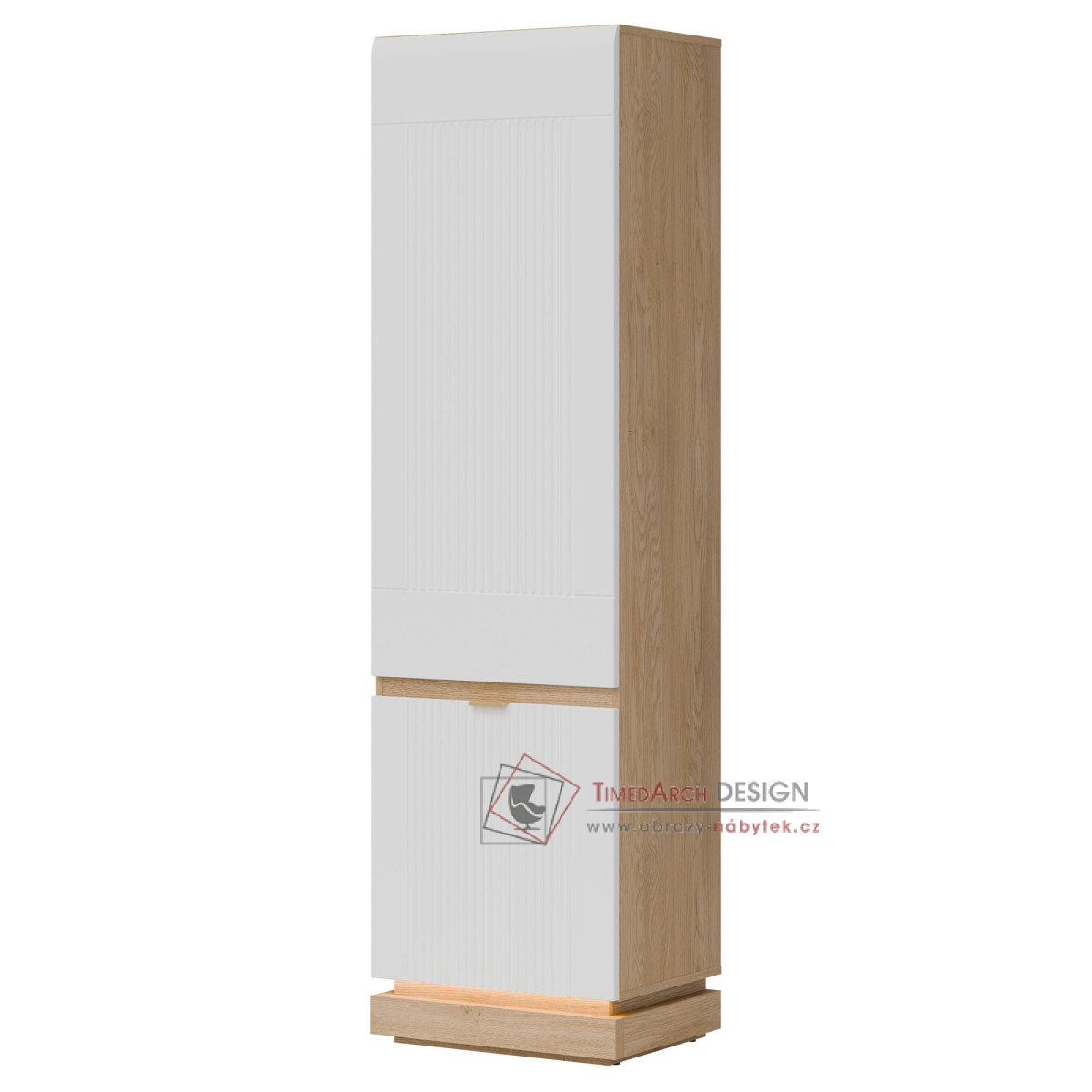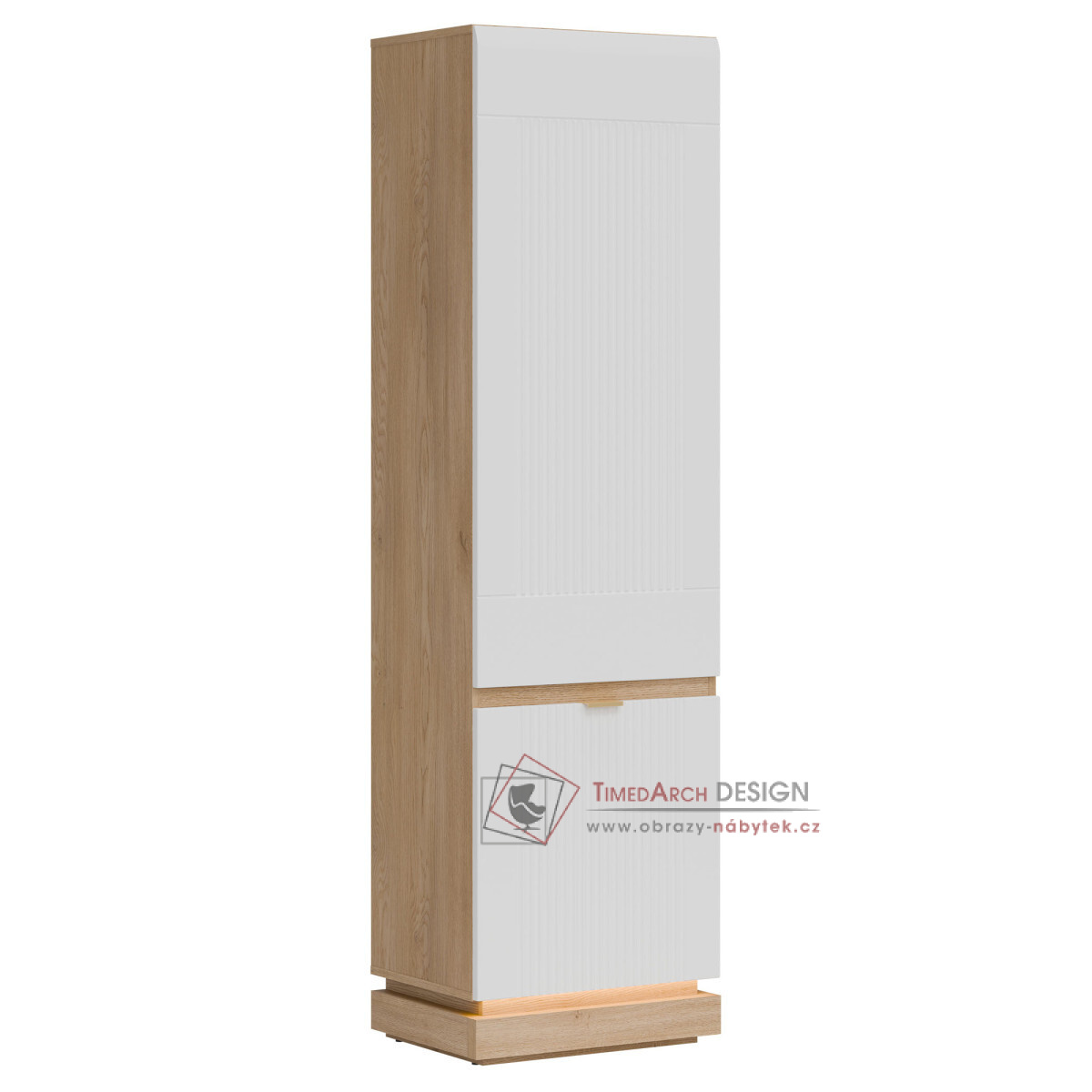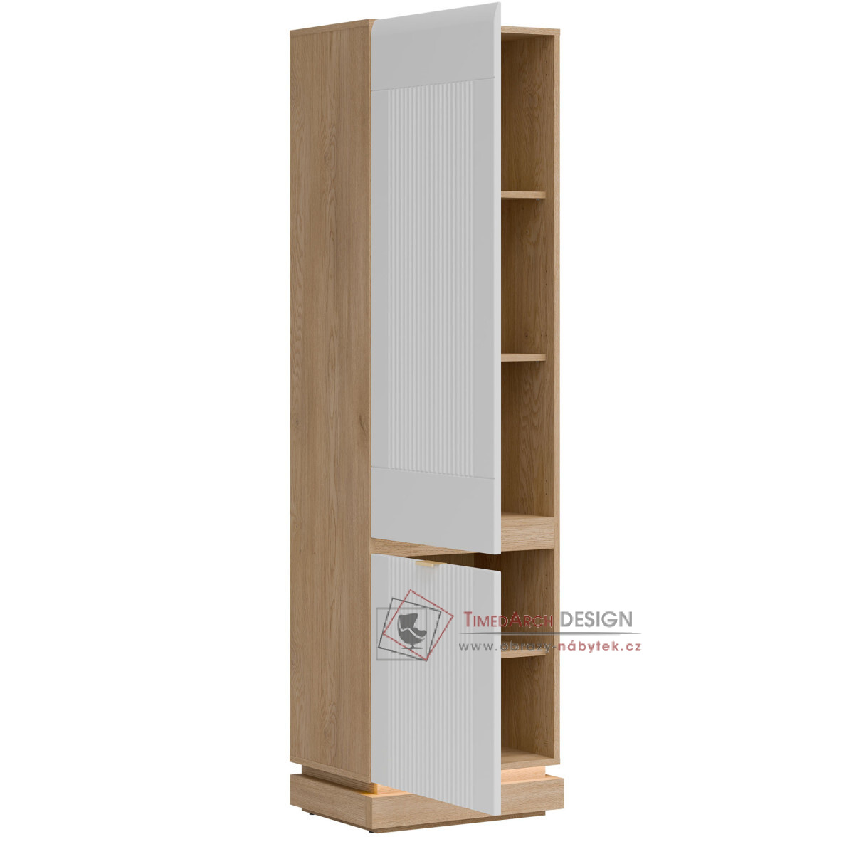 Skříň MILTON ML07 je elegantním a funkčním doplňkem kolekce MILTON, ideální pro moderní interiéry, kde se spojuje prostor a estetika. Vysoká, uzamykatelná konstrukce je navržena pro maximální kapacitu – vnitřní police jsou ideální pro uložení knih, dokumentů a doplňků denní potřeby, což zajišťuje pořádek a snadný přístup k obsahu. Matné MDF čela, dostupná v několika tlumených barvách, se vyznačují jemným frézováním, které zdůrazňuje moderní, ale zároveň nadčasový charakter kusu. Stylové zlaté úchytky dodávají elegantní vzhled. Korpus dub cremona torro vnáší do prostoru přirozené teplo a harmonicky doplňuje barvy čela, čímž vytváří moderní, ale zároveň útulnou kompozici. Skříňka je vybavena systémem tlumeného dovírání, který zajišťuje výjimečné pohodlí. Je to perfektní volba do obývacího pokoje, kanceláře nebo chodby – kamkoli, kde je styl, funkčnost a vysoce kvalitní řemeslné zpracování prvořadé.