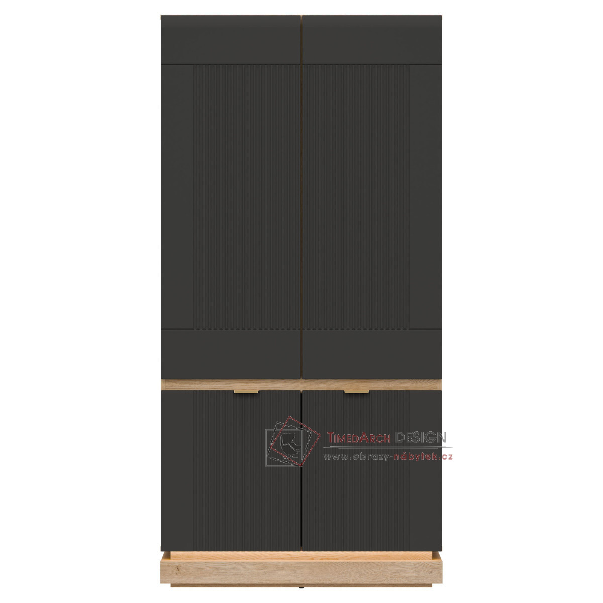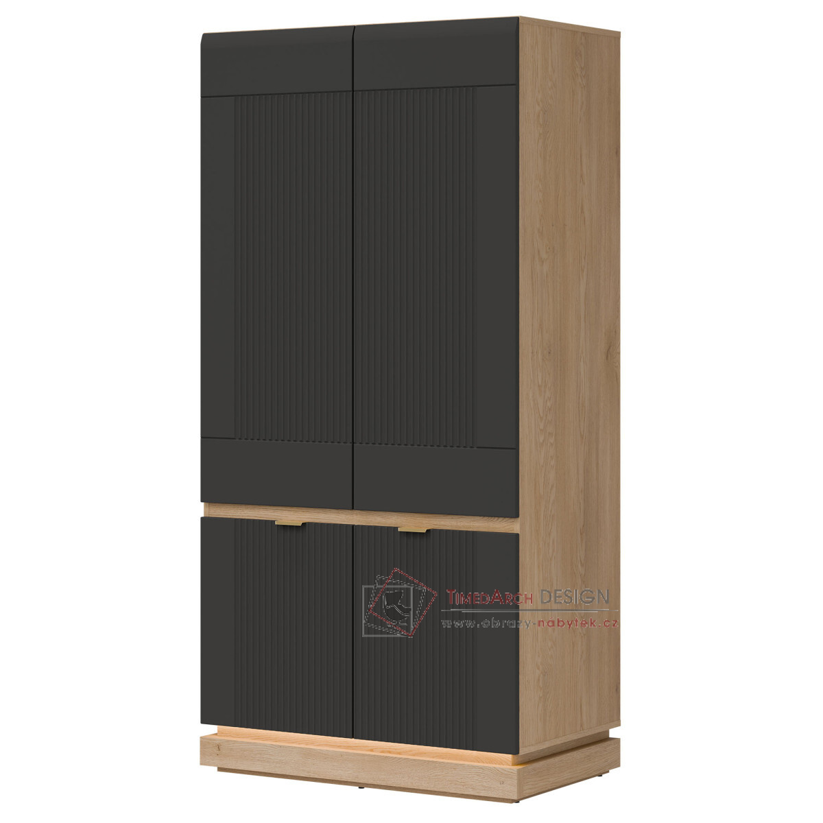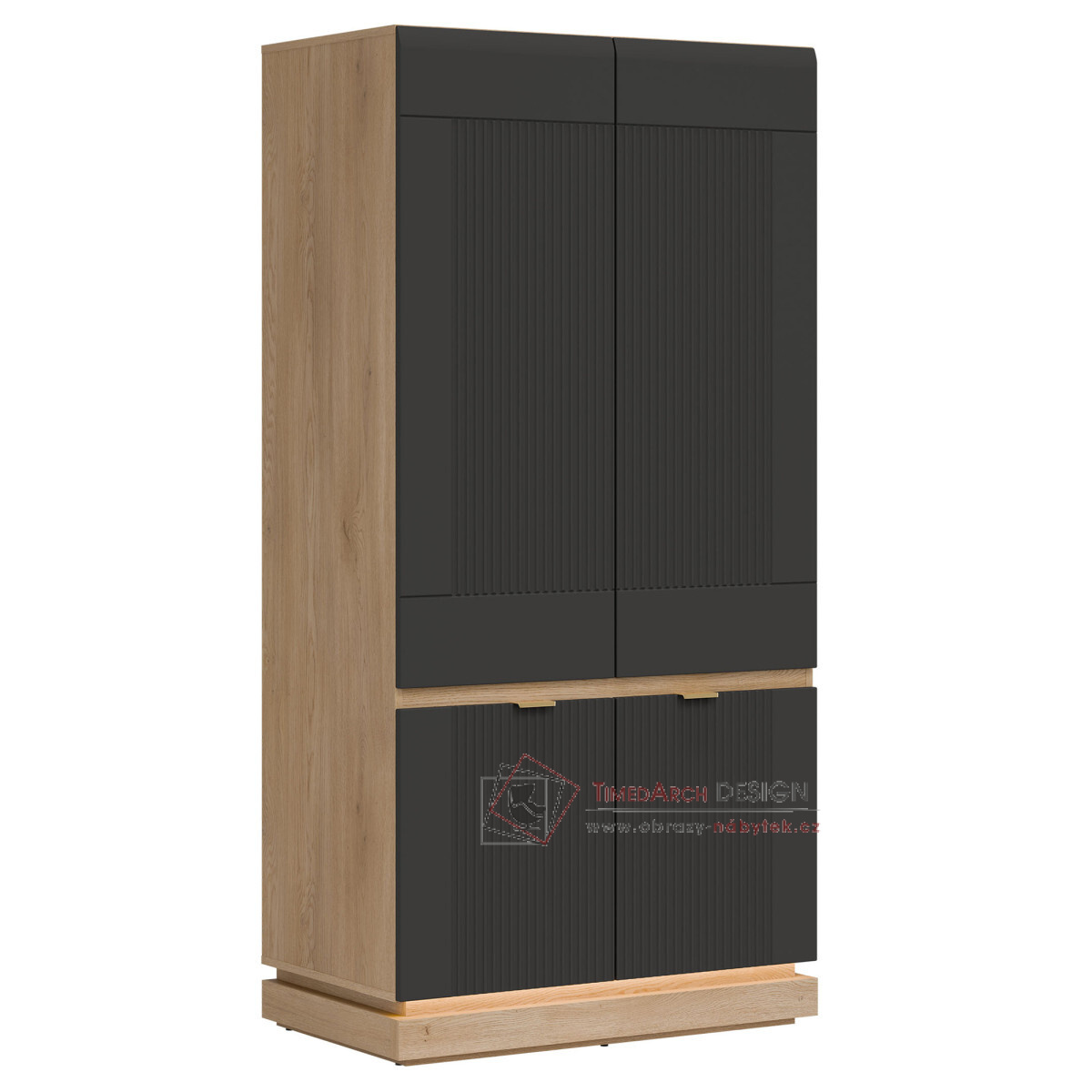 Její elegantní design kombinuje matné čela ve čtyřech barvách: kašmírová, šedá, antracitová a bílá s korpusy v povrchové úpravě z dubu cremona Torro. Frézovaná čela dodávají nábytku jedinečný charakter. Volitelné LED osvětlení ve vitrínách a dalších prvcích nábytku umocňuje jejich moderní charakter a vytváří útulnou atmosféru. Kolekce MILTON je perfektním řešením pro ty, kteří si cení moderního designu, funkčnosti a vysoce kvalitního řemeslného zpracování. Díky rozmanitosti prvků a barev vám nábytek v této sérii umožňuje vytvářet ucelené a elegantní aranžmá v celém domě.