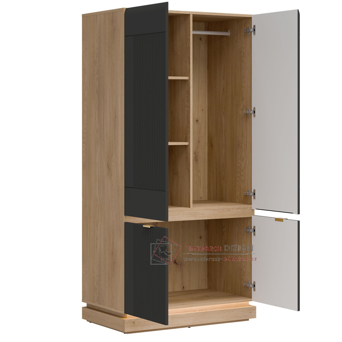 Šatní skříň MILTON ML08 2-D je elegantním a funkčním doplňkem kolekce MILTON, určené pro moderní a stylové interiéry. Její promyšlený design maximalizuje úložný prostor – uvnitř je umístěna šatní tyč, ideální pro ramínka, a praktické police, které pomáhají uspořádat oblečení a další předměty denní potřeby. Matné MDF čela, dostupná v několika univerzálních barvách, vypadají elegantně a decentně a jejich jednoduchost umožňuje snadnou integraci do minimalistických i klasičtějších interiérů. Moderní zlaté úchytky dodávají skříni stylový nádech. Povrchová úprava Cremona Torro Oak dodává skříni přirozený, teplý charakter a vytváří harmonický kontrast s barvami čela. Díky systému tlumeného dovírání se dvířka skříně zavírají hladce a tiše, což zvyšuje pohodlí každodenního používání. Šatní skříň ML08 je ideální jak do ložnice, tak do chodby a kombinuje estetiku s praktičností.