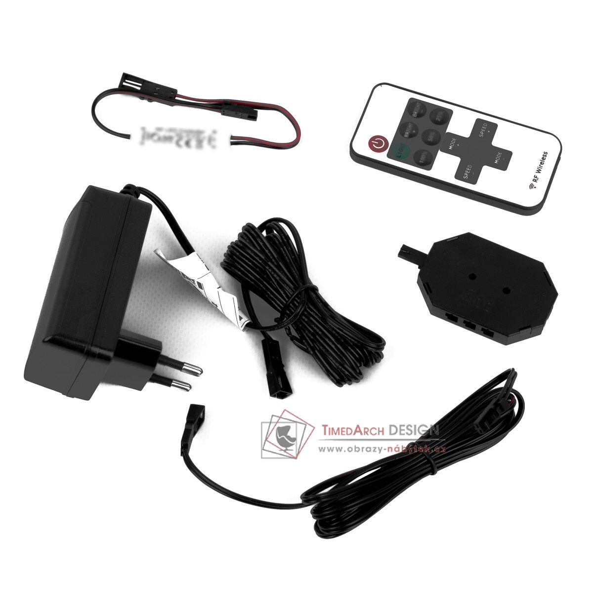 Sestava zesilovače LED osvětlení MILTON skládající se z 12W zesilovače, rozdělovače na 6 zástrček a převodník.