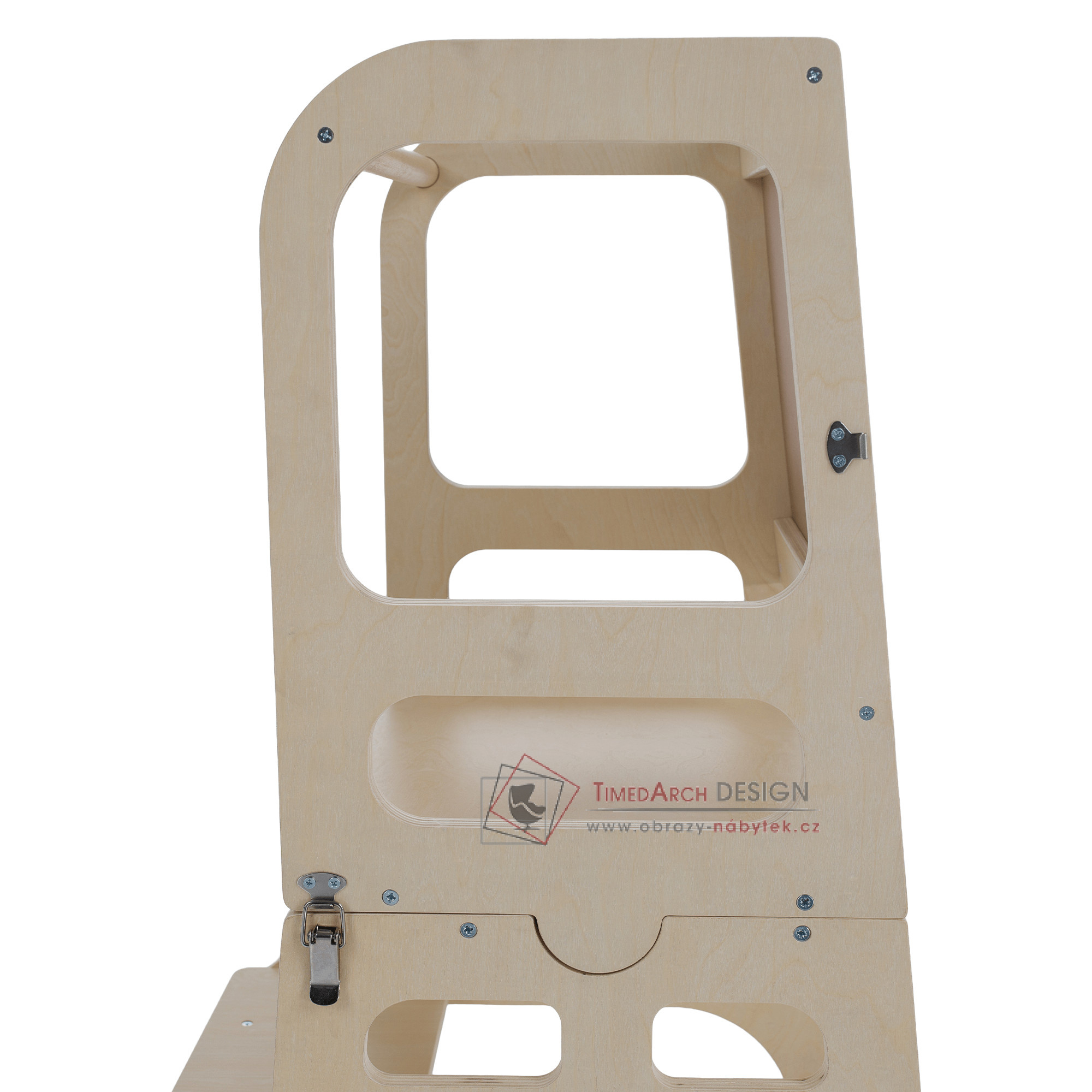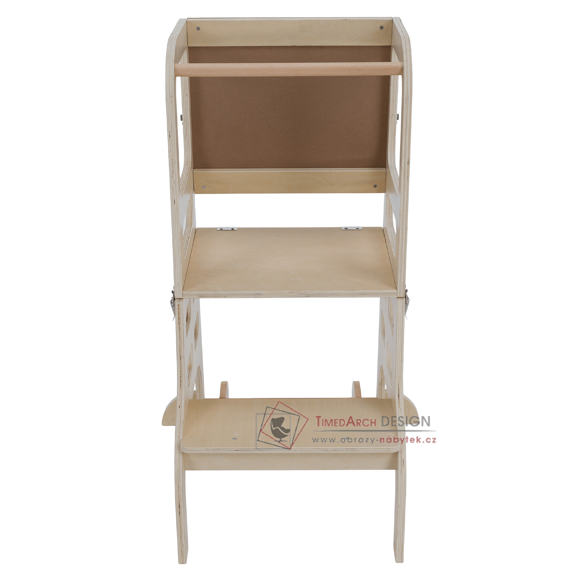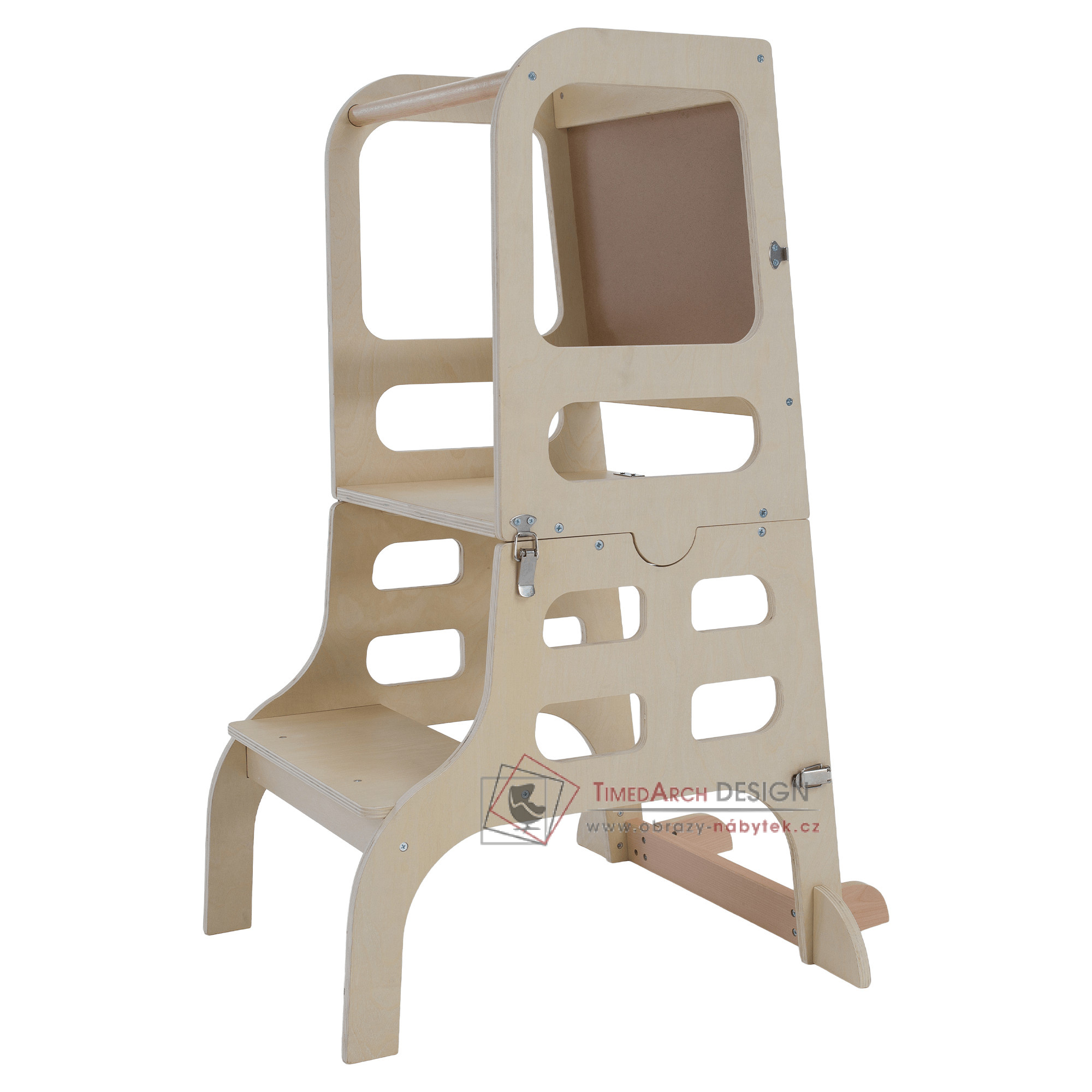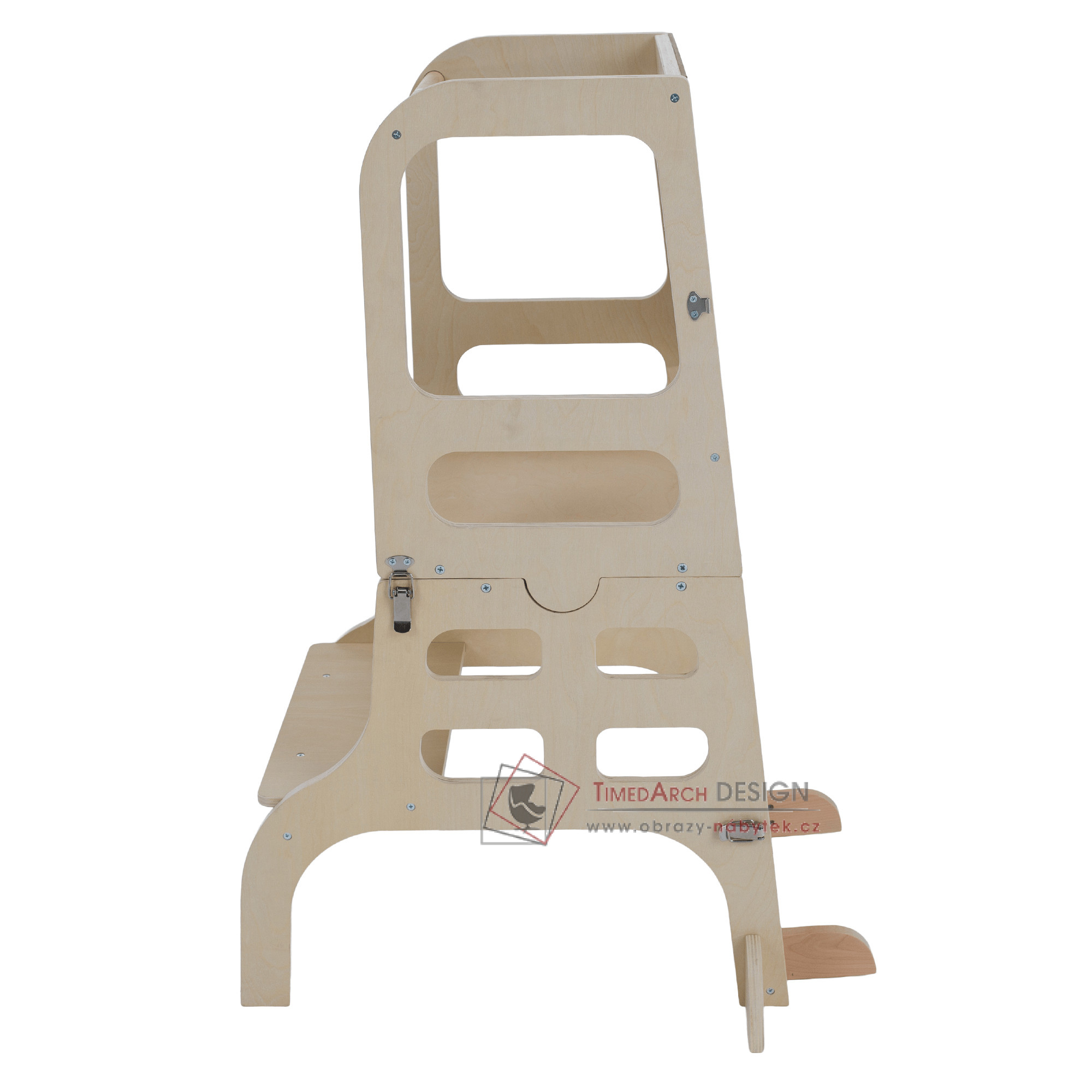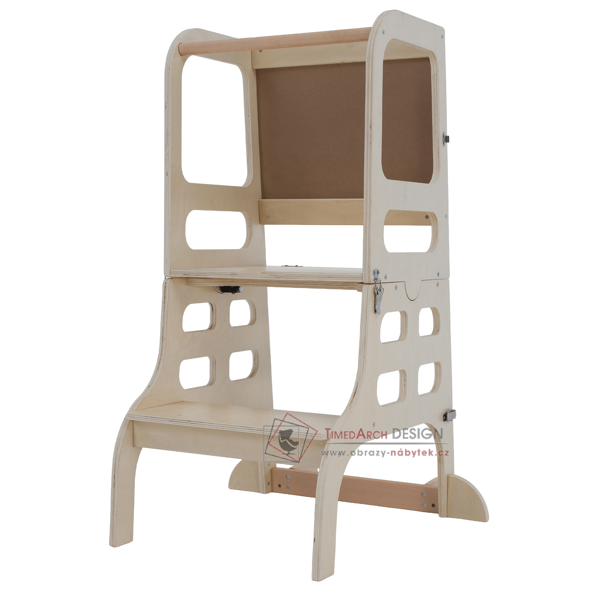 Je to hravý společník, který roste spolu s vaším dítětem a přirozeně se přizpůsobuje jeho potřebám. V jednu chvíli slouží jako bezpečná učící věž, v další se díky promyšlené konstrukci bez použití nářadí změní na stolek s židlí nebo tabuli na kreslení. Stačí jednoduše odemknout sponu, otočit a opět zajistit, abyste vytvořili nový prostor pro tvořivost, učení nebo společné chvíle. Zaoblené hrany chrání malé rukojeti, zatímco kvalitní kombinace masivního borovicového dřeva a překližky zaručuje stabilitu a dlouhou životnost. V přírodním provedení se dokonale hodí do každé domácnosti, kde rodiče chtějí svým dětem dopřát nejen funkční, ale také esteticky příjemný doplněk. Věž podporuje samostatnost a umožňuje dětem aktivně se zapojit do každodenních rodinných aktivit. Je určena pro děti starší jednoho roku, které již dokážou samostatně stát. Splňuje všechny bezpečnostní normy EN 14988:2017 + A1:2020. Věž MAGAN se může stát oblíbenou součástí vašeho domova.