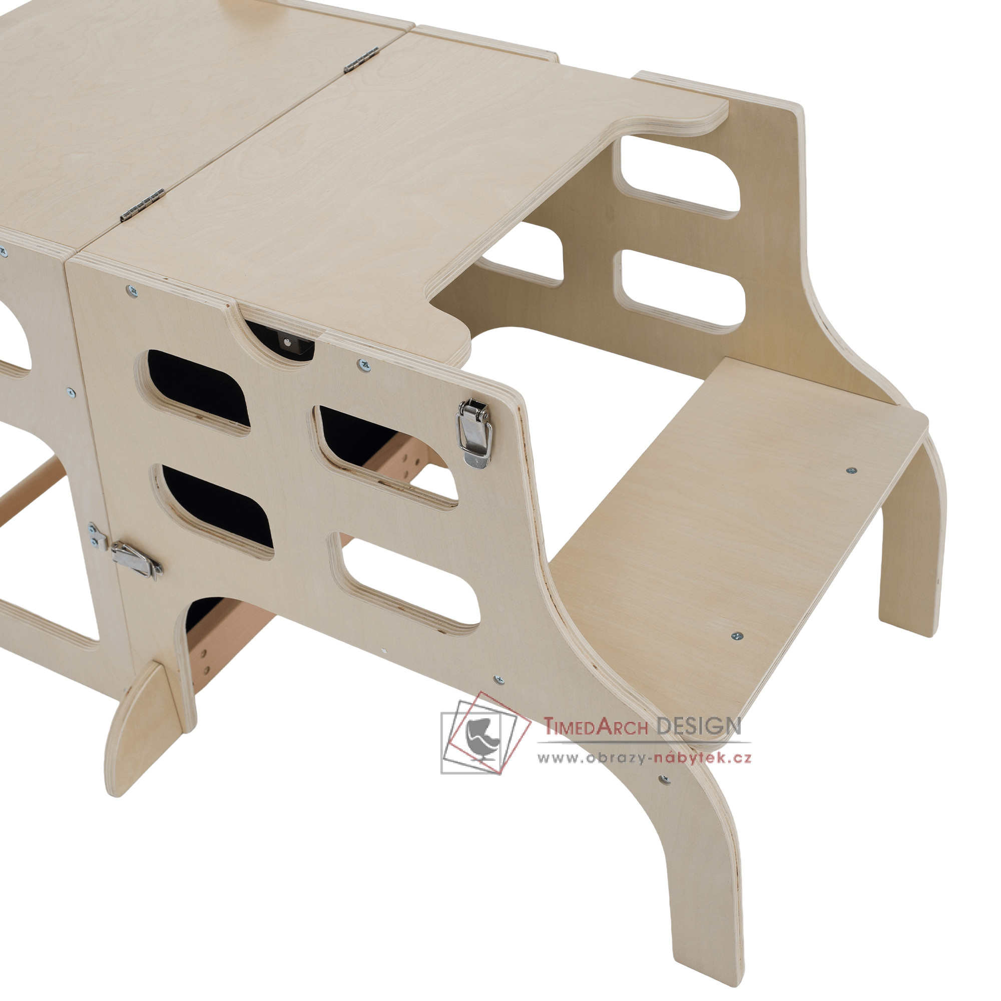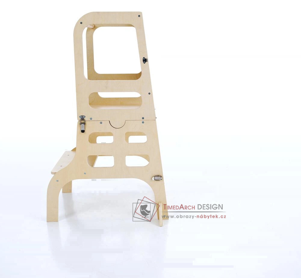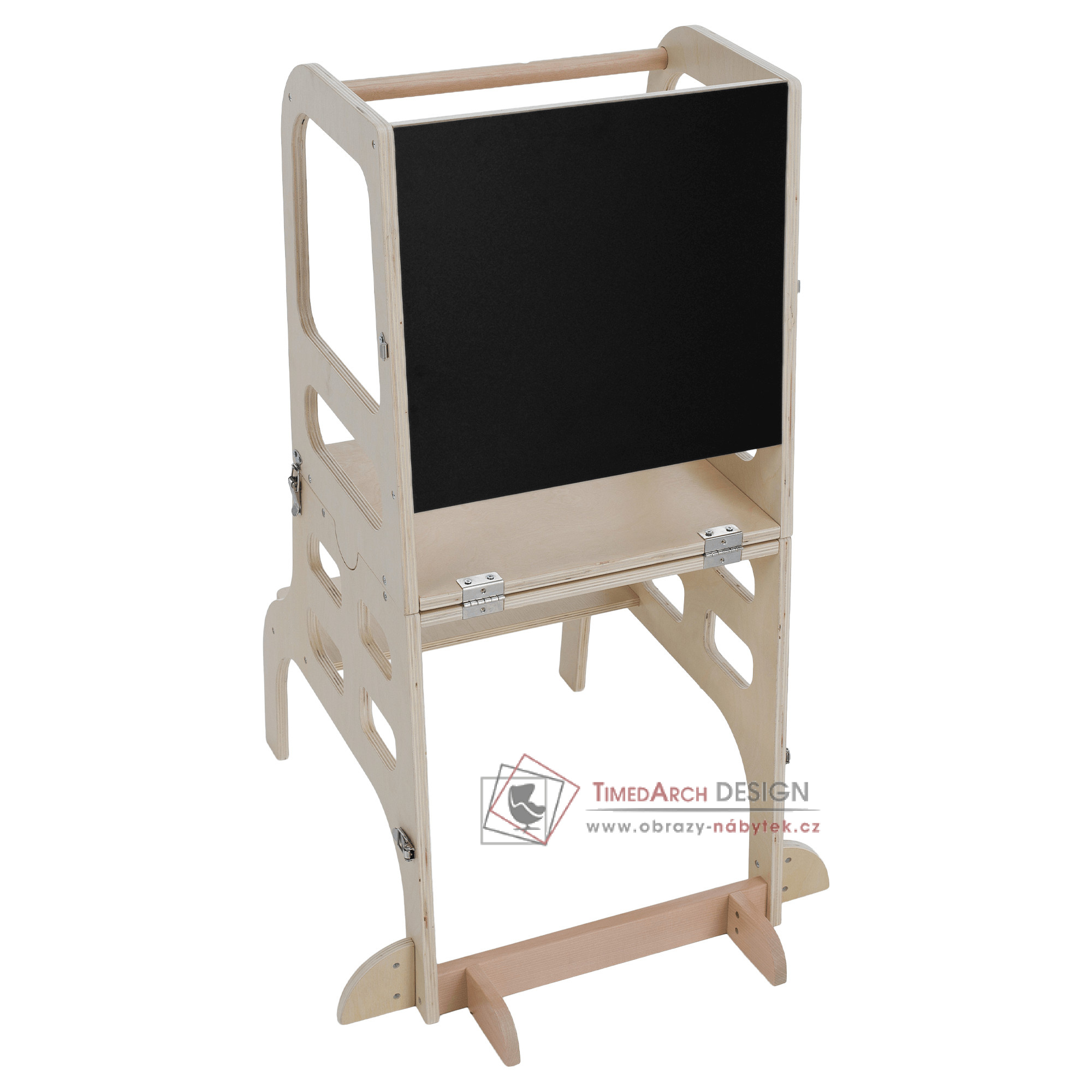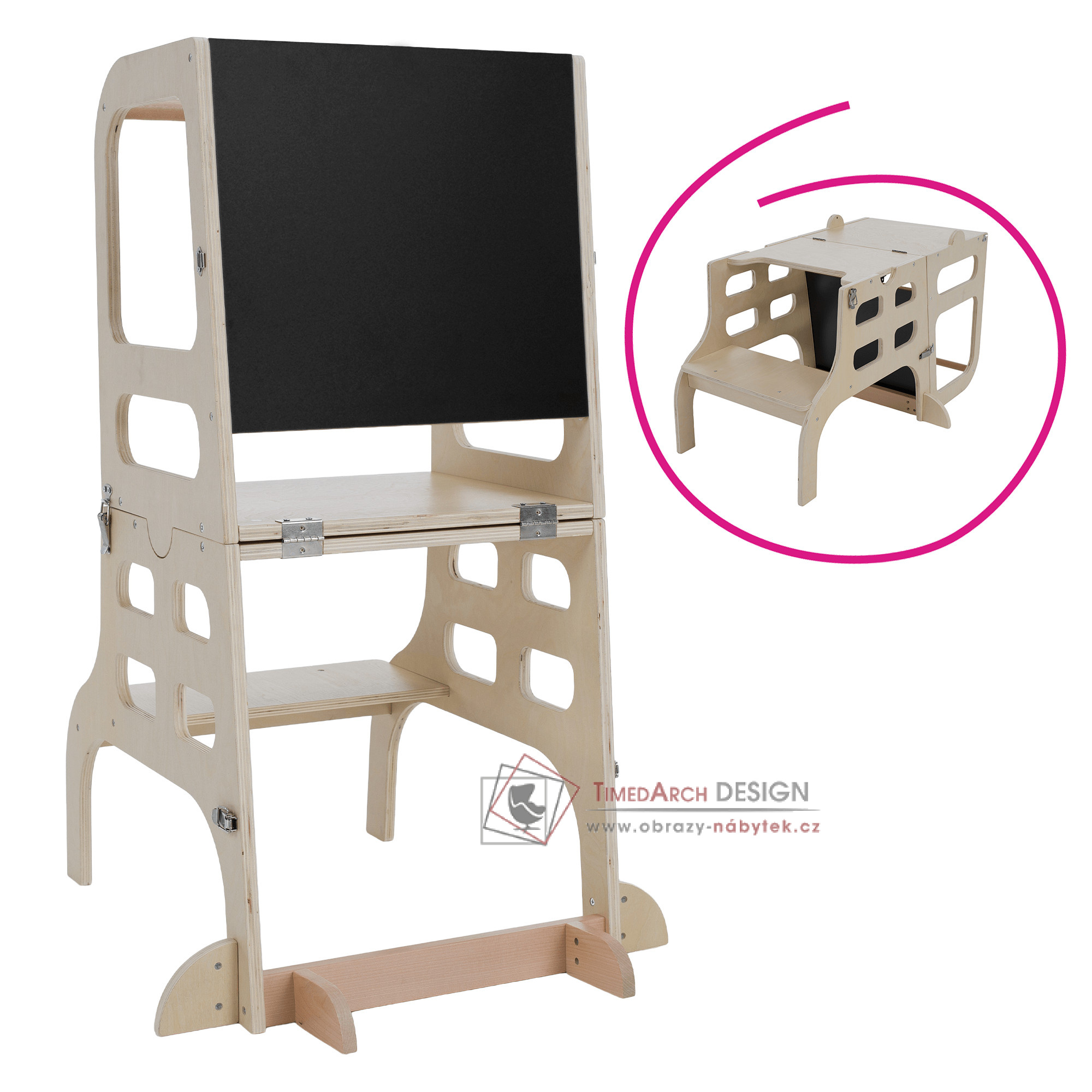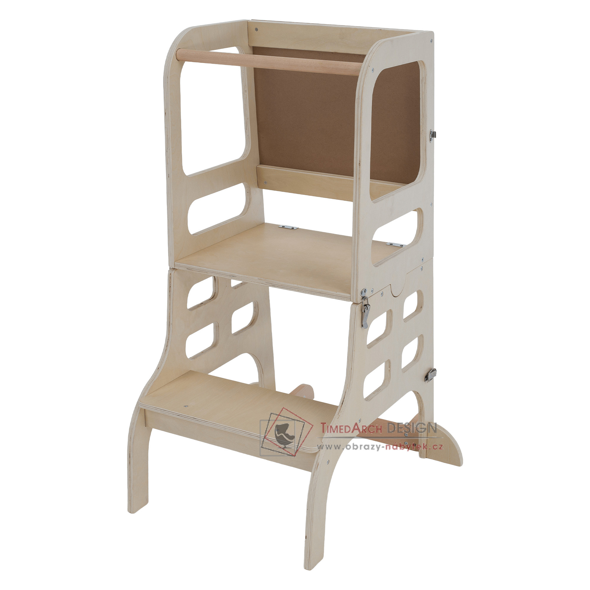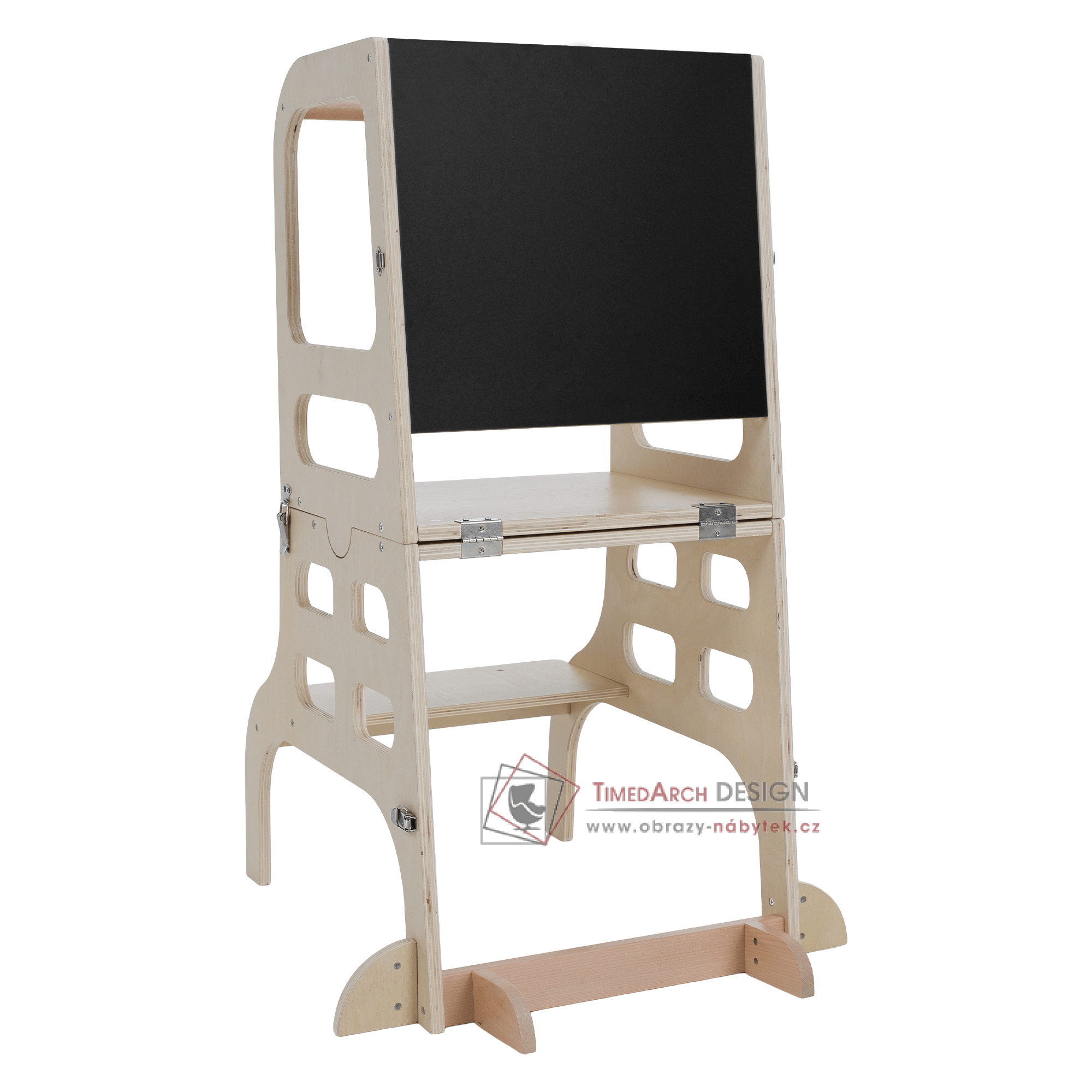 Je to hravý společník, který roste spolu s vaším dítětem a přirozeně se přizpůsobuje jeho potřebám. V jednu chvíli slouží jako bezpečná učící věž, v další se díky promyšlené konstrukci bez použití nářadí změní na stolek s židlí nebo tabuli na kreslení. Stačí jednoduše odemknout sponu, otočit a opět zajistit, abyste vytvořili nový prostor pro tvořivost, učení nebo společné chvíle. Zaoblené hrany chrání malé rukojeti, zatímco kvalitní kombinace masivního borovicového dřeva a překližky zaručuje stabilitu a dlouhou životnost. V přírodním provedení se dokonale hodí do každé domácnosti, kde rodiče chtějí svým dětem dopřát nejen funkční, ale také esteticky příjemný doplněk. Věž podporuje samostatnost a umožňuje dětem aktivně se zapojit do každodenních rodinných aktivit. Je určena pro děti starší jednoho roku, které již dokážou samostatně stát. Splňuje všechny bezpečnostní normy EN 14988:2017 + A1:2020. Věž MAGAN se může stát oblíbenou součástí vašeho domova.