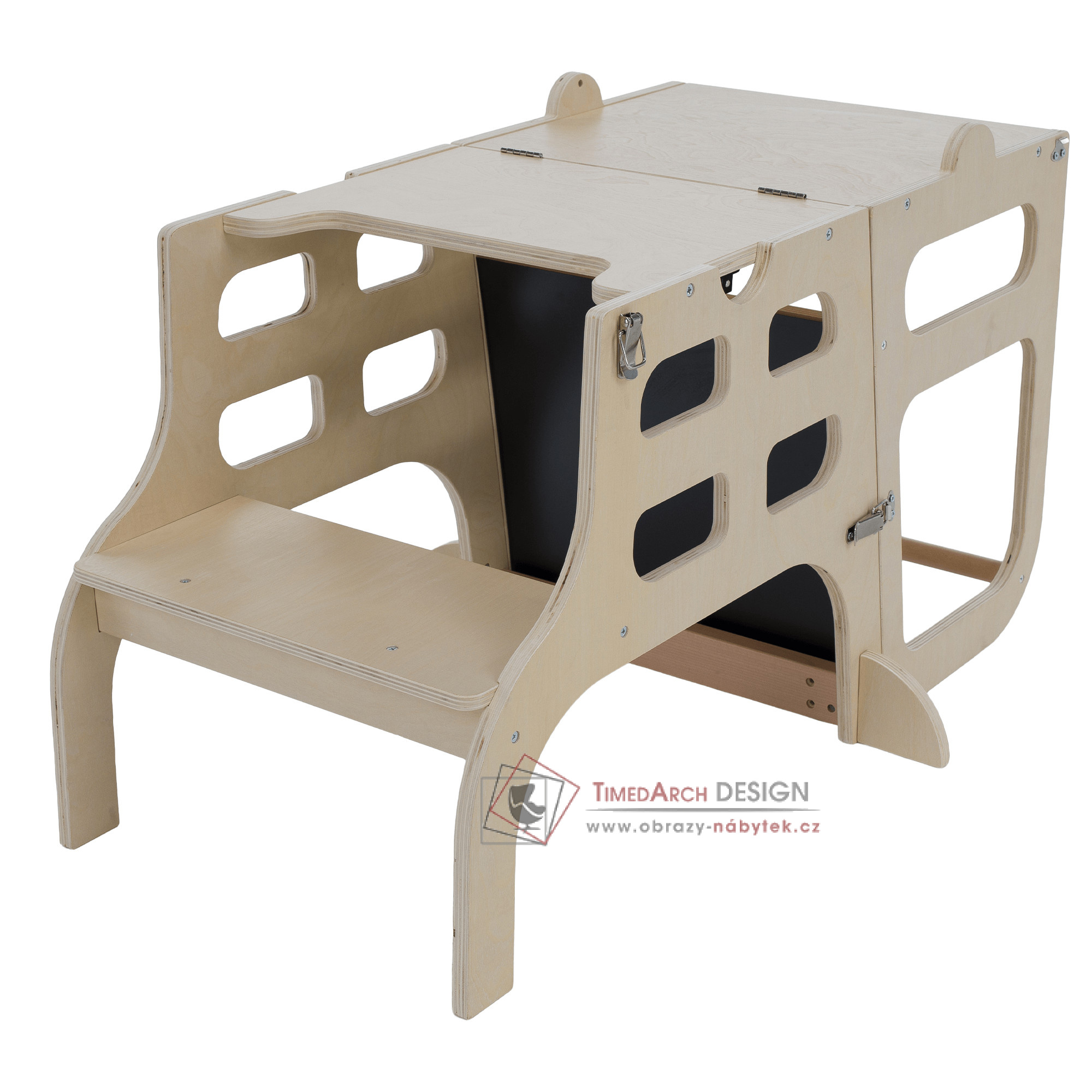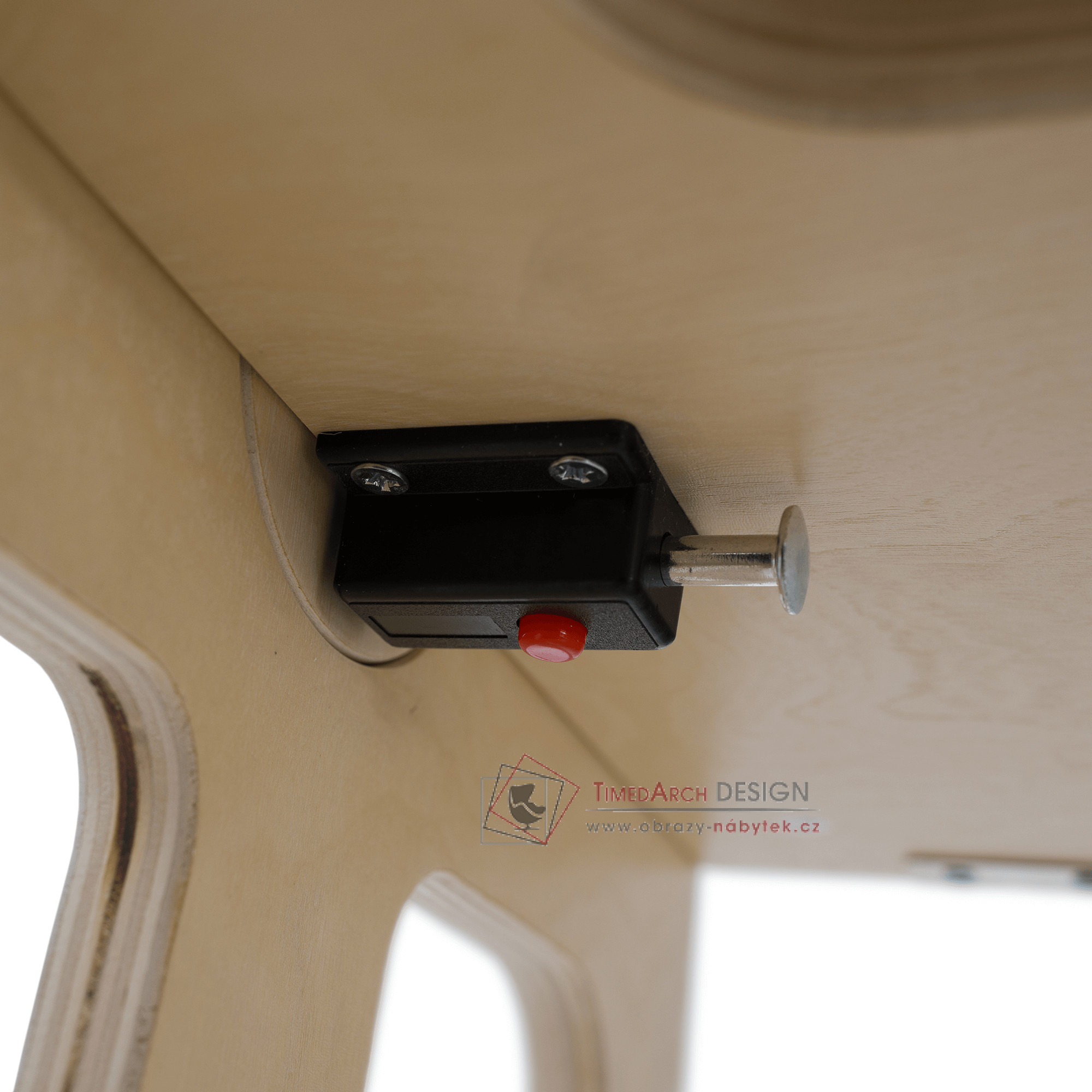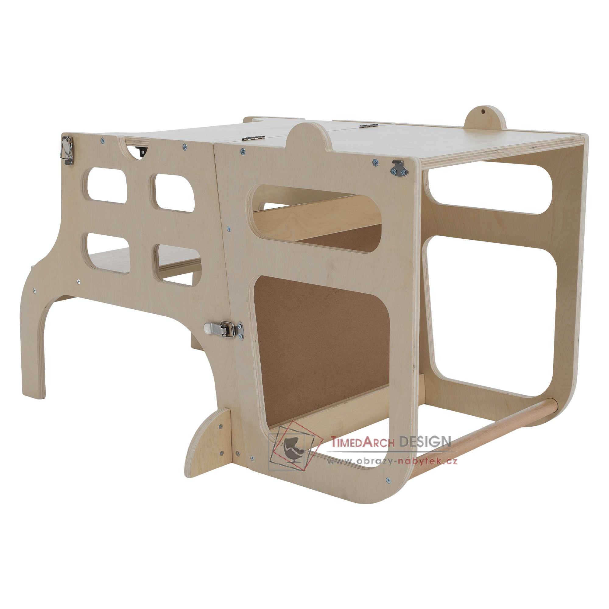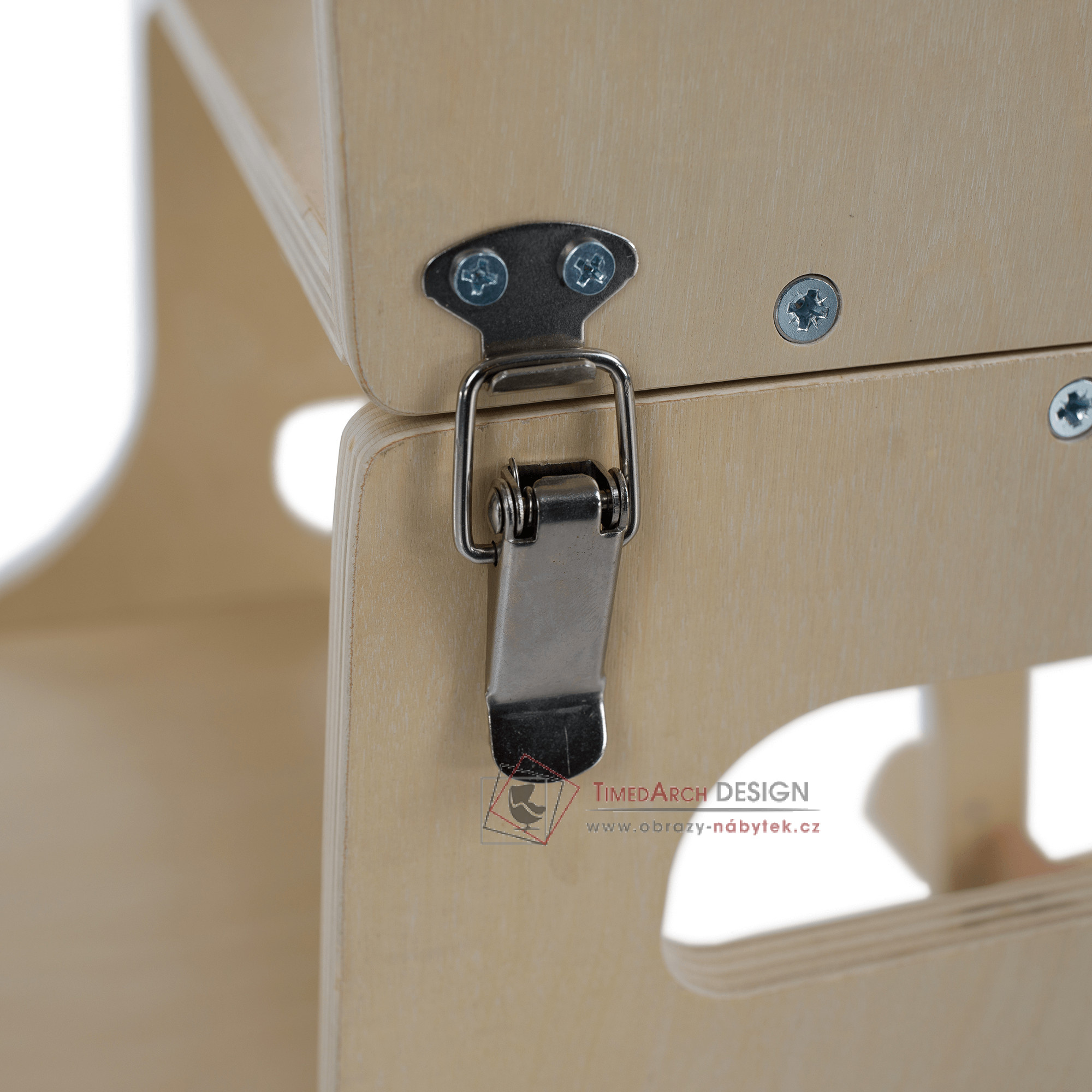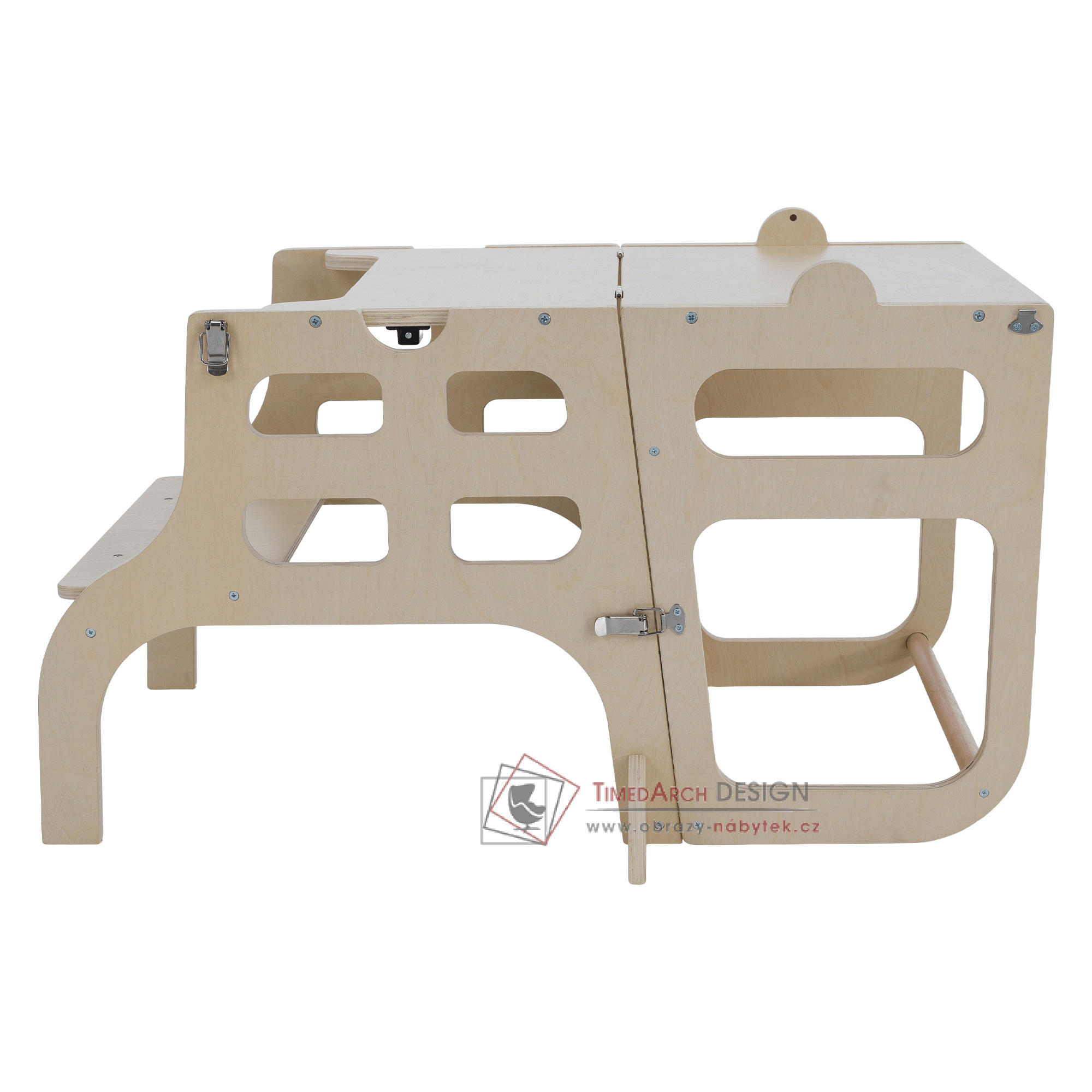 Je to hravý společník, který roste spolu s vaším dítětem a přirozeně se přizpůsobuje jeho potřebám. V jednu chvíli slouží jako bezpečná učící věž, v další se díky promyšlené konstrukci bez použití nářadí změní na stolek s židlí nebo tabuli na kreslení. Stačí jednoduše odemknout sponu, otočit a opět zajistit, abyste vytvořili nový prostor pro tvořivost, učení nebo společné chvíle. Zaoblené hrany chrání malé rukojeti, zatímco kvalitní kombinace masivního borovicového dřeva a překližky zaručuje stabilitu a dlouhou životnost. V přírodním provedení se dokonale hodí do každé domácnosti, kde rodiče chtějí svým dětem dopřát nejen funkční, ale také esteticky příjemný doplněk. Věž podporuje samostatnost a umožňuje dětem aktivně se zapojit do každodenních rodinných aktivit. Je určena pro děti starší jednoho roku, které již dokážou samostatně stát. Splňuje všechny bezpečnostní normy EN 14988:2017 + A1:2020. Věž MAGAN se může stát oblíbenou součástí vašeho domova.