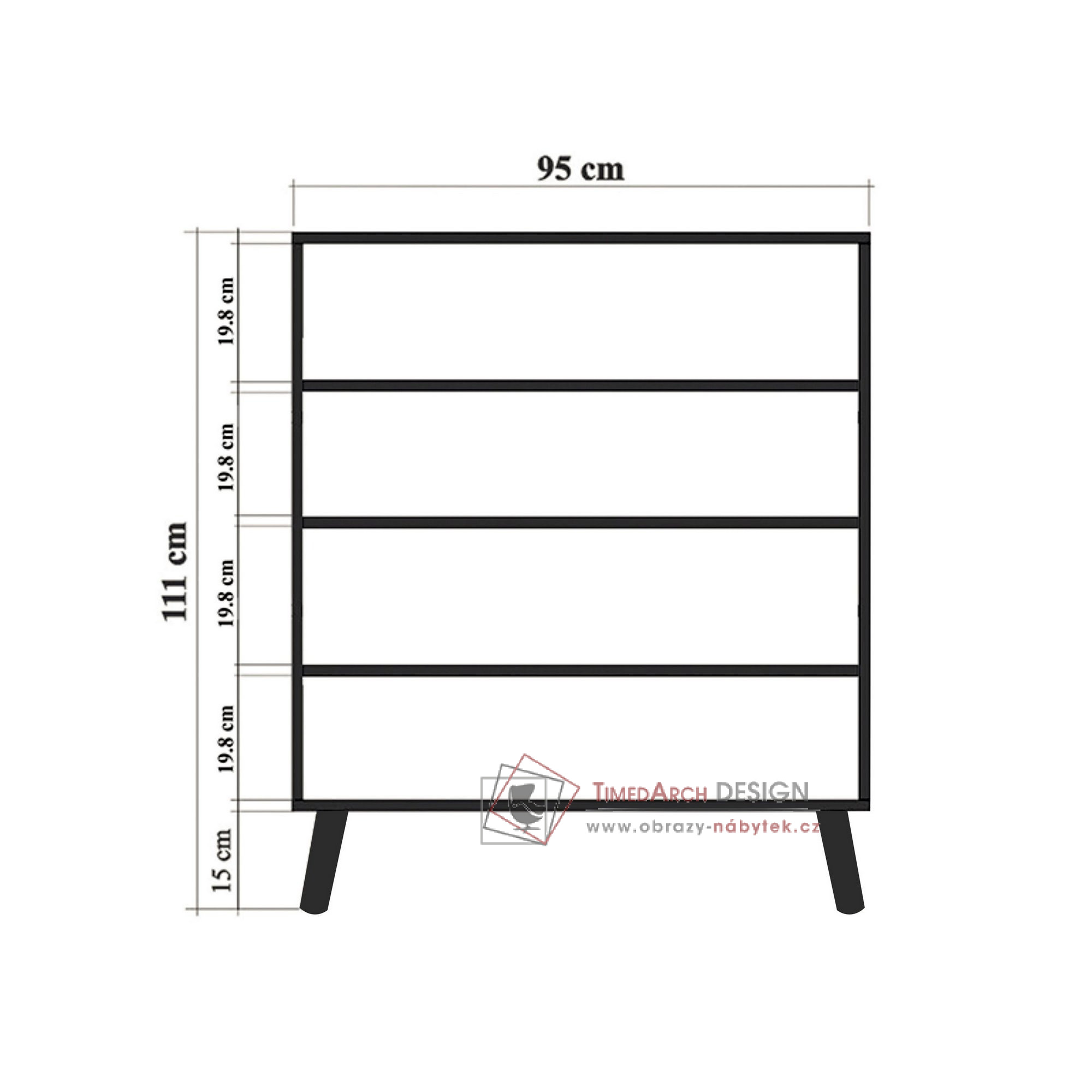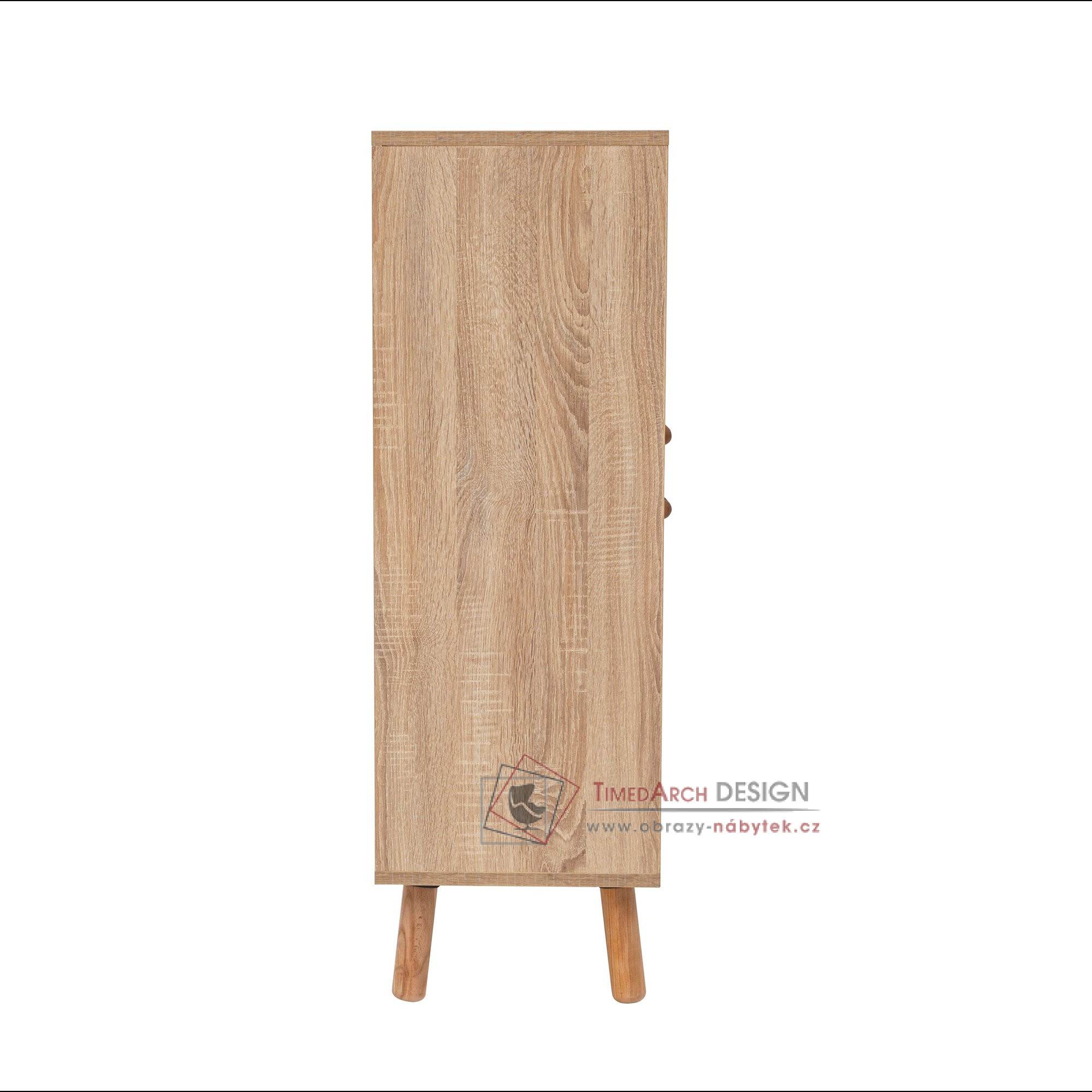 Tato komoda je vyrobena ze 100% dřevotřísky s melaminovým povlakem a je navržena tak, aby vydržela. Tloušťka 18 mm zajišťuje robustnost a stabilitu, zatímco dřevěné nohy dodávají nádech sofistikovanosti. UV lak nejen umocňuje krásu skříňky, ale také ji chrání před poškrábáním a vyblednutím.
