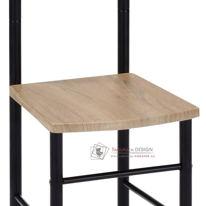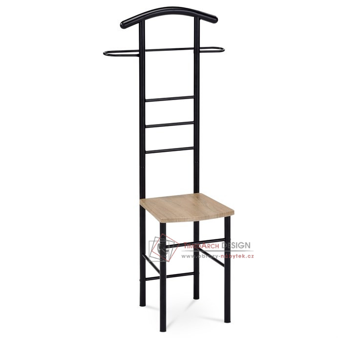 Kostra je z kovových trubek lakované černou matnou práškovou barvou. Výška 119 cm Vám umožní zavěšení oblečení i doplňků zcela bez pomačkání. Nosnost stojanu je až 90 kg, což umožňuje stojan používat i jako plnohodnotnou židli pro nečekané návštěvy. Sedák je z MDF v 3D dekoru dub sonoma. Nohy konstrukce jsou zakončeny plastovými kluzáky, eliminující poškození podlahy. Horní zaoblená trubka je zakončena dekorativními černými půlkulatými záslepkami.