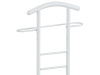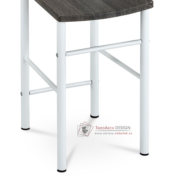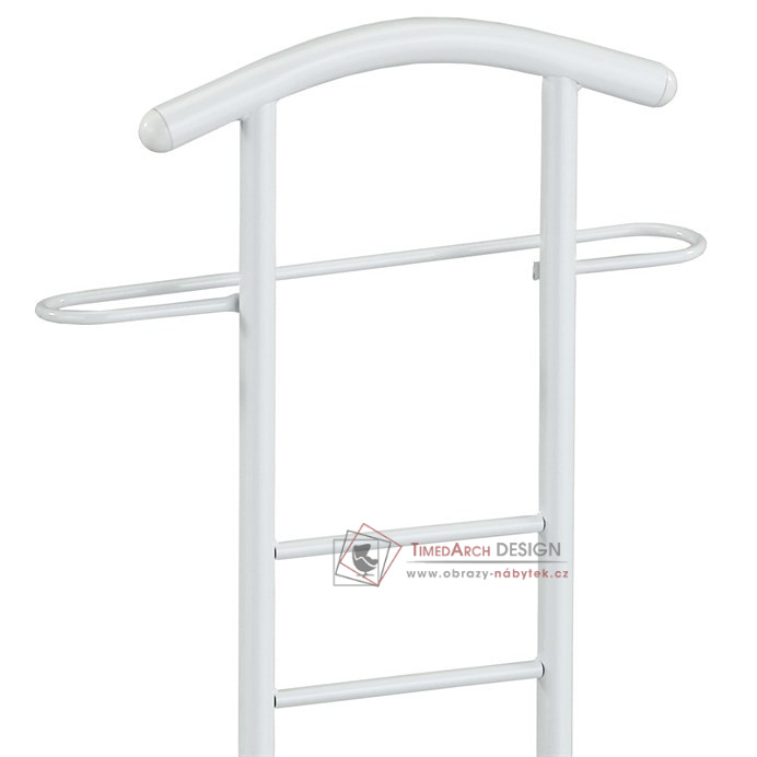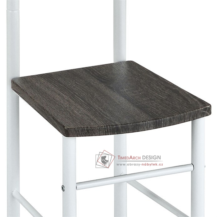 Kostra je z kovových trubek lakované bílou matnou práškovou barvou. Výška 119 cm Vám umožní zavěšení oblečení i doplňků zcela bez pomačkání. Nosnost stojanu je až 90 kg, což umožňuje stojan používat i jako plnohodnotnou židli pro nečekané návštevy. Sedák je z MDF v 3D dekoru černý dub. Nohy konstrukce jsou zakončeny plastovými kluzáky, eliminující poškození podlahy. Horní zaoblená trubka je zakončena dekorativními bílými půlkulatými záslepkami.