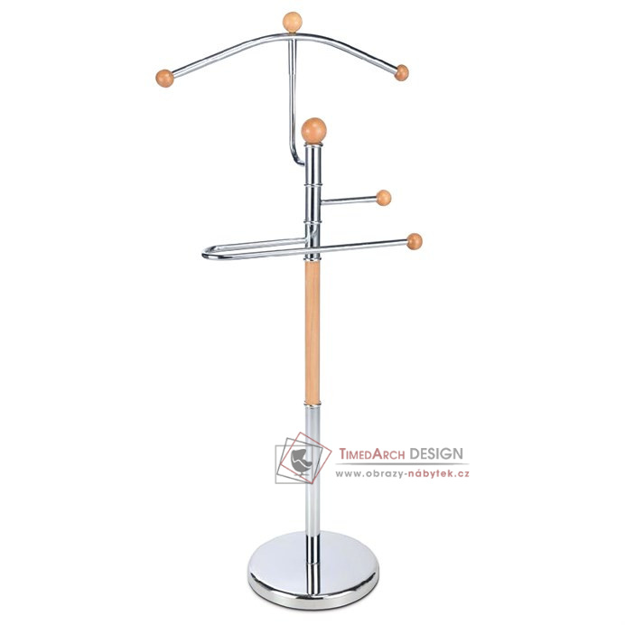 Konstrukce je kombinací kovových trubek s kovovou podestou a masivního dřeva. Povrchová úprava je v lesklém chromu a přírodního odstínu kaučukovníkového masivu. Výška 112 cm Vám umožní zavěšení oblečení i doplňků bez pomačkání. Nosnost stojanu je až 5 kg, hmotnost necelých 5 kg. Proto je jednoduše přenositelný a lze ho umístit podle momentální potřeby i nálady. Stylem a jednoduchostí se hodí do jakéhokoli interiéru. Využití je nepřeberné, záleží jen na Vás.