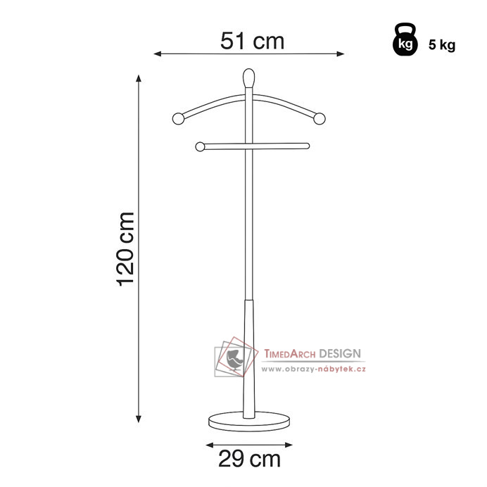 Tento model je v celočerném provedení. Výška 120 cm Vám umožní zavěšení oblečení i doplňků zcela bez pomačkání. Nosnost stojanu je až 5 kg rovnoměrně rozprostřené zátěže, hmotnost 5 kg. Konstrukce je zakončena kovovou chromovanou podestou se zátěží v černém plastovém pouzdře. Stojan je jednoduše přenositelný a lze ho umístit podle momentální potřeby i nálady. Stylem a jednoduchostí se hodí do jakéhokoli interiéru. Využití je nepřeberné, záleží jen na Vás.
