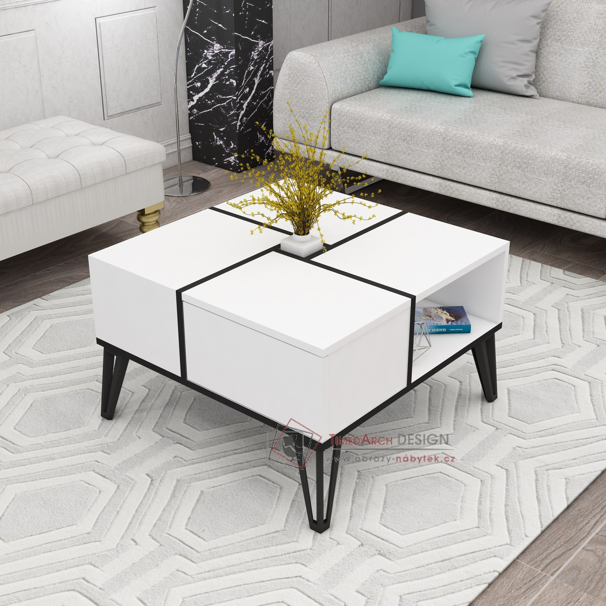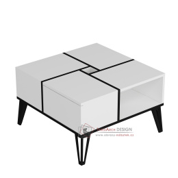 Kombinace bílé a černé barvy vytváří nadčasový a elegantní vzhled, který se bez problémů hodí k jakémukoli stávajícímu nábytku a dekoraci. Čisté linie a minimalistický design tohoto konferenčního stolku z něj činí všestranný kus nábytku, který doplní různé styly interiéru, od moderního až po tradiční.