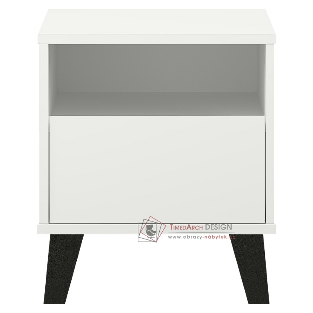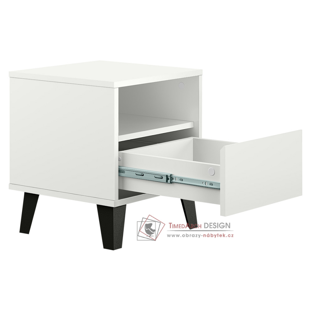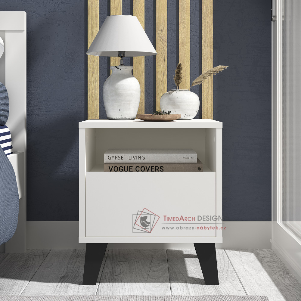 Tvoří nedílnou součást téměř každé postele. Vhodný do ložnice, dětského nebo studentského pokoje. Vyroben v nadčasovém designu z laminované dřevotřísky v bílém provedení. Noční stolek BOGAN NEW 1S nabízí úložný prostor v podobě jednoho šuplíku a otevřeného úložného prostoru. Na stylovém vzhledu se podepisují černé nožičky.