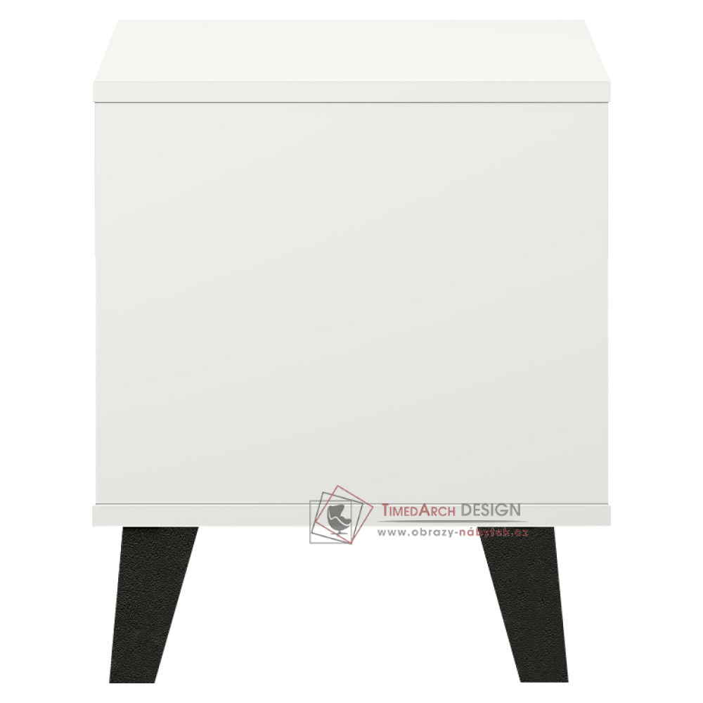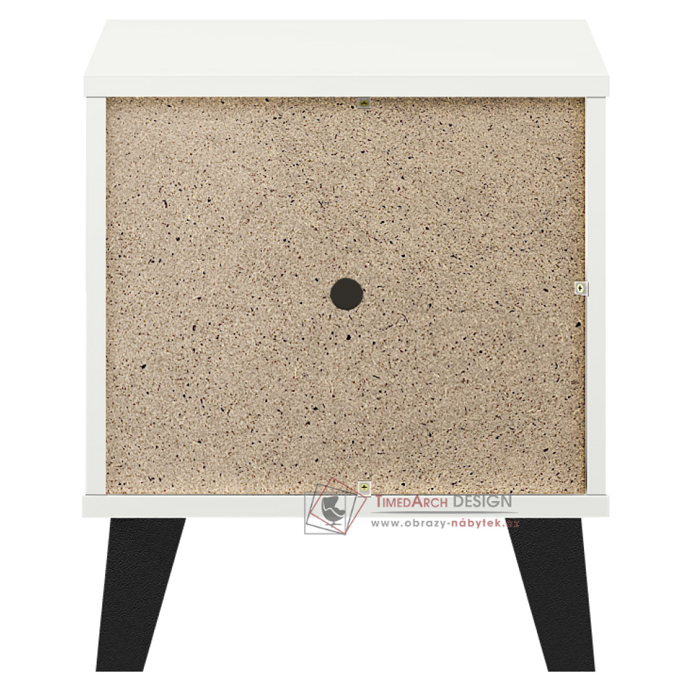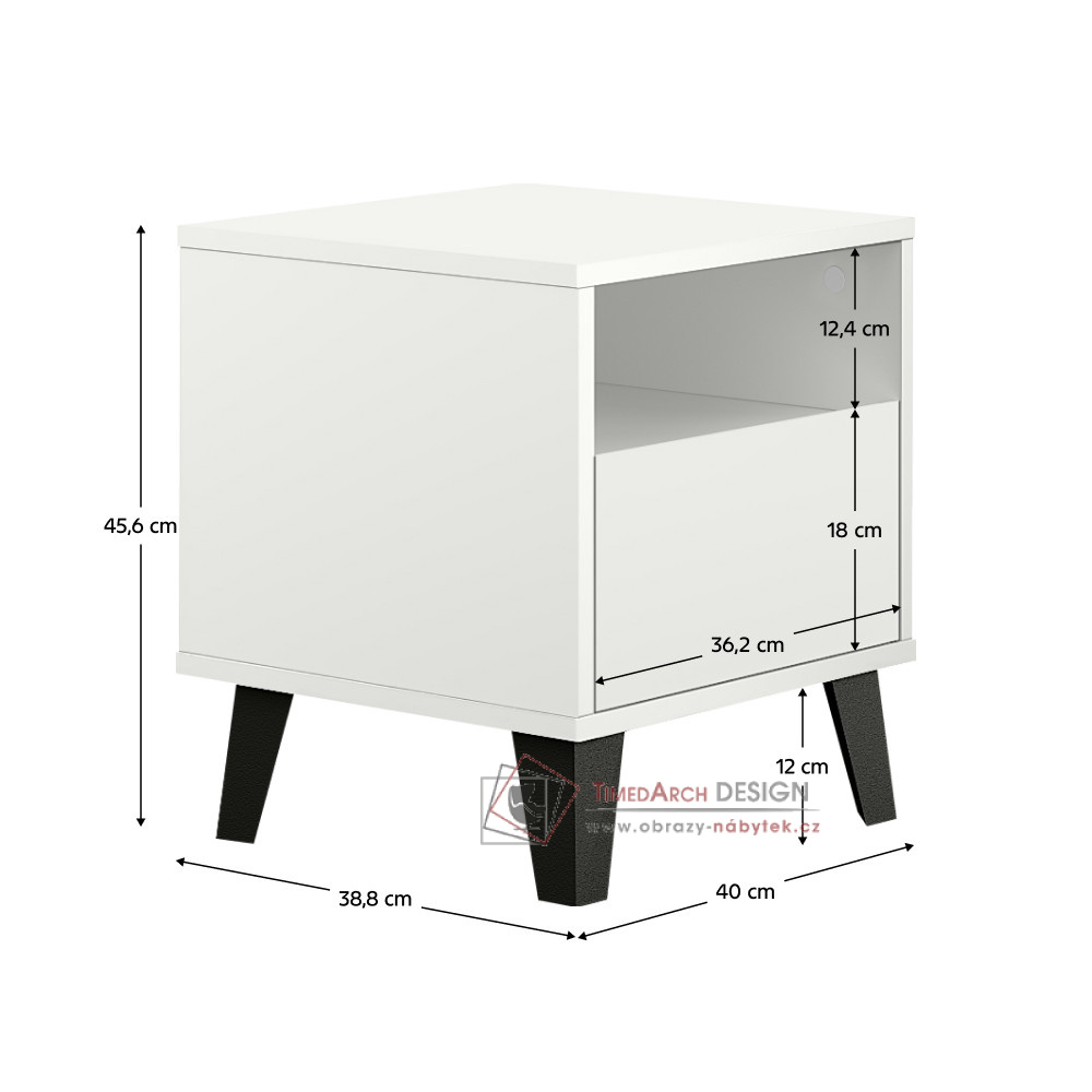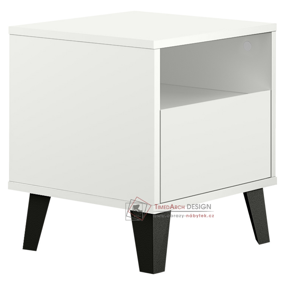 Tvoří nedílnou součást téměř každé postele. Vhodný do ložnice, dětského nebo studentského pokoje. Vyroben v nadčasovém designu z laminované dřevotřísky v bílém provedení. Noční stolek BOGAN NEW 1S nabízí úložný prostor v podobě jednoho šuplíku a otevřeného úložného prostoru. Na stylovém vzhledu se podepisují černé nožičky.