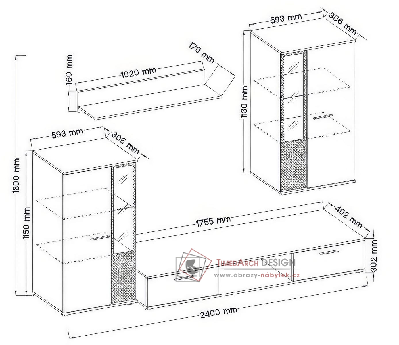 Sestava se skládá z vitríny, televizního stolku, závěsné vitríny a police.