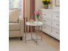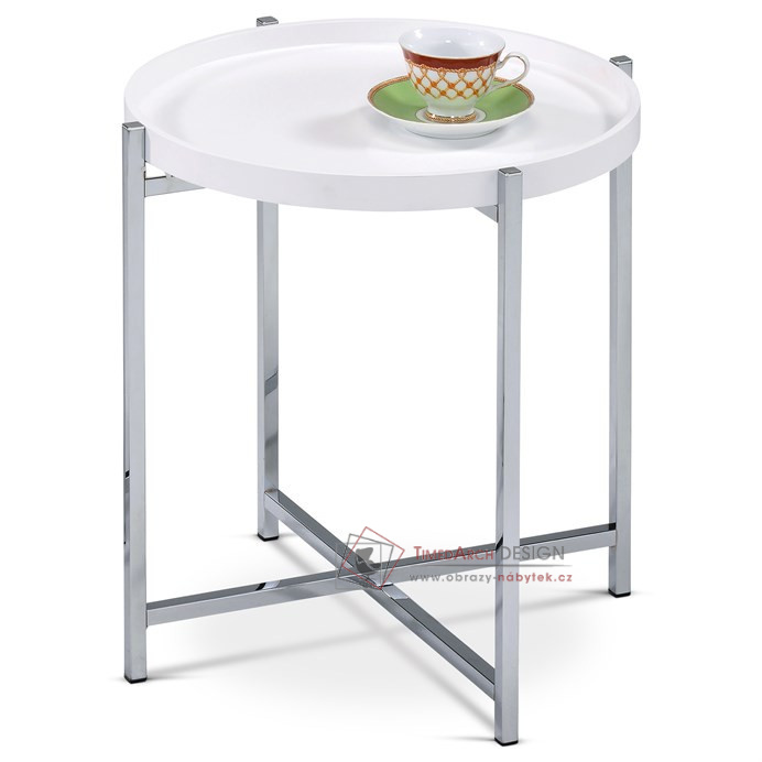 Konstrukce v sobě spojuje vyjímatelný dřevěný tác z bukové překližky, v bílé matné a subtilní podnoží zhotovené z kovových profilů čtvercového průřezu 1,5 x 1,5 cm v lesklém chromu. Právě tato podnož zajišťuje vysokou a dokonalou stabilitu celého stolku i při úplném naplnění tácu, který disponuje velkým vnitřním průměrem 44 cm a hloubkou 2 cm. Vnější průměr je 46 cm a hloubka 3 cm. Přesto stolek působí velmi odlehčeně a subtilně. Své místo najde nejen v seversky laděných interiérech, ale stejně skvěle bude působit i v interiérech zařízených v jiných stylech. Všude bude tvořit nejen líbivý bytový doplněk, ale hlavně bude skvělý pomocník, ať si na něj odložíte pouze šálek s kávou či jen křupavé občerstvení k televizi, nebo ho použijete jako součást baru s vyskládanými lahvemi, případně i jako luxusní květinový stolek. Jeho využití je opravdu nepřeberné, závisí jen na vaší fantazii, zda ho chcete mít jako součást obýváku, chodby, haly či ložnice. Údržba je velice jednoduchá. Kovové části stačí otřít vlhkým hadříkem. Dřevěný tác vyjmeme a nečistoty z něj vyklepeme nebo použijeme vysavač a také otřeme vlhkým hadříkem. Přeleštíme suchým hadříkem či papírovou utěrkou a tím je stolek opět čistý a jako nový. Montáž je velice jednoduchá, zvládne s naprostým přehledem středně zručný člověk. Nosnost stolku je do max. 10 kg rovnoměrně rozprostřené zátěže. Průměr stolku je 50 cm, výška 50 cm.