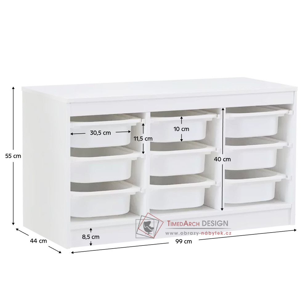 Regál je třípatrový. Vyroben je z kvalitní MDF v neutrální bílé barvě. Jeho součástí jsou bílé plastové boxy, které působí minimalisticky a elegantně. TRIMAL je vhodný pro organizaci různých drobností, hraček, kancelářských či osobních věcí v domácnosti nebo kanceláři.