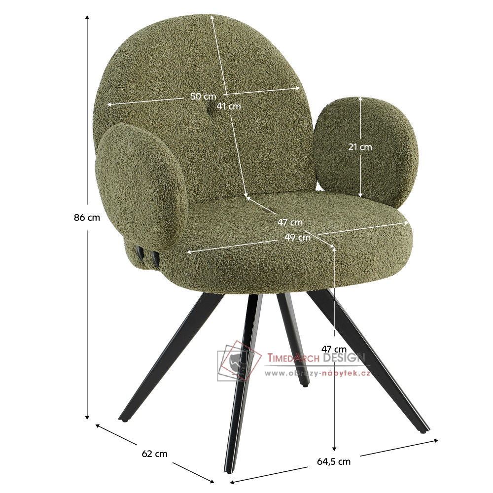 Čalouněná je látkou Bouclé v elegantním zeleném odstínu, který vnese do vašeho interiéru nádech přírody a harmonie. Černé kovové nohy vytvářejí poutavý kontrast se zeleným potahem a dodávají židli moderní vzhled. Otočný mechanismus zajišťuje maximální flexibilitu, ať už při práci, relaxaci nebo setkáních s přáteli. VASALA spojuje nadčasový styl s praktičností, skvěle se hodí do obývacího pokoje, pracovny nebo domácí kanceláře. Dopřejte si pohodlí a jedinečný šarm s touto otočnou židlí, která okamžitě přitáhne pozornost!