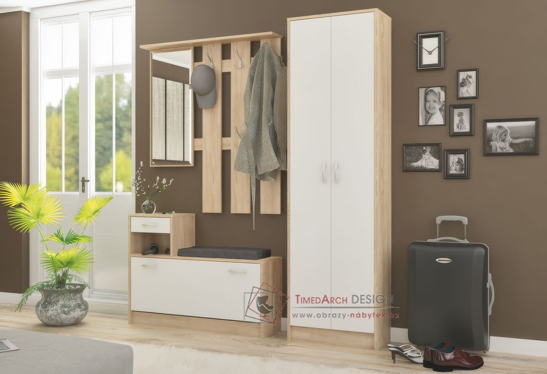 Moderní předsíňová stěna se zrcadlem ORION je vyrobená z kvalitní laminované DTD v barevné kombinaci dub sonoma / bílý mat.