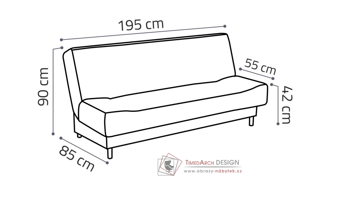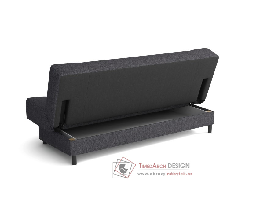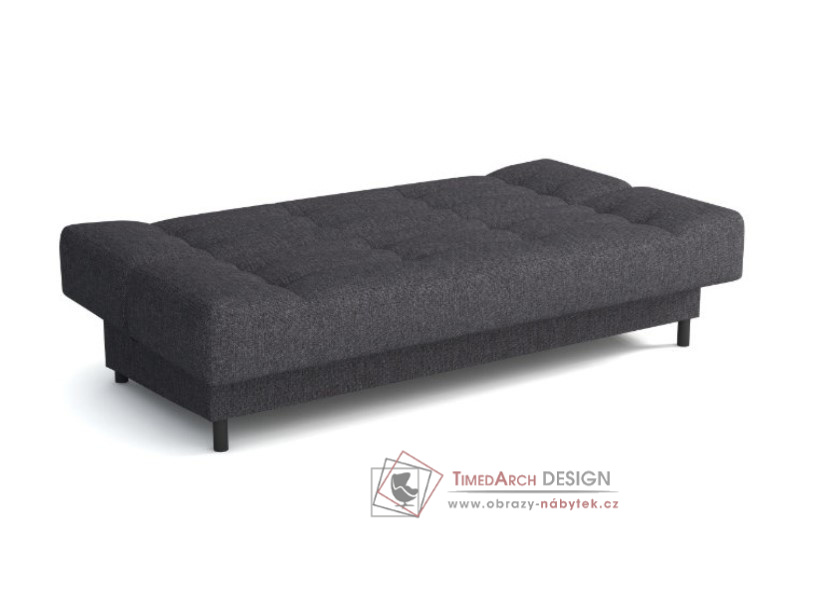 Je vyrobená v jednoduchém nadčasovém designu, který se hodí do každého inferiéru. Umístit ji můžete do obývacího pokoje, ale je také vhodná např. do studentského pokoje, pracovny, nebo hostinského pokoje. Pohovka je rozkládací a samozřejmostí je i nepostradatelný úložný prostor. Jednoduchým rozložením pomocí systému klik-klak vznikne lůžko k občasnému přespání. Z důvodu tohoto rozkladu je pohovka vzadu očalouněna pouze do krycí čalounické látky. Vybrat si můžete z několika trendy odstínů. Vyobrazené doplňky a dekorace nejsou v ceně.