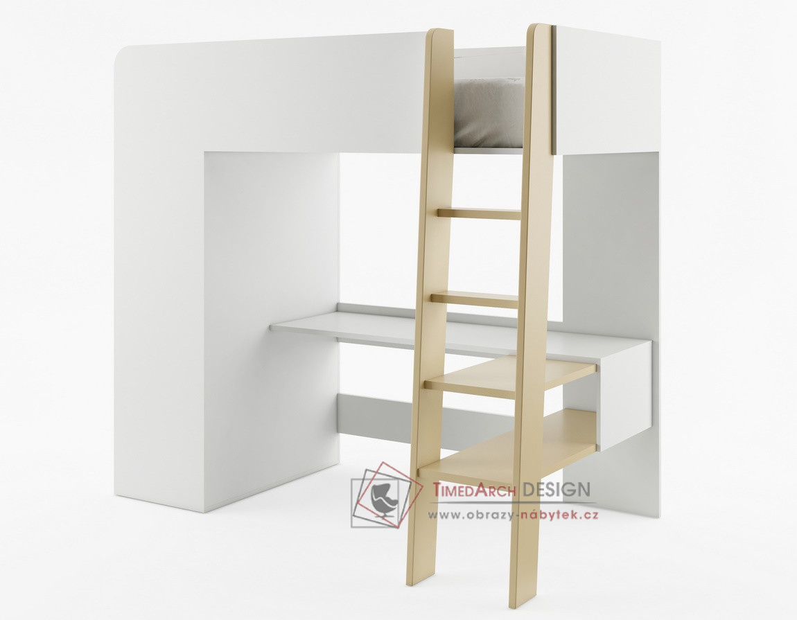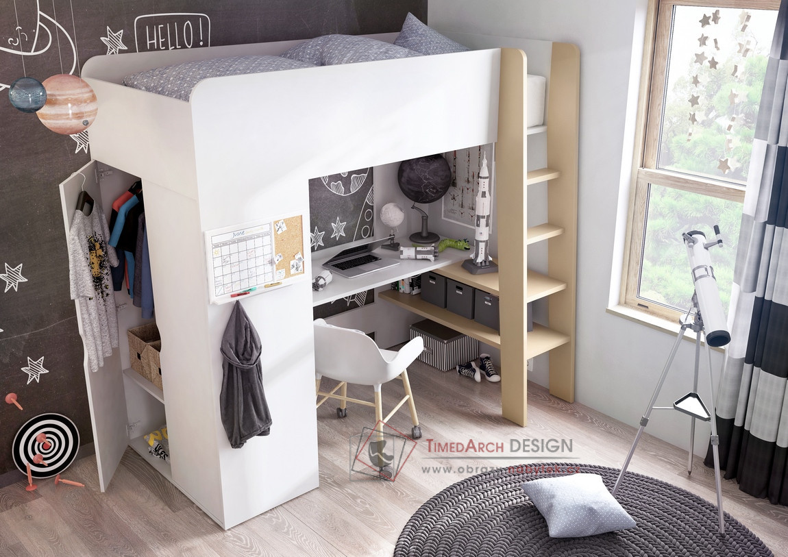Poschoďová postel s matrací, skříní a psacím stolem TOM 01 je vyrobená z laminované DTD olepené ABS hranou v kombinaci barevného provedení bílá / congo.
