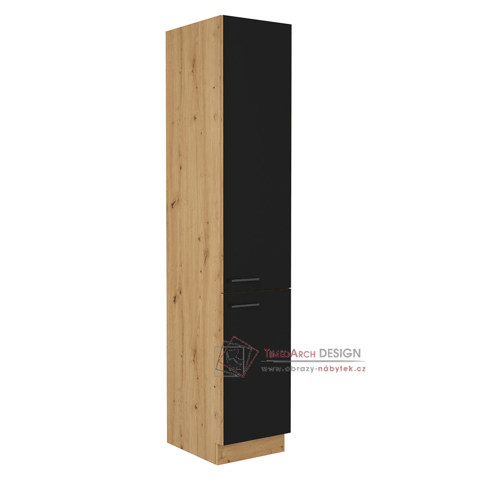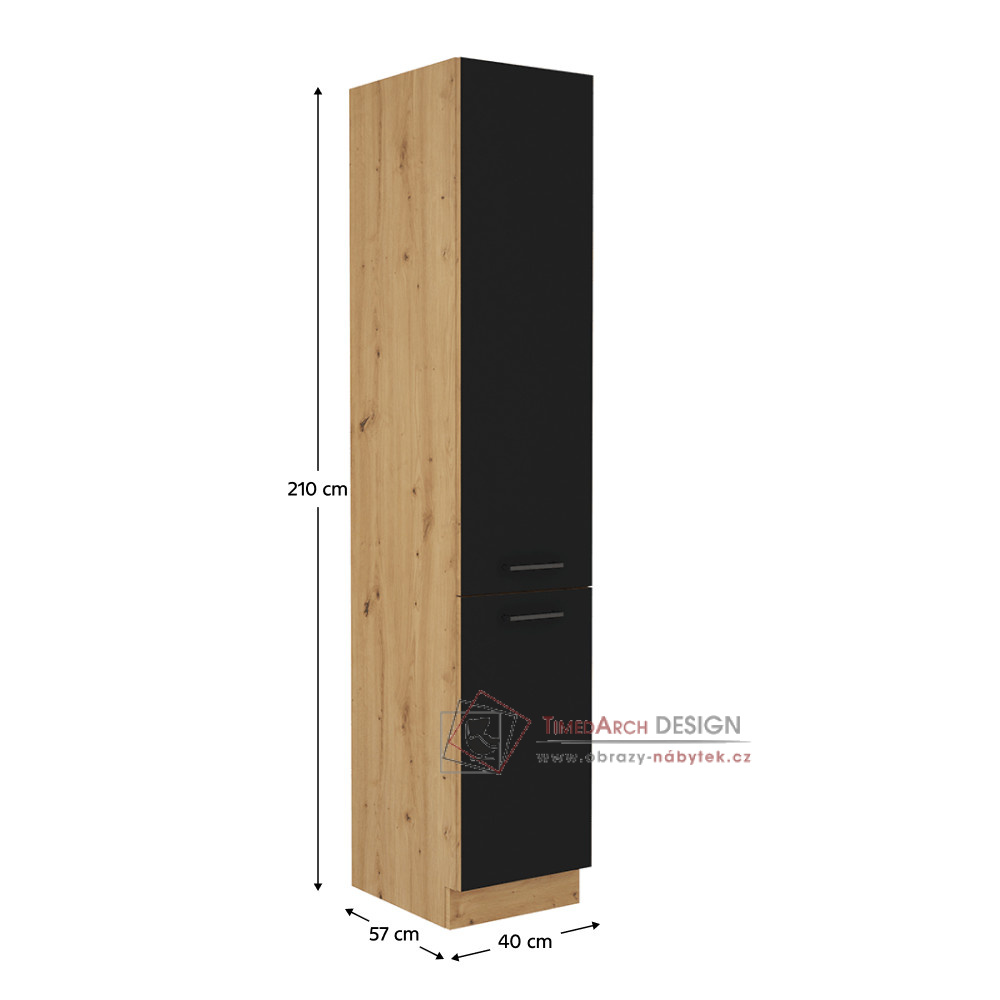 Vysoká potravinová skříň Monrovia 40 DK-210 2F je se dvěmi dvířky. Dvířka jsou v provedení černý mat, korpus je v provedení dub artisan. Vnitřek skříně je bílý.