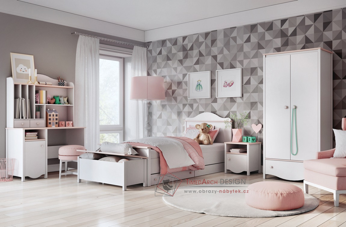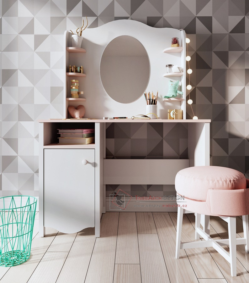 Nábytek je vyrobený z laminované DTD v kombinaci barevného provedení bílá / růžová. Hrany jsou olepené ABS páskou.