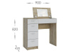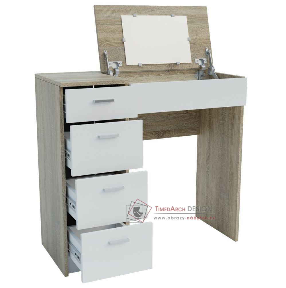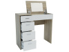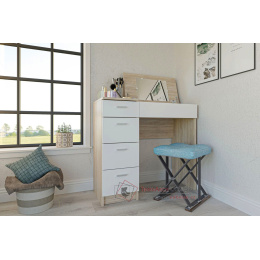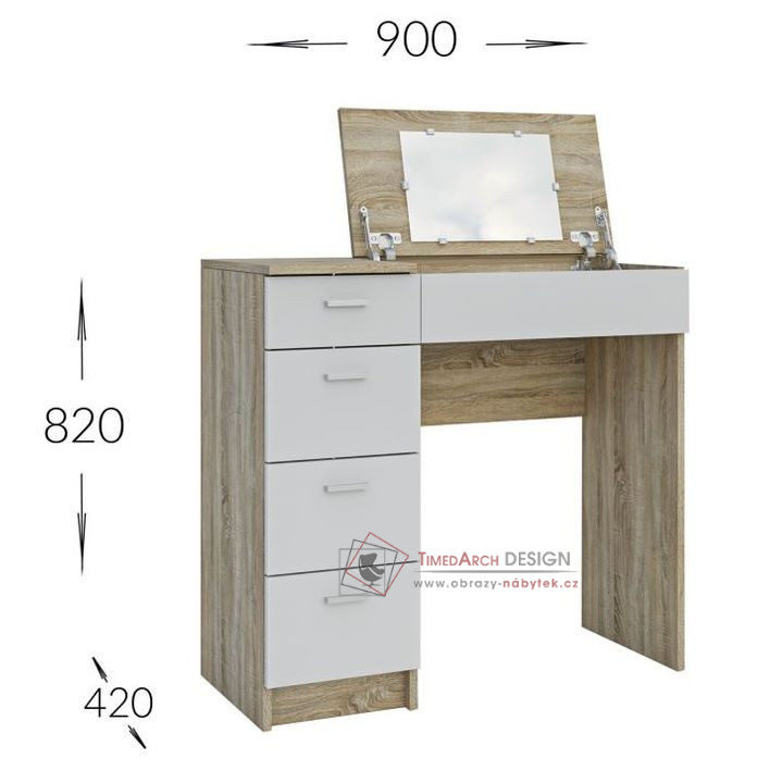 Pod pracovní deskou je umístěn odkládací prostor, do kterého můžete ukládat make-up nebo notebook. Stůl je vybaven čtyřmi praktickými zásuvkami. Korpus i dvířka stolku jsou vyrobeny z laminované DTD v kombinaci barevného provedení dub sonoma / bílá. Zrcadlo je v součástí stolku.